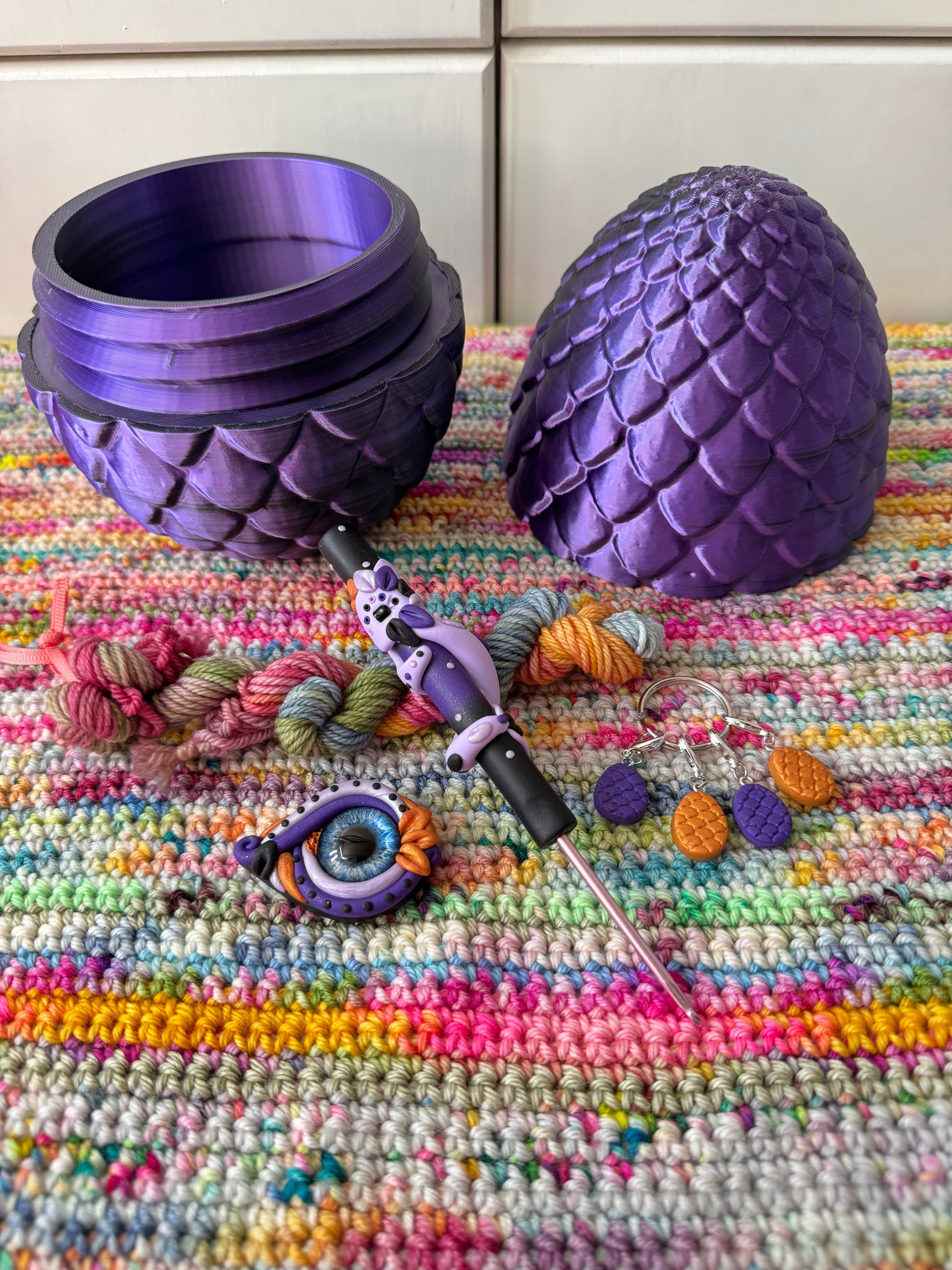 This huge 3D printed dragon surprise egg is full of essential crochet tools! Open (hatch) your egg to reveal a dragon crochet hook, dragon eye magnetic needle minder, 4 dragon egg stitch markers and a 10g skein of hand dyed dk yarn from Sew Happy Creative.