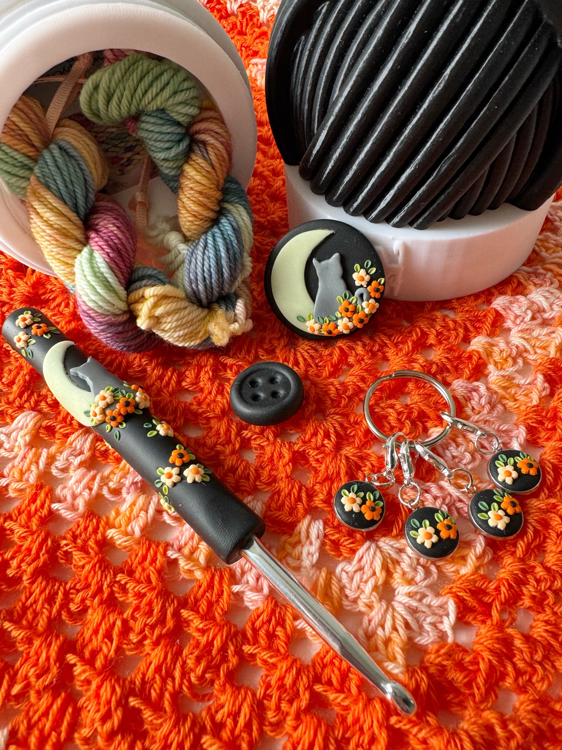 Each one of these gorgeous yarn ball storage pots contains a crochet hook, needle minder, stitch markers and a 10g skein of yarn from Sew Happy Creative. This listing is for a black pot with white trim and the polymer clay goodies have a cute cat and moon theme. The moon is glow in the dark as highlighted by a UV torch in my photos and the crochet hook in this set is size 5.5mm.