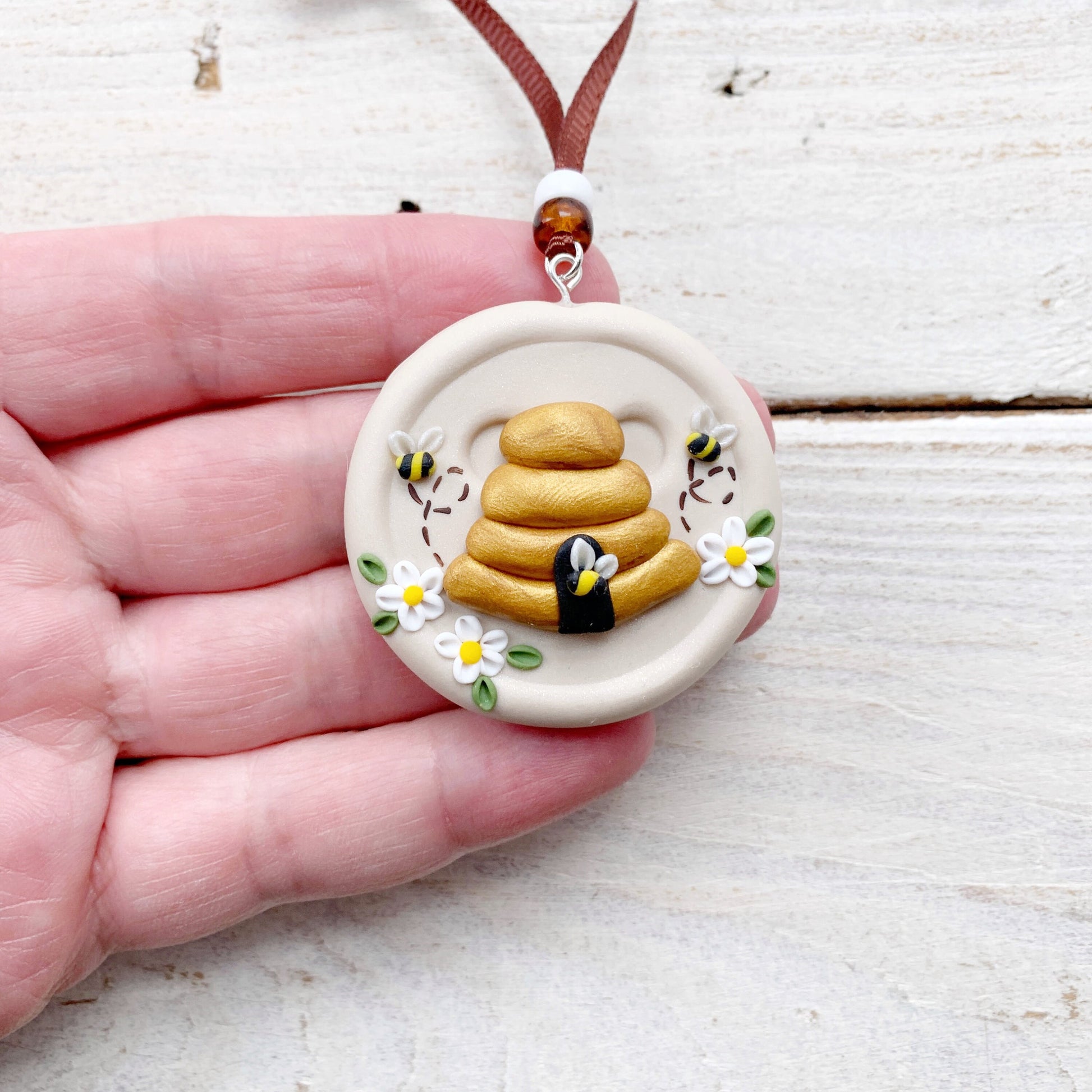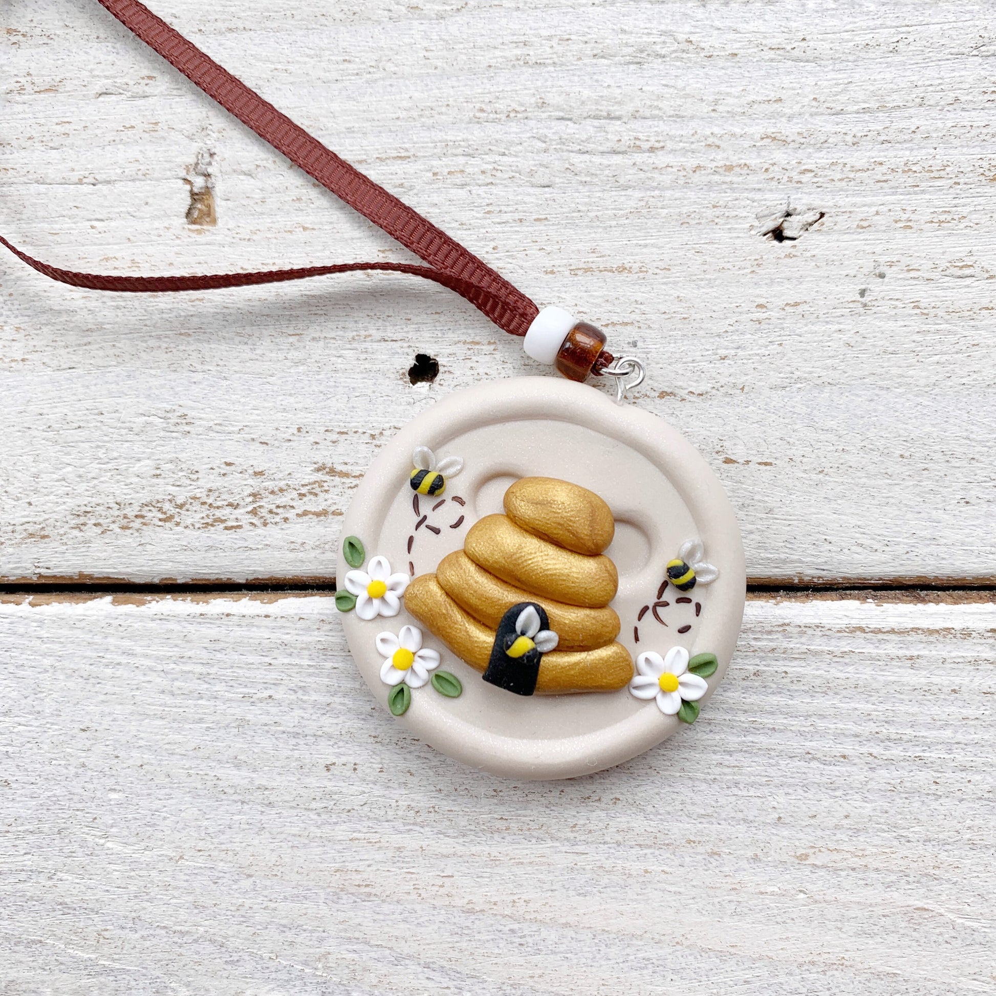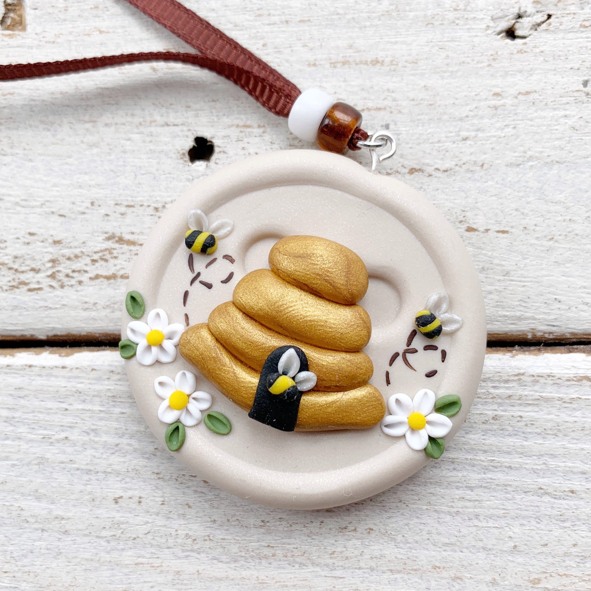 This fob features my 2” button base in a neutral shade. The beehive, tiny bees and flowers are all shaped by hand to make something special that will be a joy to use.