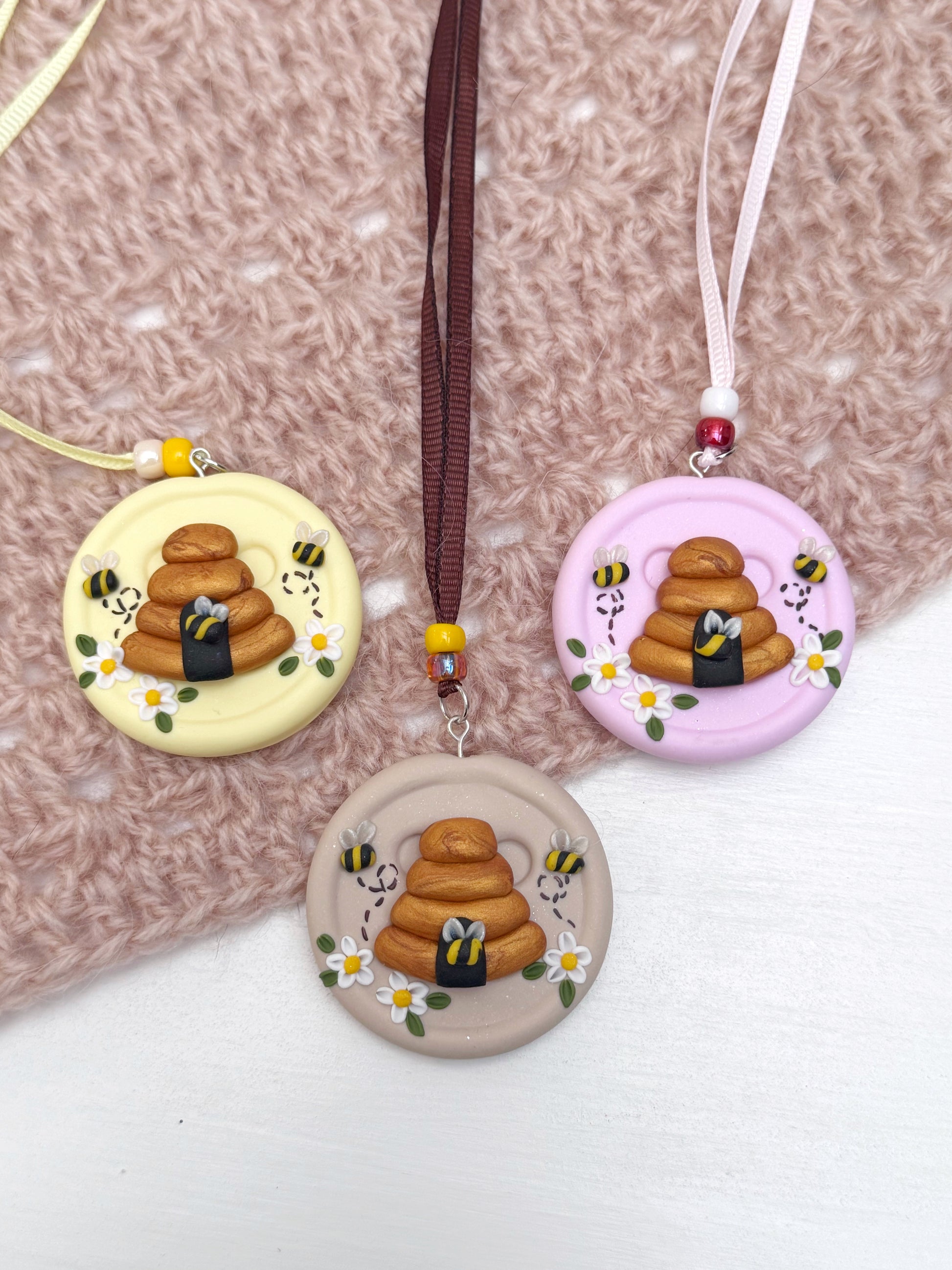 This fob features my 2” button base in a choice of colours. The beehive, tiny bees and flowers are all shaped by hand to make something special that will be a joy to use.