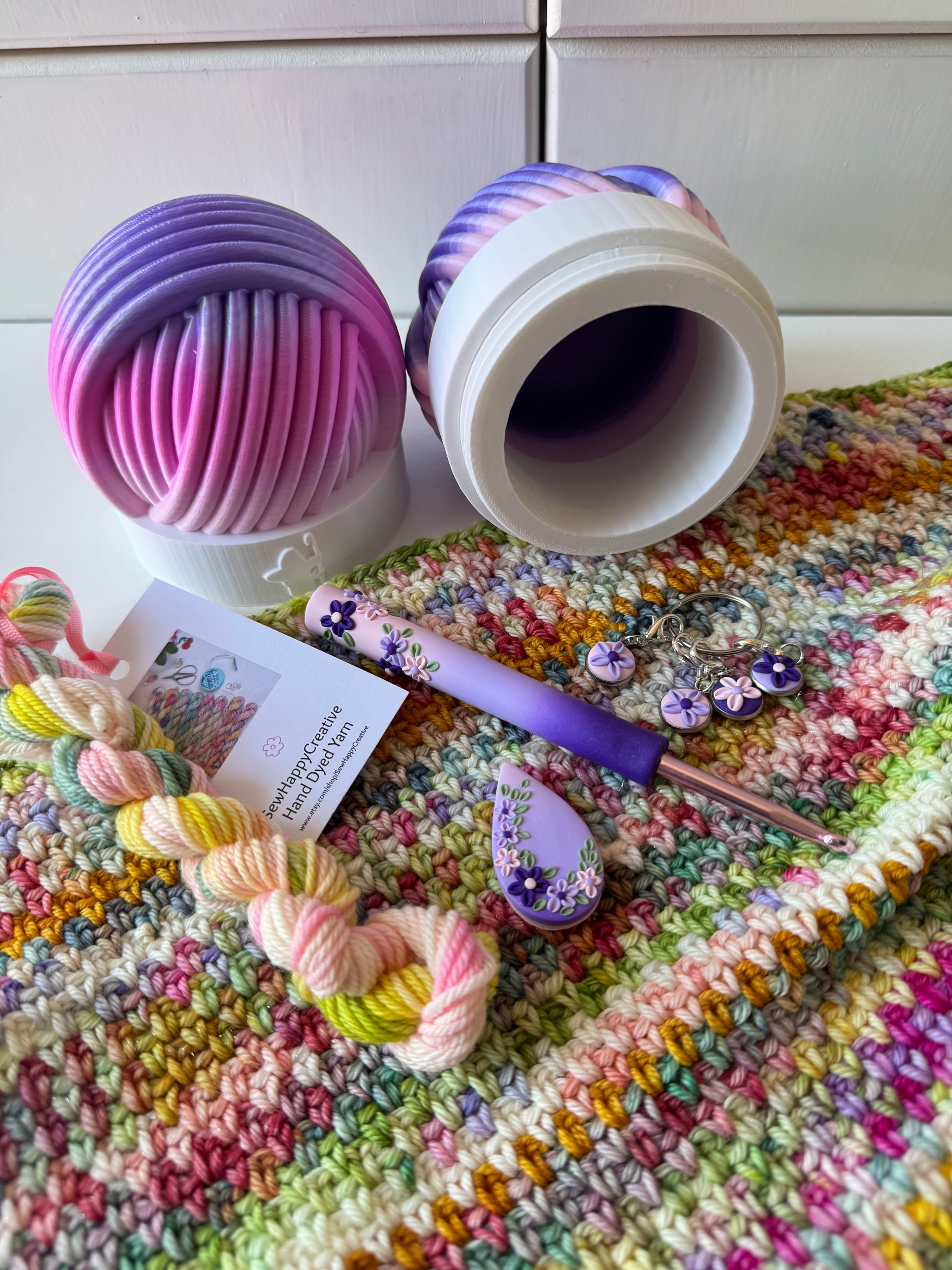 Your crochet hook, needle minder and stitch markers will all be in colours to compliment your yarn pot. Designs will vary and are part of the surprise but you can see some examples in the listing.