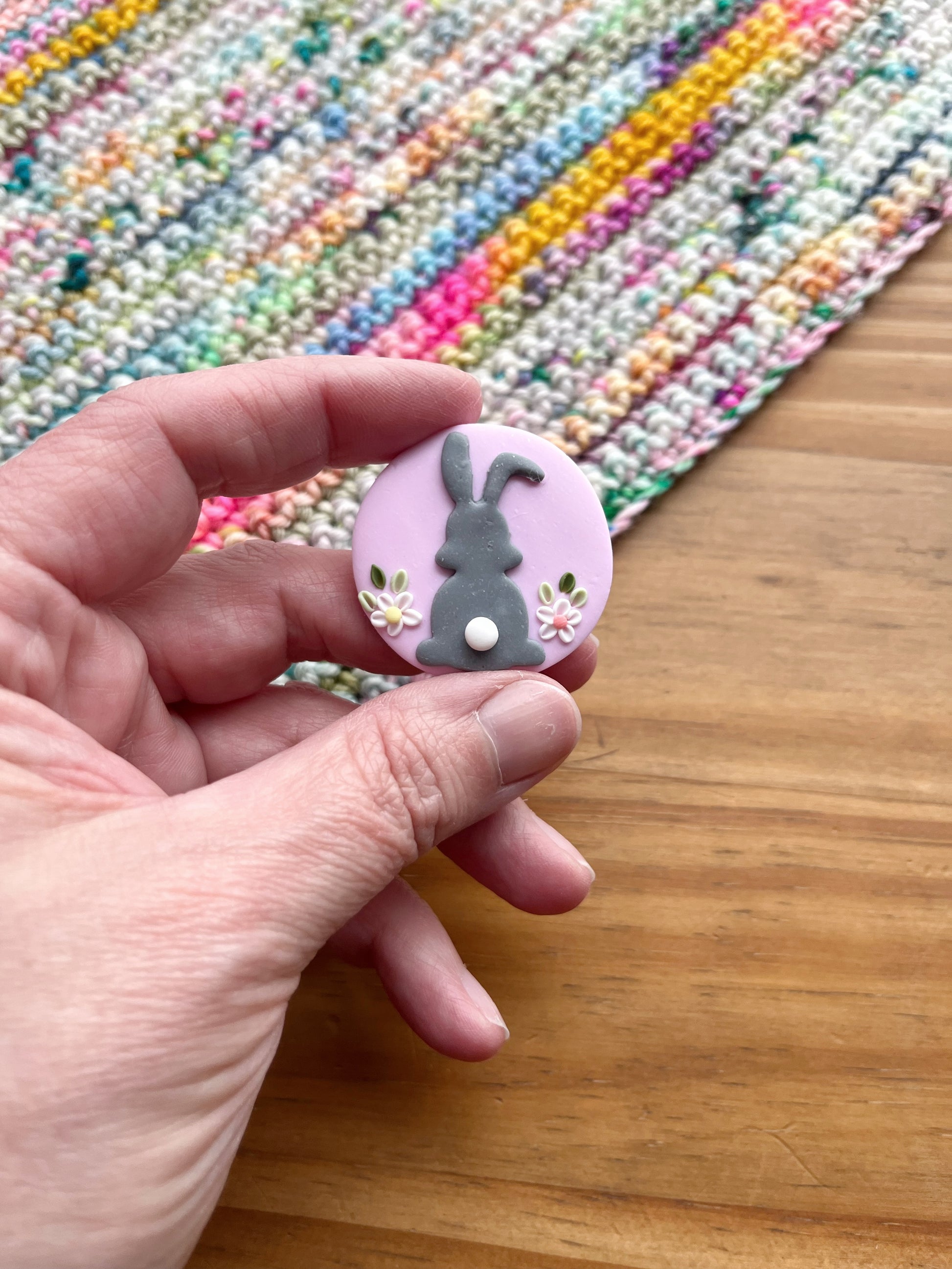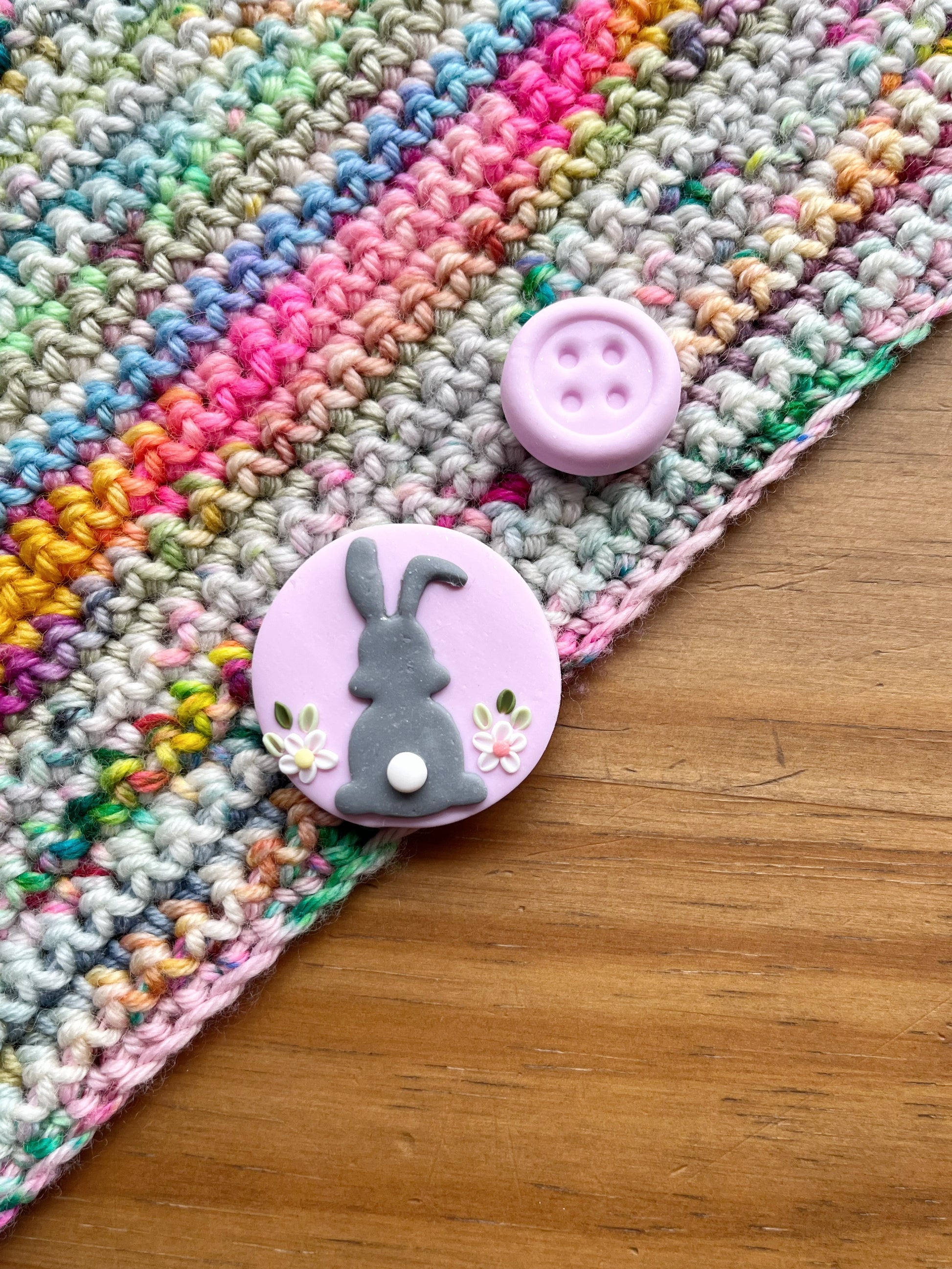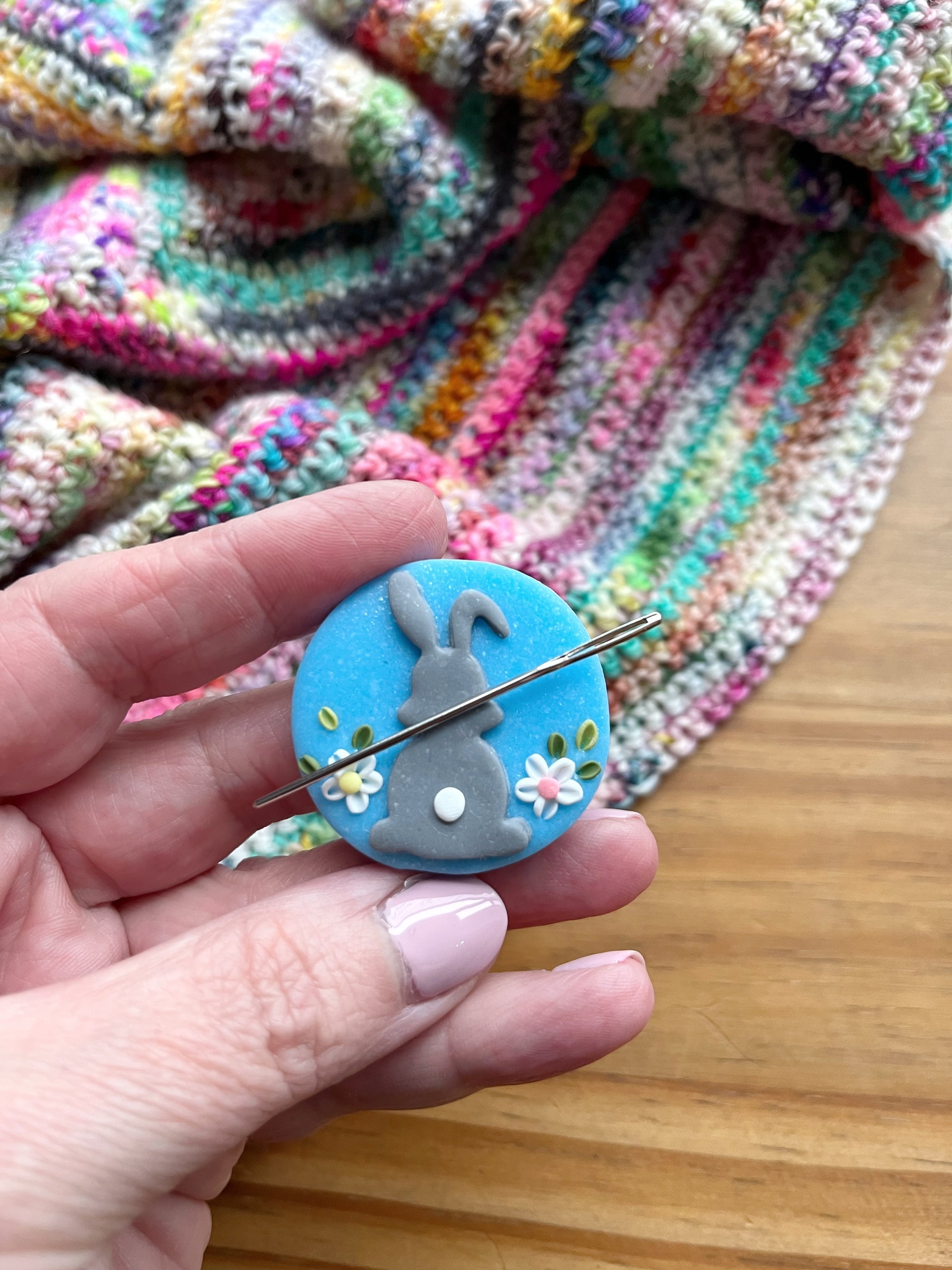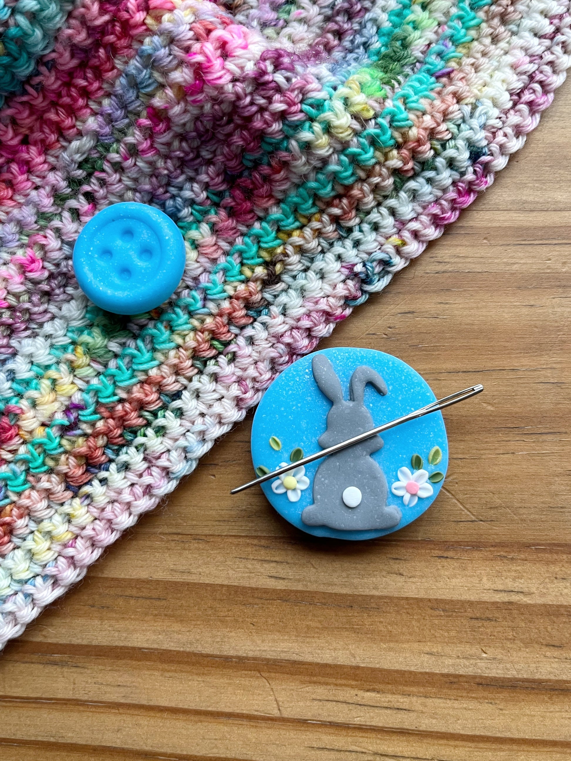 This needle minder features a cute little Easter bunny design on a round base. It is finished with my signature tiny flowers and is sure to brighten your day each time you use it! Choose from baby pink or blue base in the drop down menu.