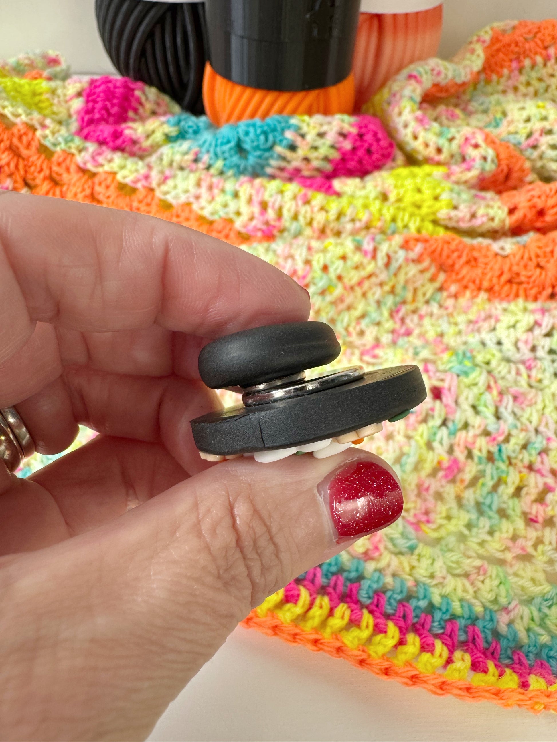 I make my needle minders with 2 pieces. There’s a strong neodymium magnet attached to the big piece and a small magnet attached to the back button. This makes it easy for you to attach your minder to your stitching, yarn project or even your notions tin - no more scrabbling for lost needles down the back of the sofa!