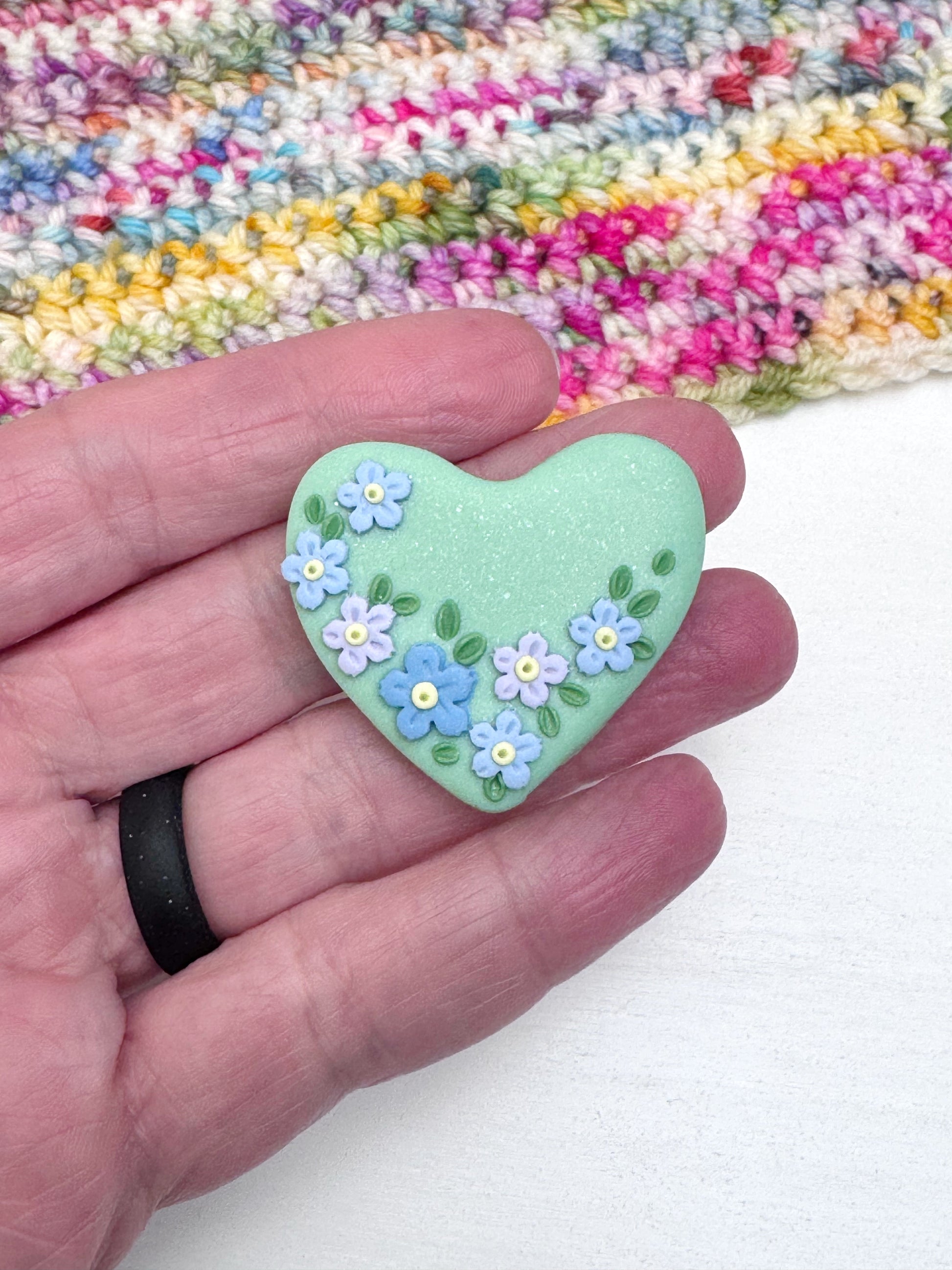 This magnetic needle minder features a pretty green polymer clay heart base with a forget me not floral design.Each one is packed with tiny details and measures 4cm across.