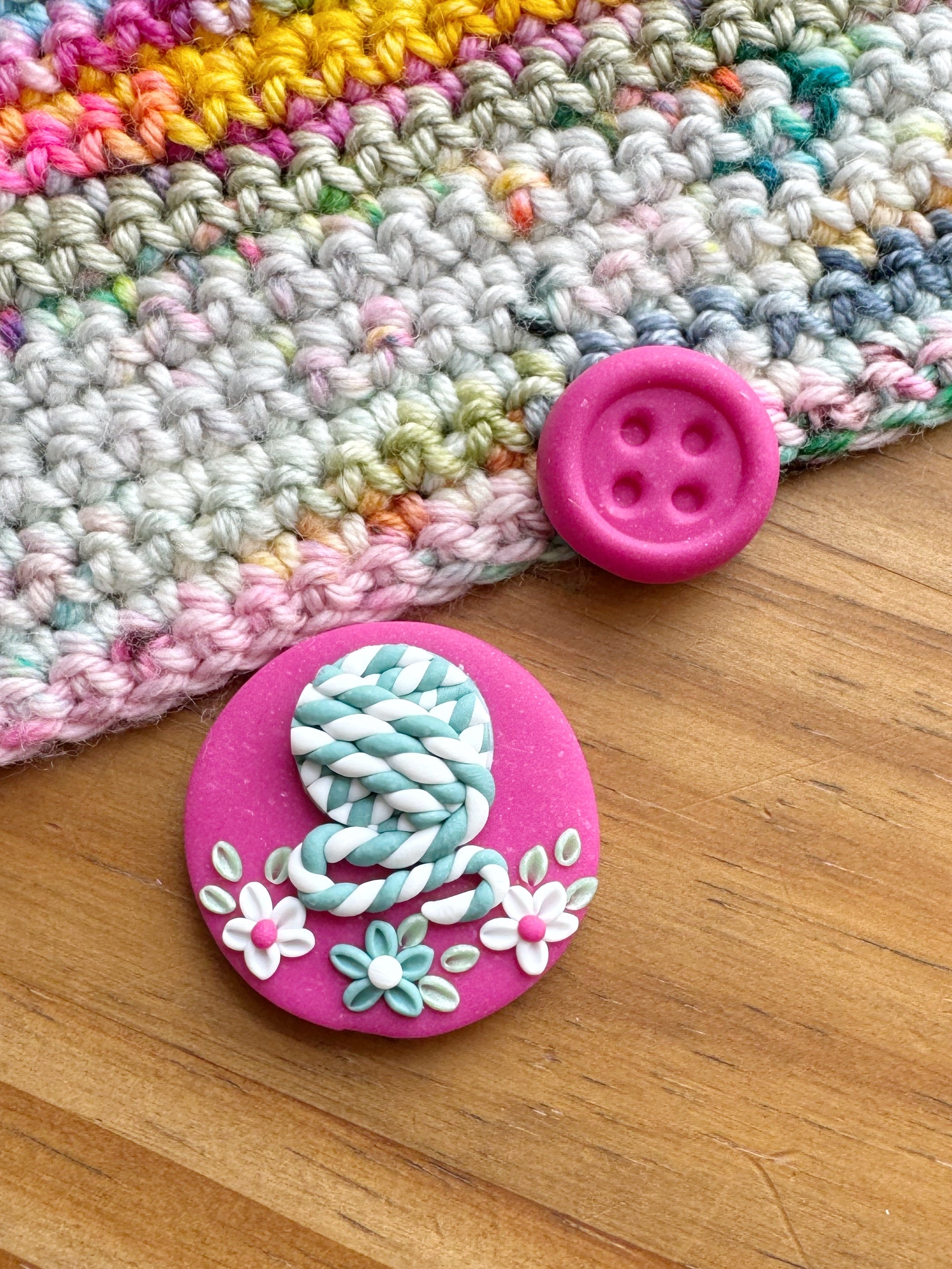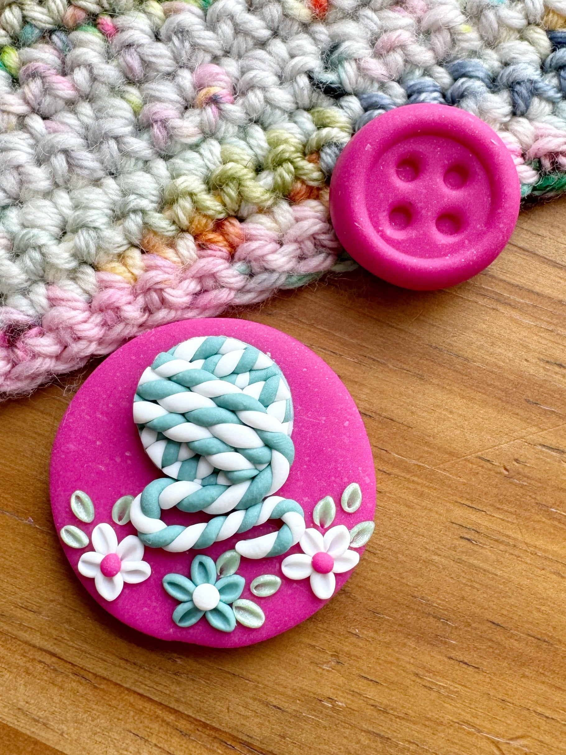This needle minder features a cute sea green and white yarn ball on a fuchsia clay base with my signature tiny flowers.