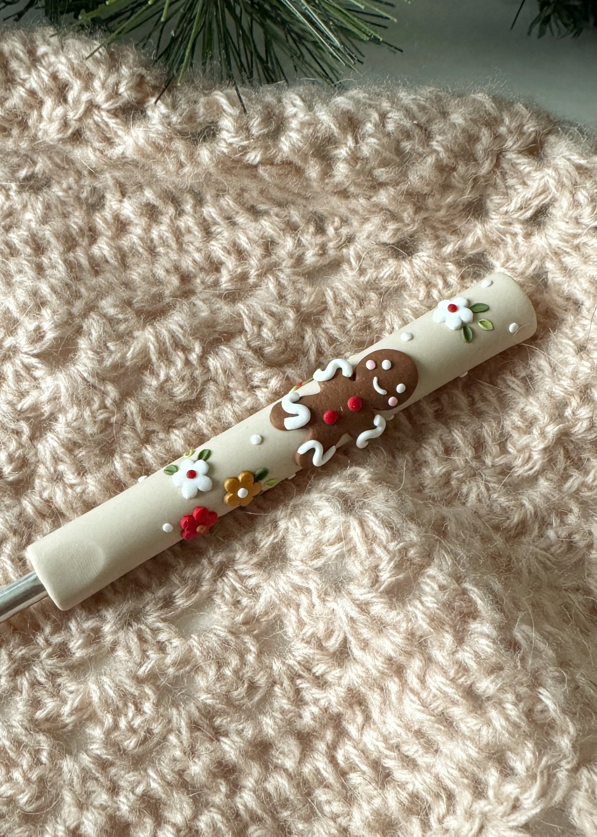 This is a tapered aluminium crochet hook with a smooth neutral polymer clay base. It features a cute little gingerbread man and is packed with tiny details. As with all of my crochet hooks this one is size stamped and has a shaped thumb rest for added comfort.