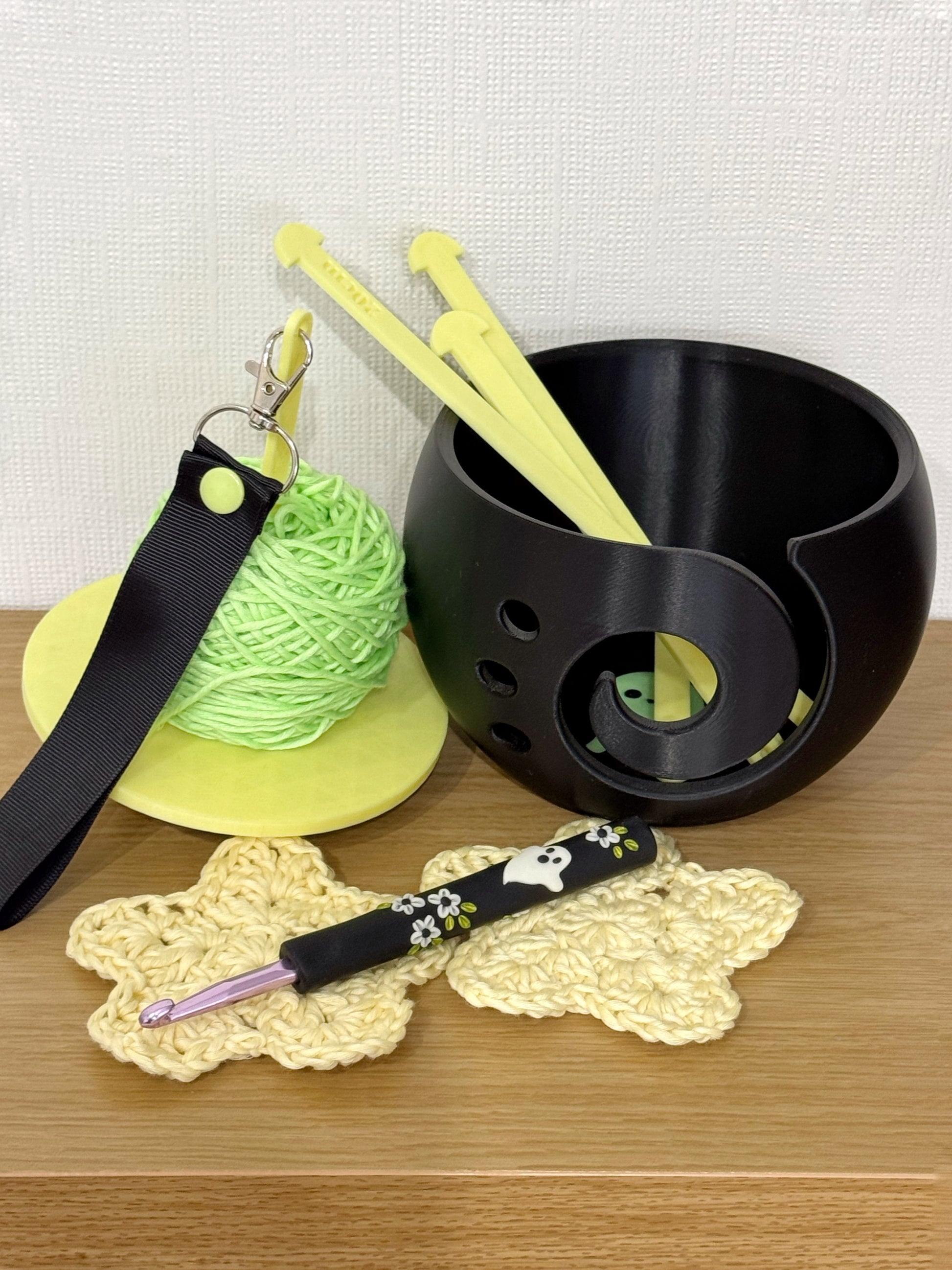 This set consists of a yarn bowl, portable yarn holder and my best selling kawaii ghost crochet hook in size 6.5mm. The yarn holder, accents on the yarn bowl and details on the crochet hook are all glow in the dark which makes them extra special. Perfect for a loved one who is crochet obsessed!