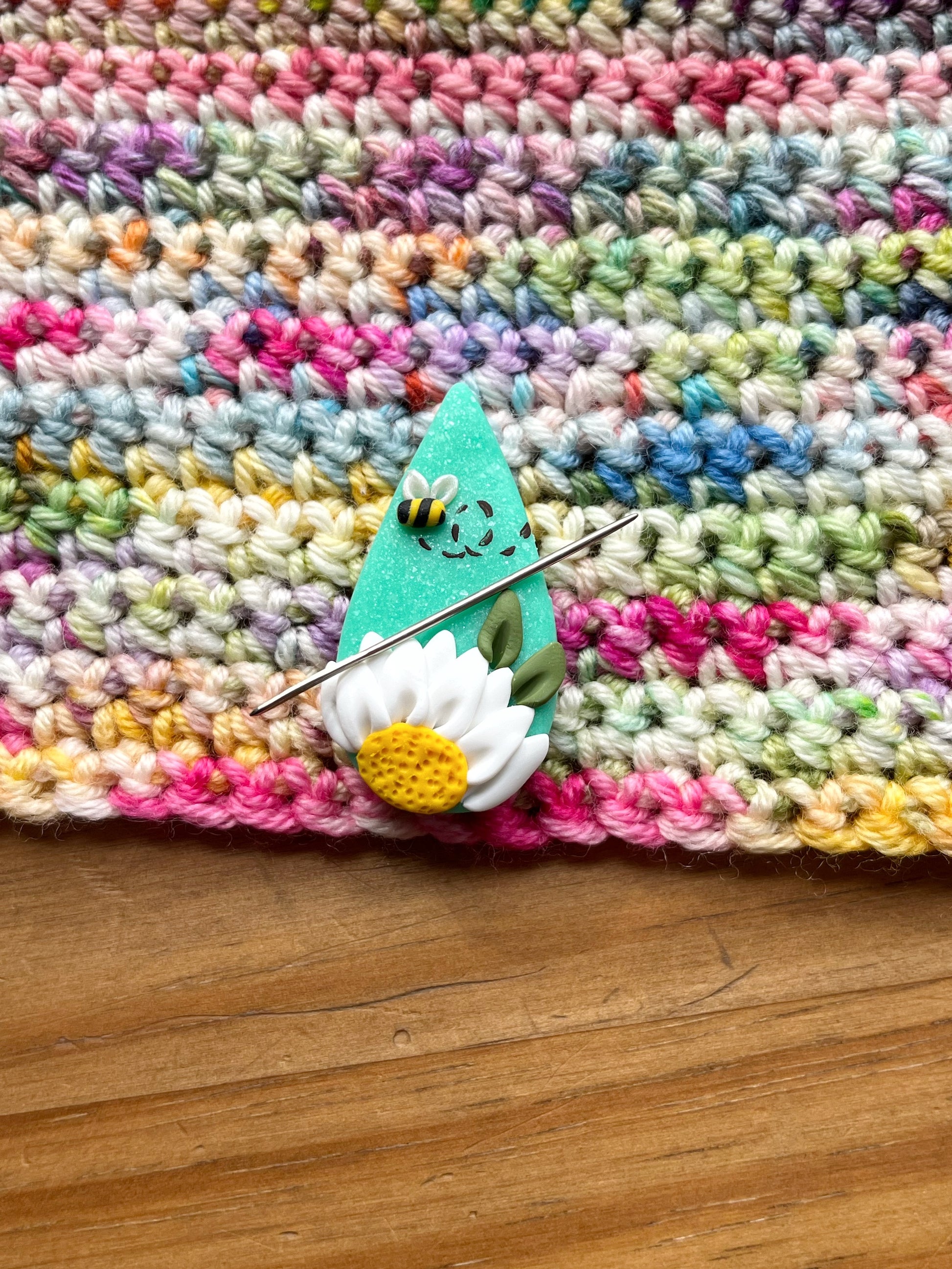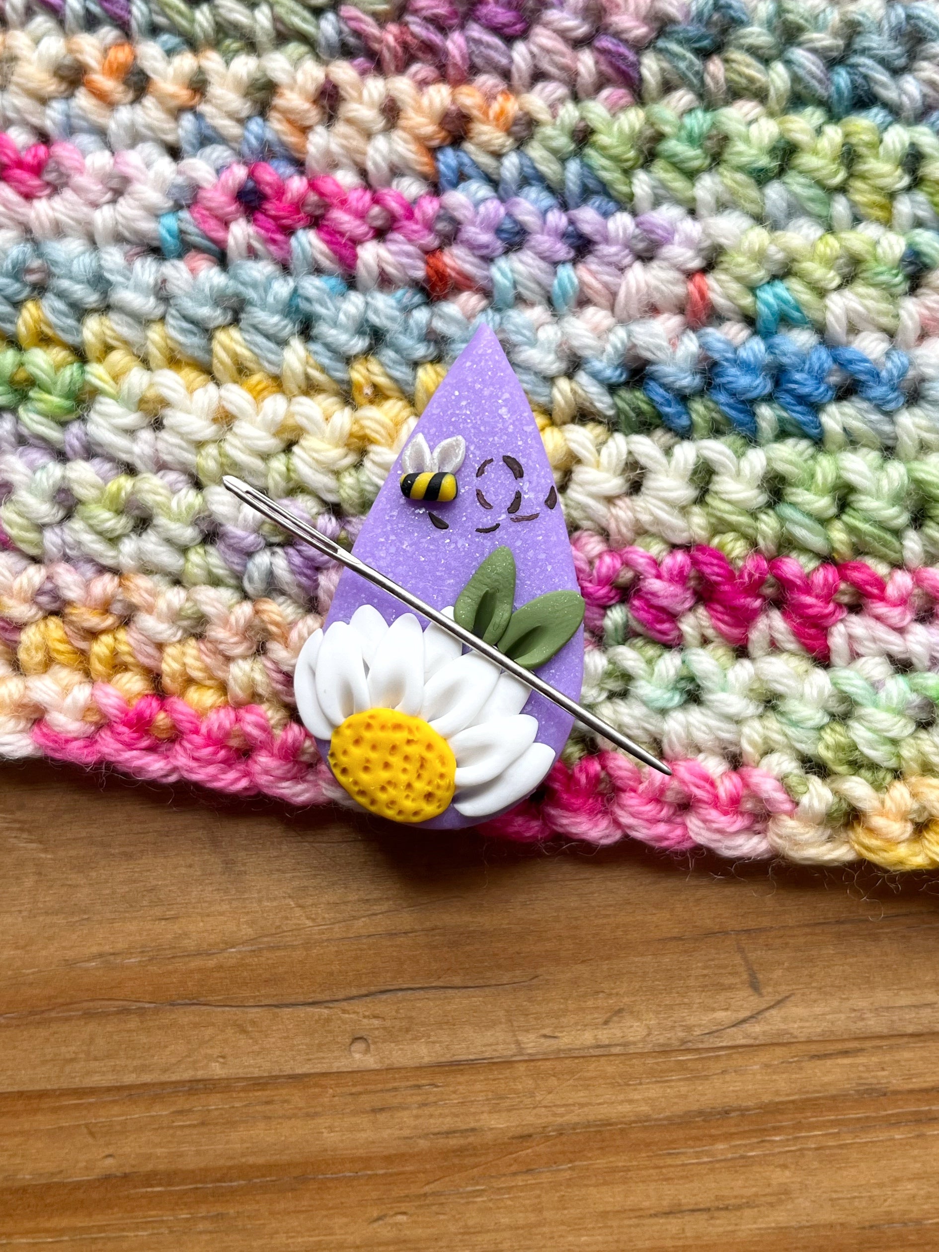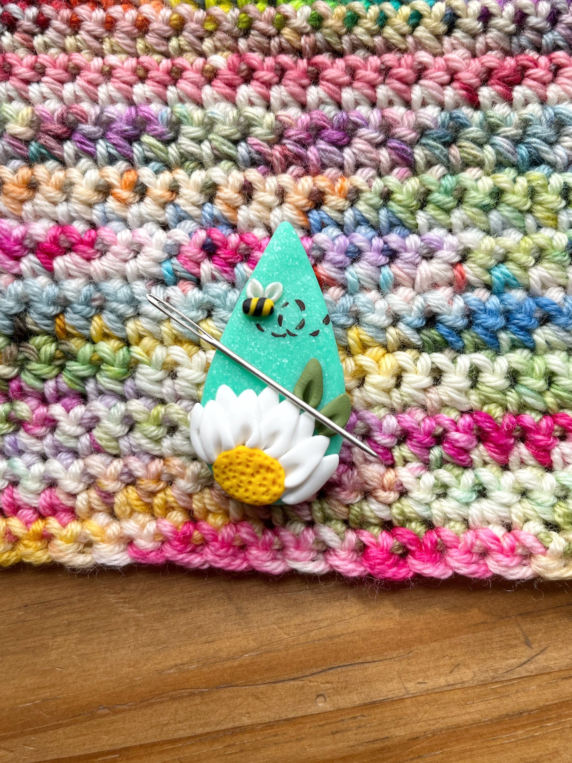 This needle minder is around 4.5 cm long and 2.5cm wide. It features a hand shaped daisy design on a green glitter base. It is finished off with a tiny bumble bee and hand painted bee trail.