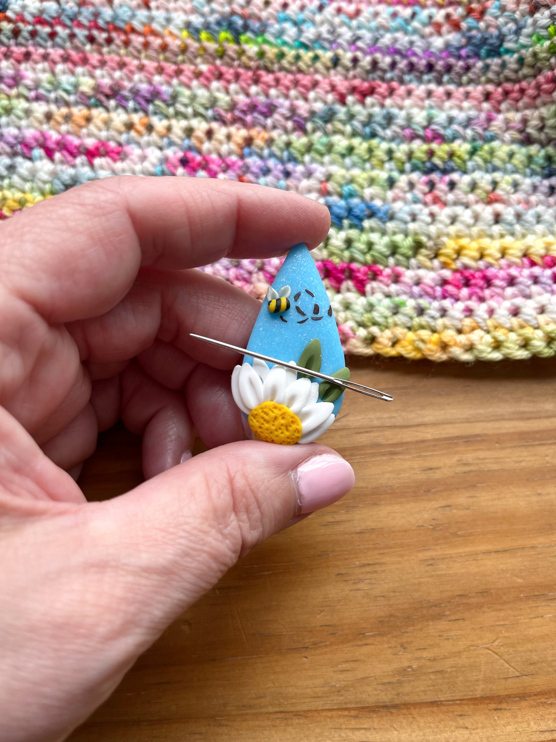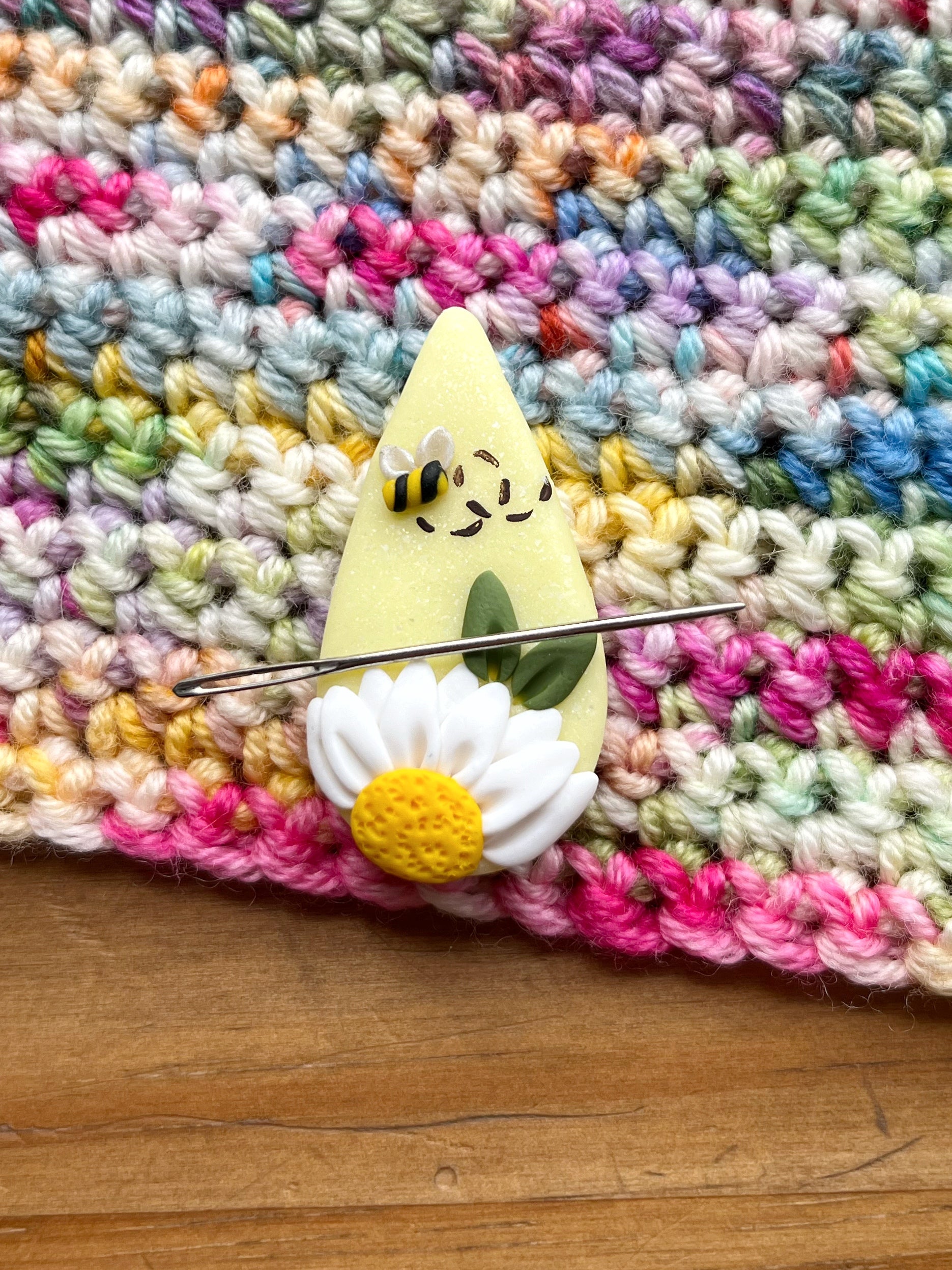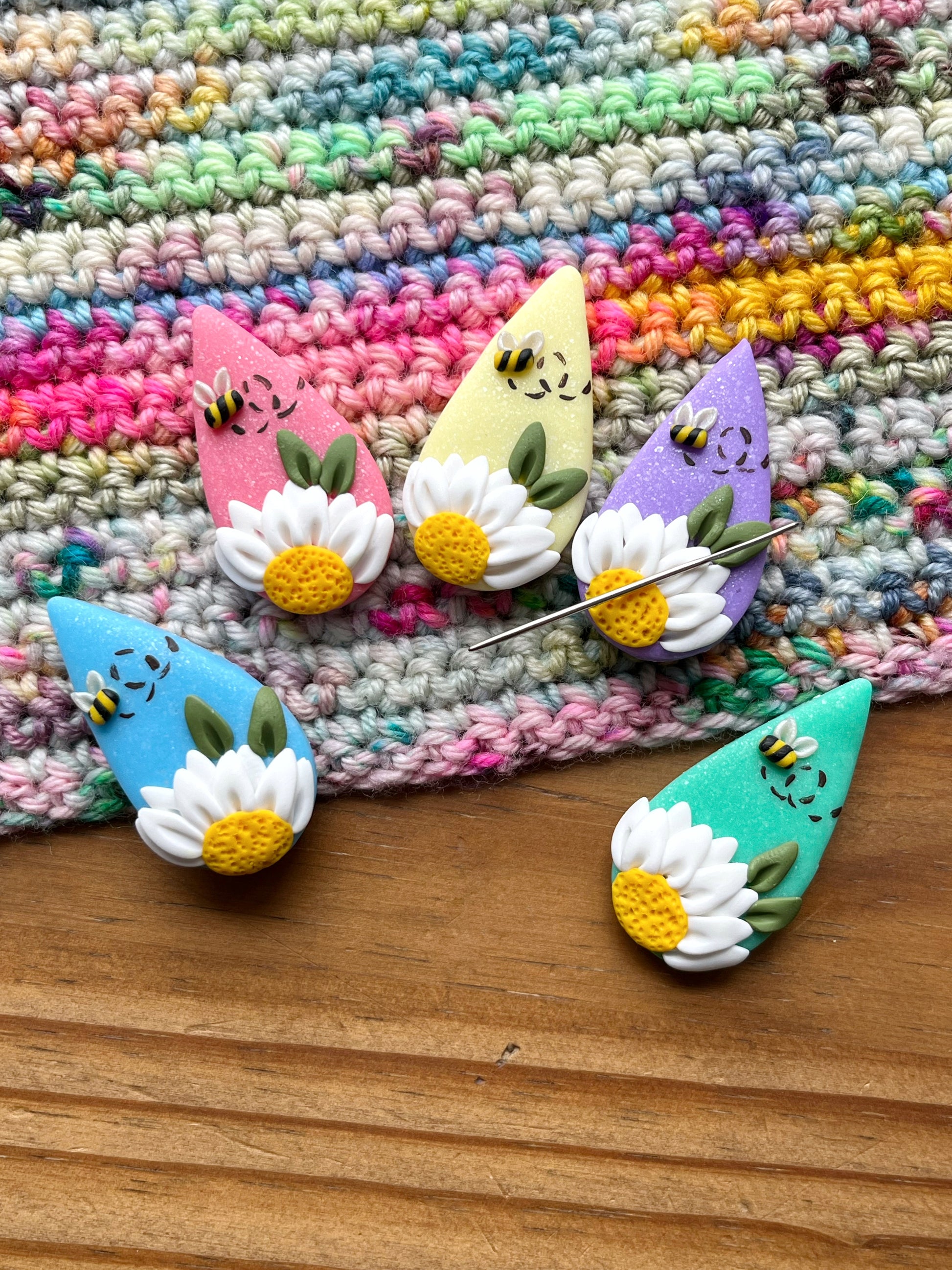 This needle minder is around 4.5 cm long and 2.5cm wide. It features a hand shaped daisy design on a green glitter base. It is finished off with a tiny bumble bee and hand painted bee trail.