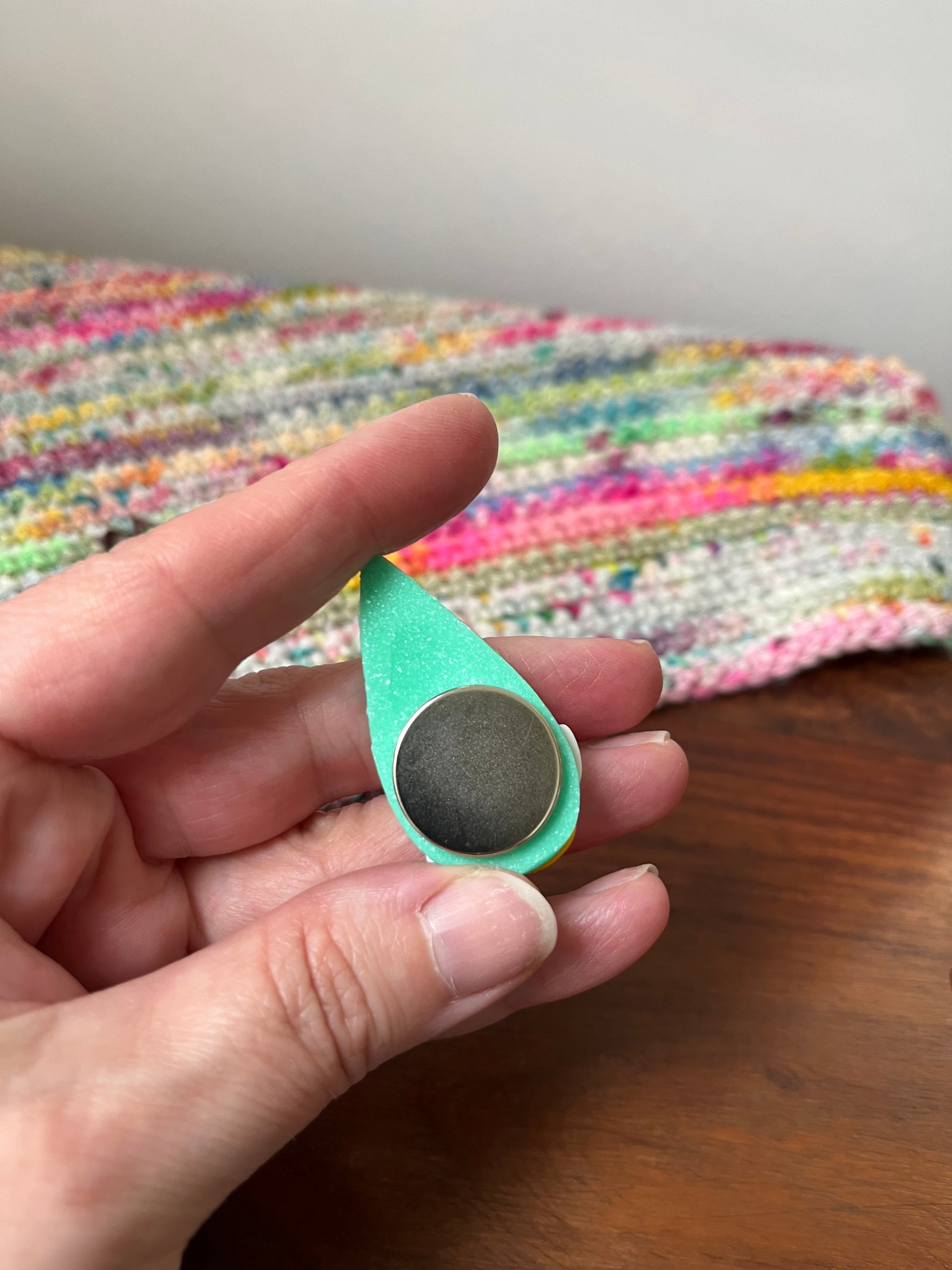 A neodymium magnet is attached to the back of the minder and a second magnet allows it to be attached to your notions tin or fabric to keep your needle safe while you work.
