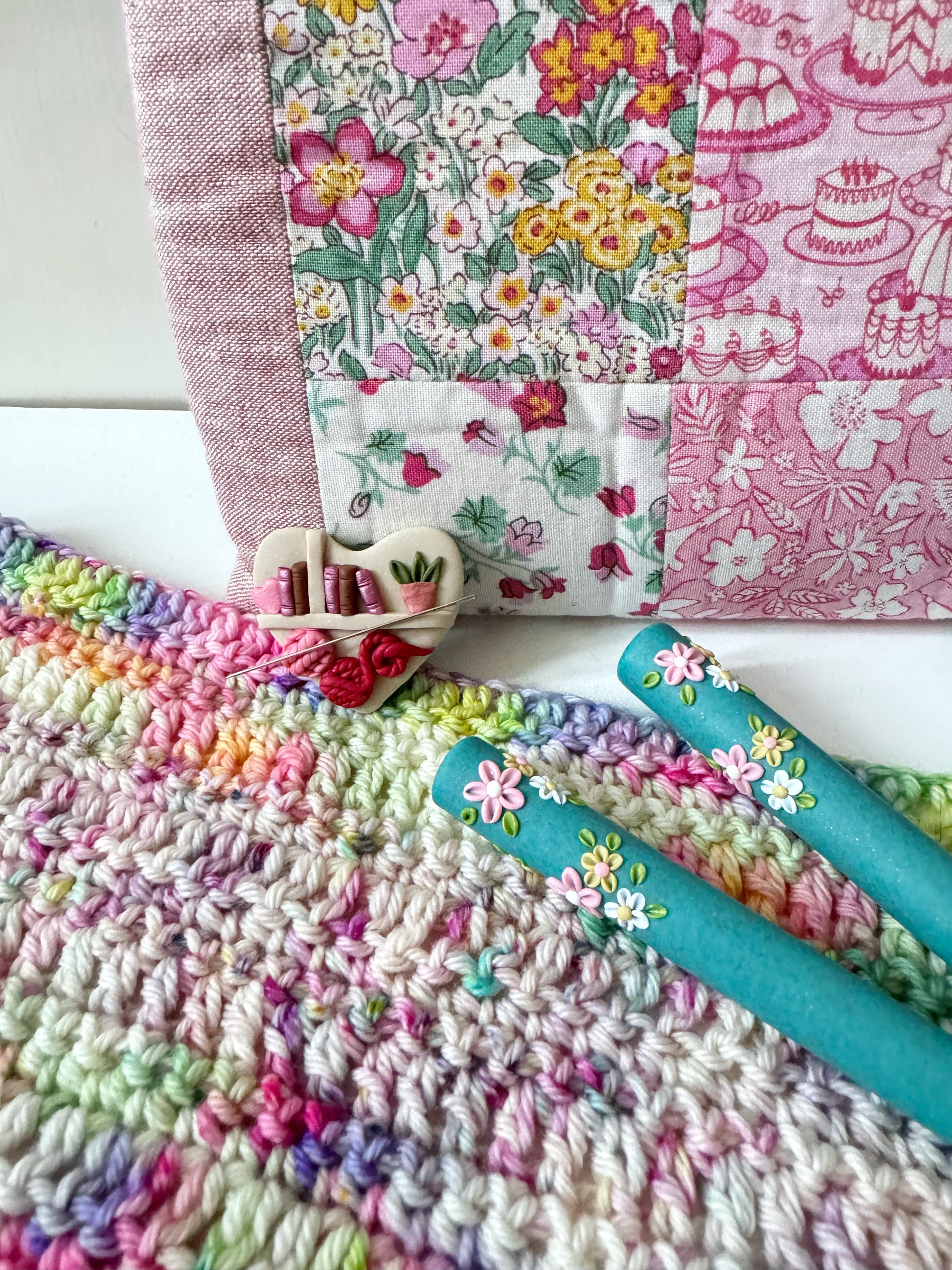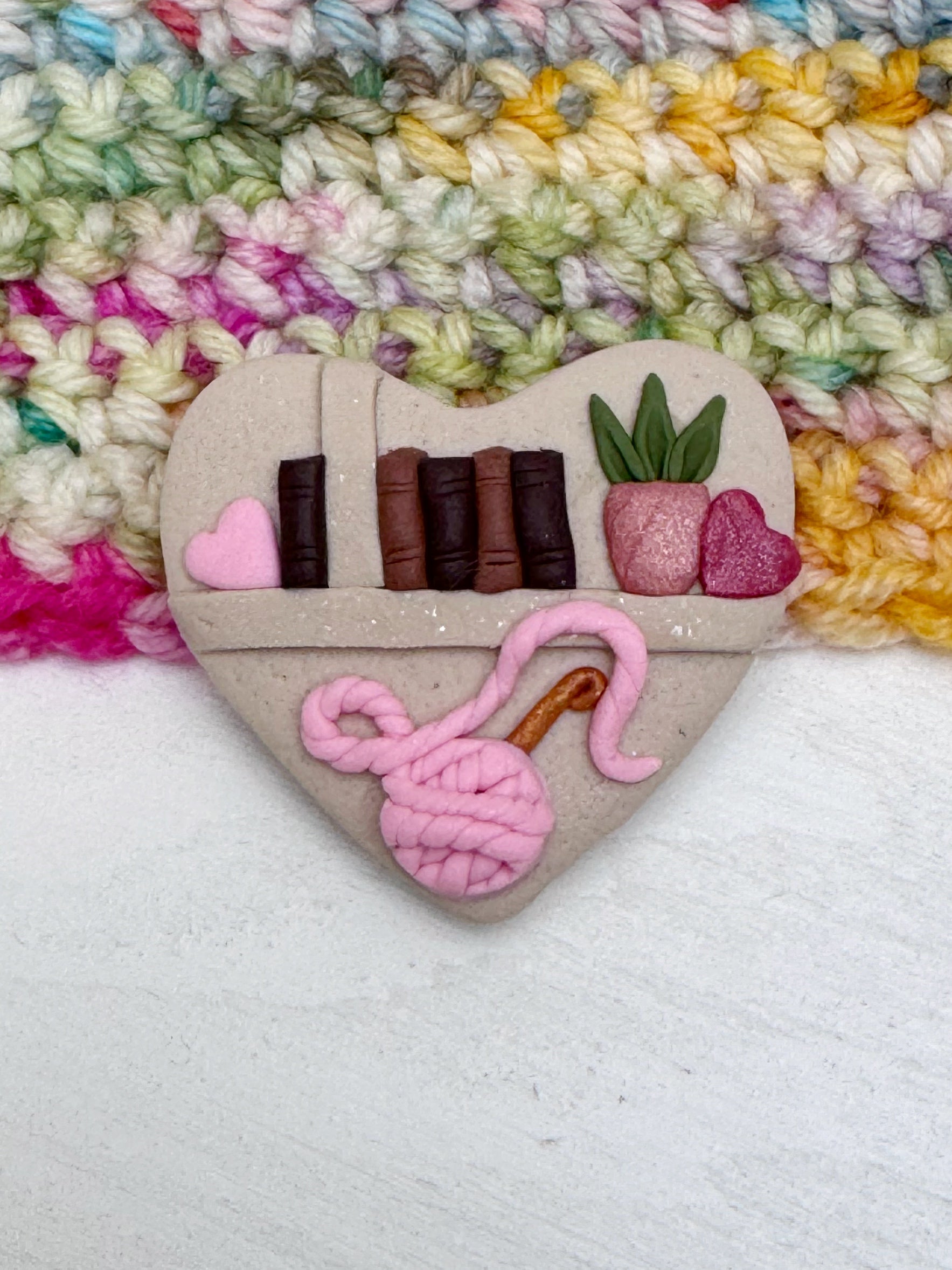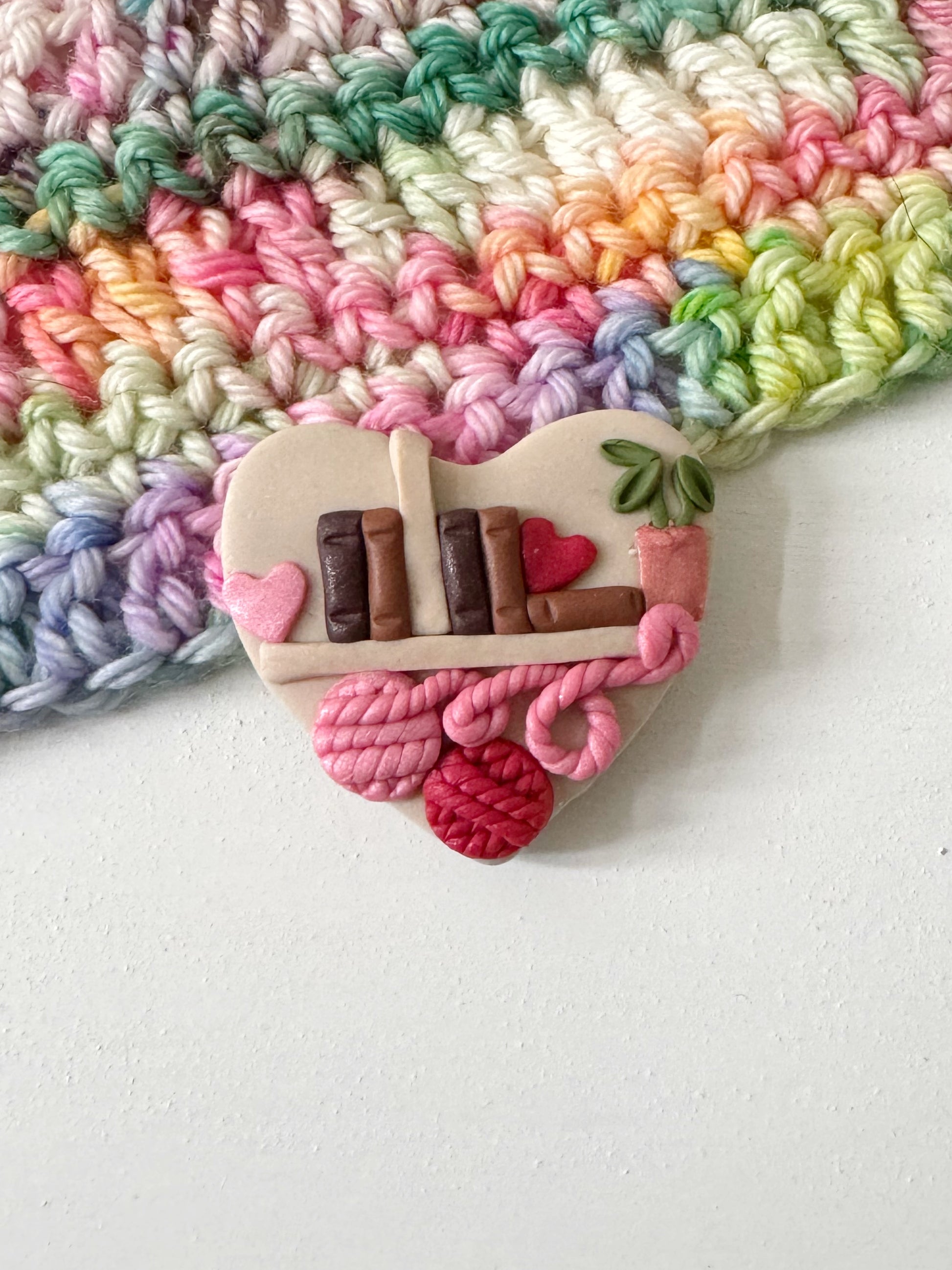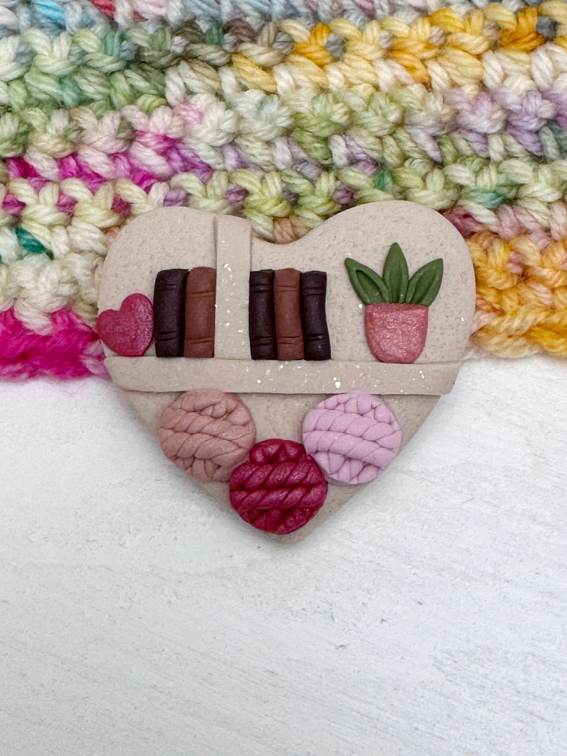 Each needle minder is handmade from polymer clay, meaning no two are ever the same. Tiny bookshelf details, a heart shape and yarn-inspired elements make these a lovely gift for yarn lovers or a special treat for yourself.