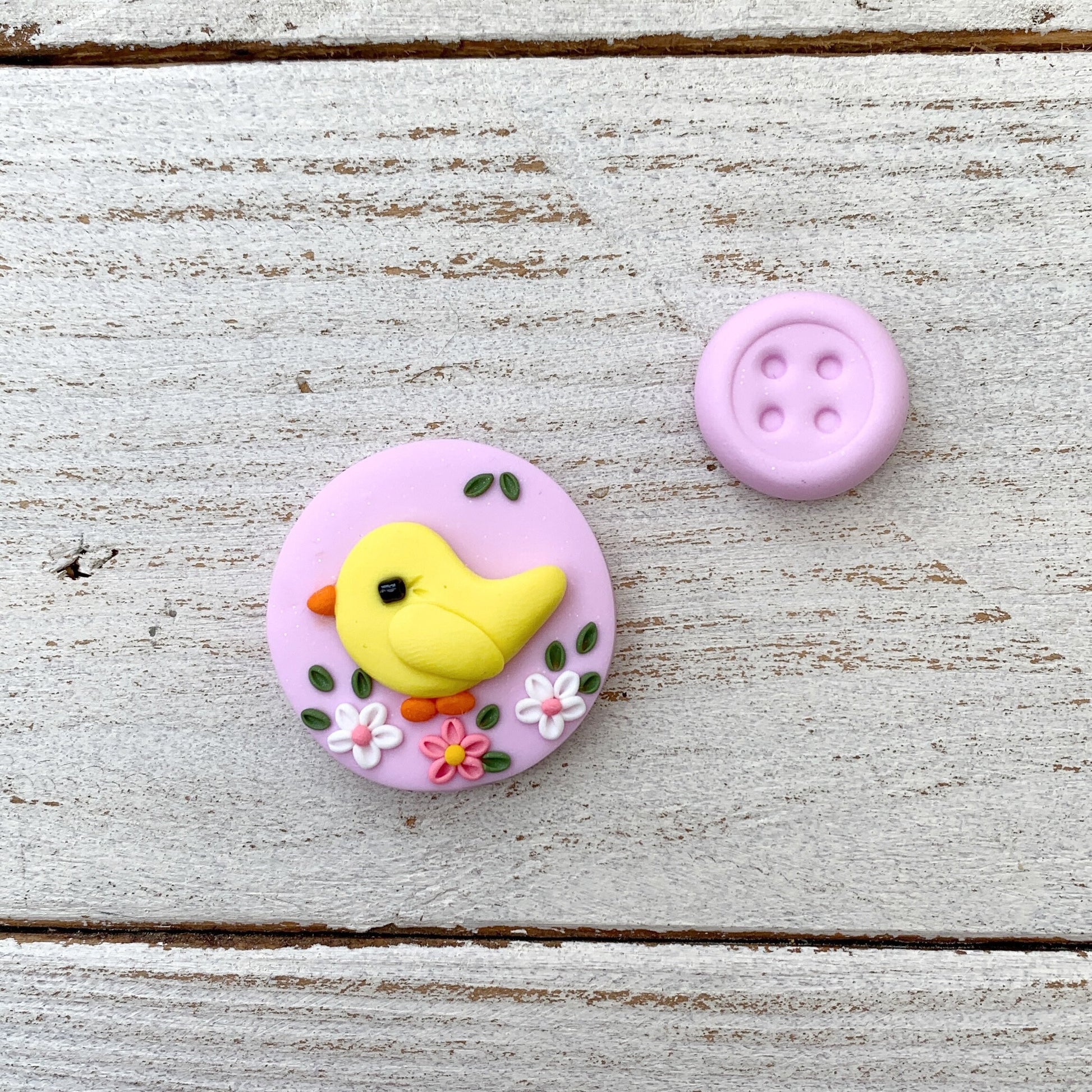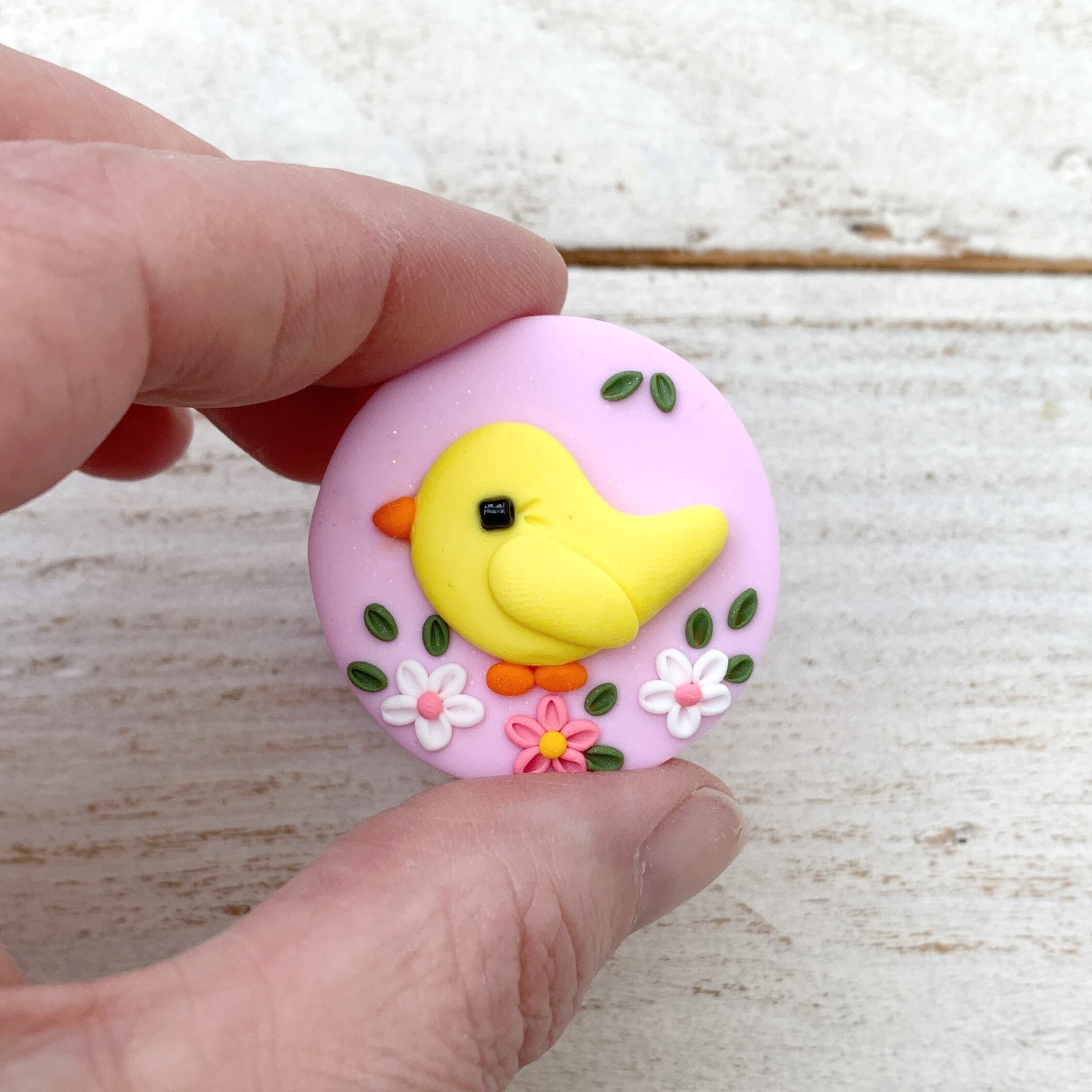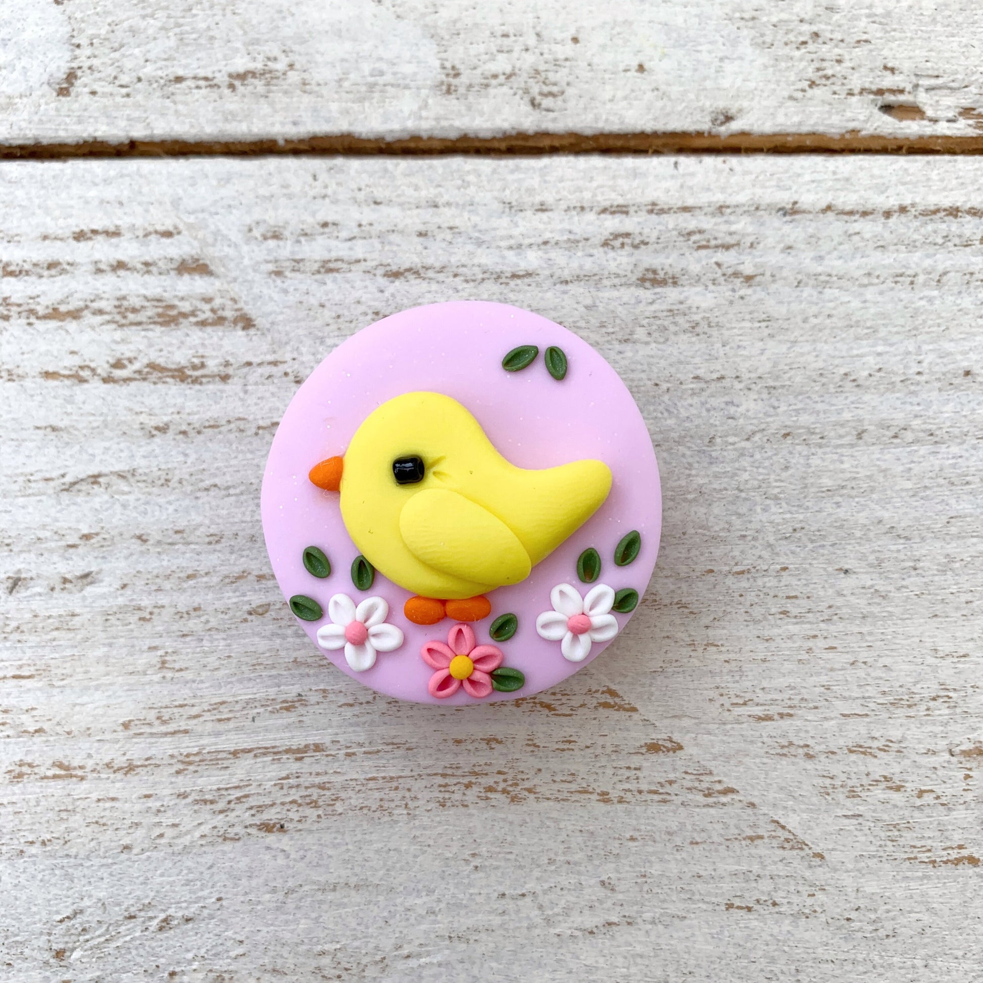 This needle minder features a pretty spring chick design on a round pink base. It is finished with my signature tiny flowers and is sure to brighten your day each time you use it!