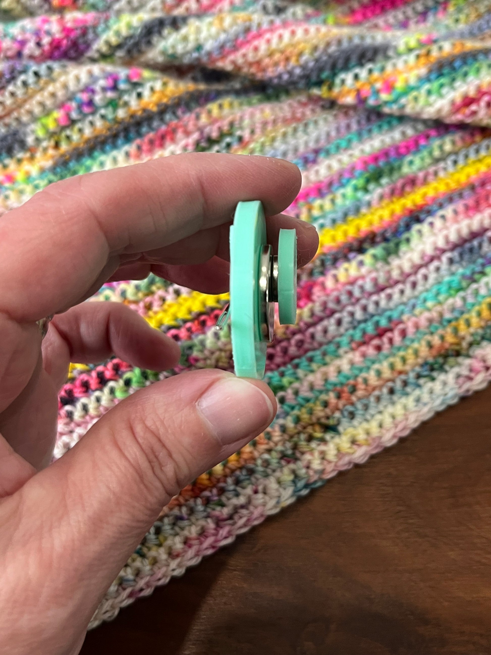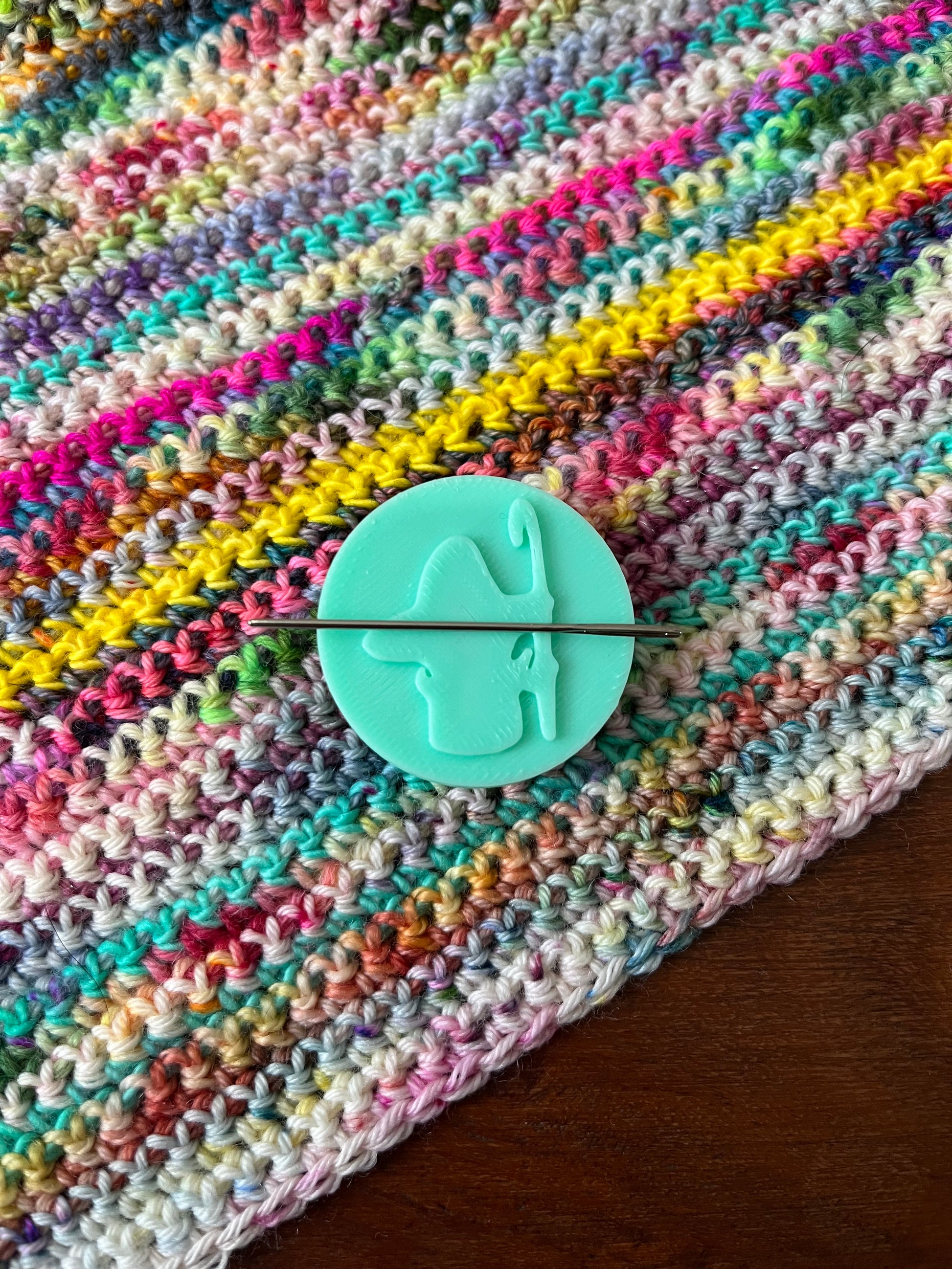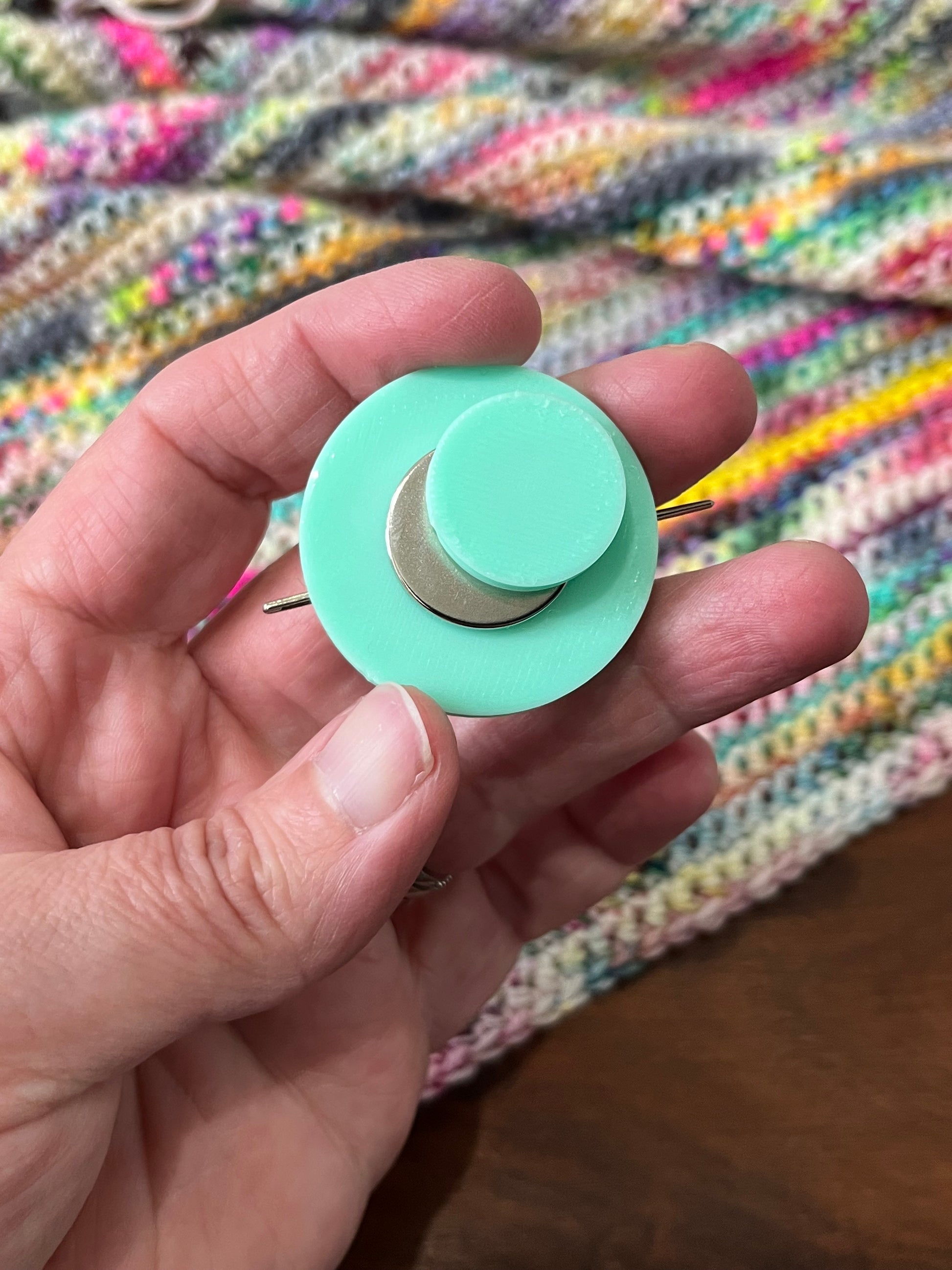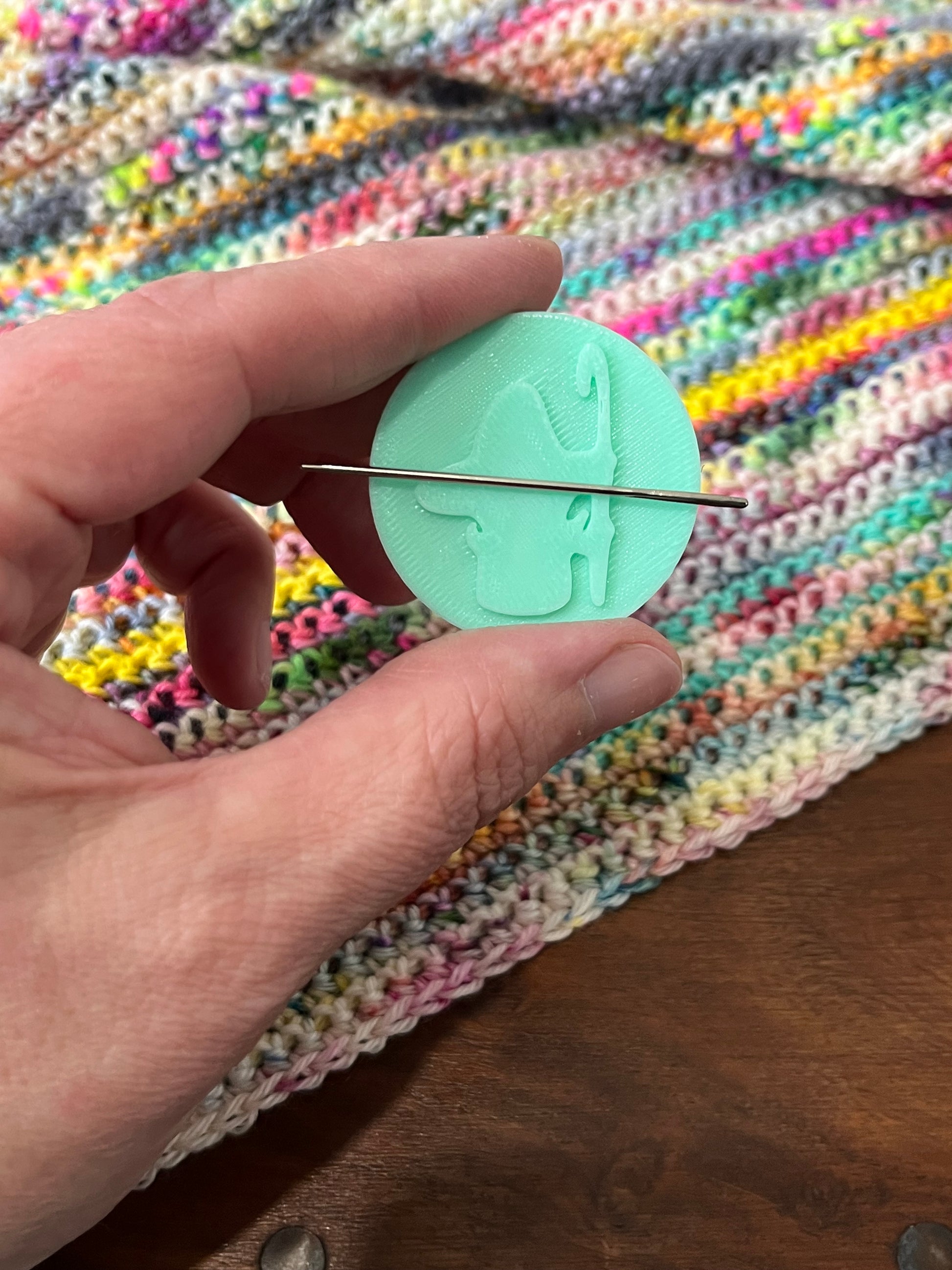 This one is 3D printed in a mint green and features my logo embossed onto it in the same colour. It measures just under 4cm wide on the top part and the back piece is 1.5cm wide. Having 2 pieces makes it easy to attach your needle minder to a project bag or even to your fabric or crochet.
