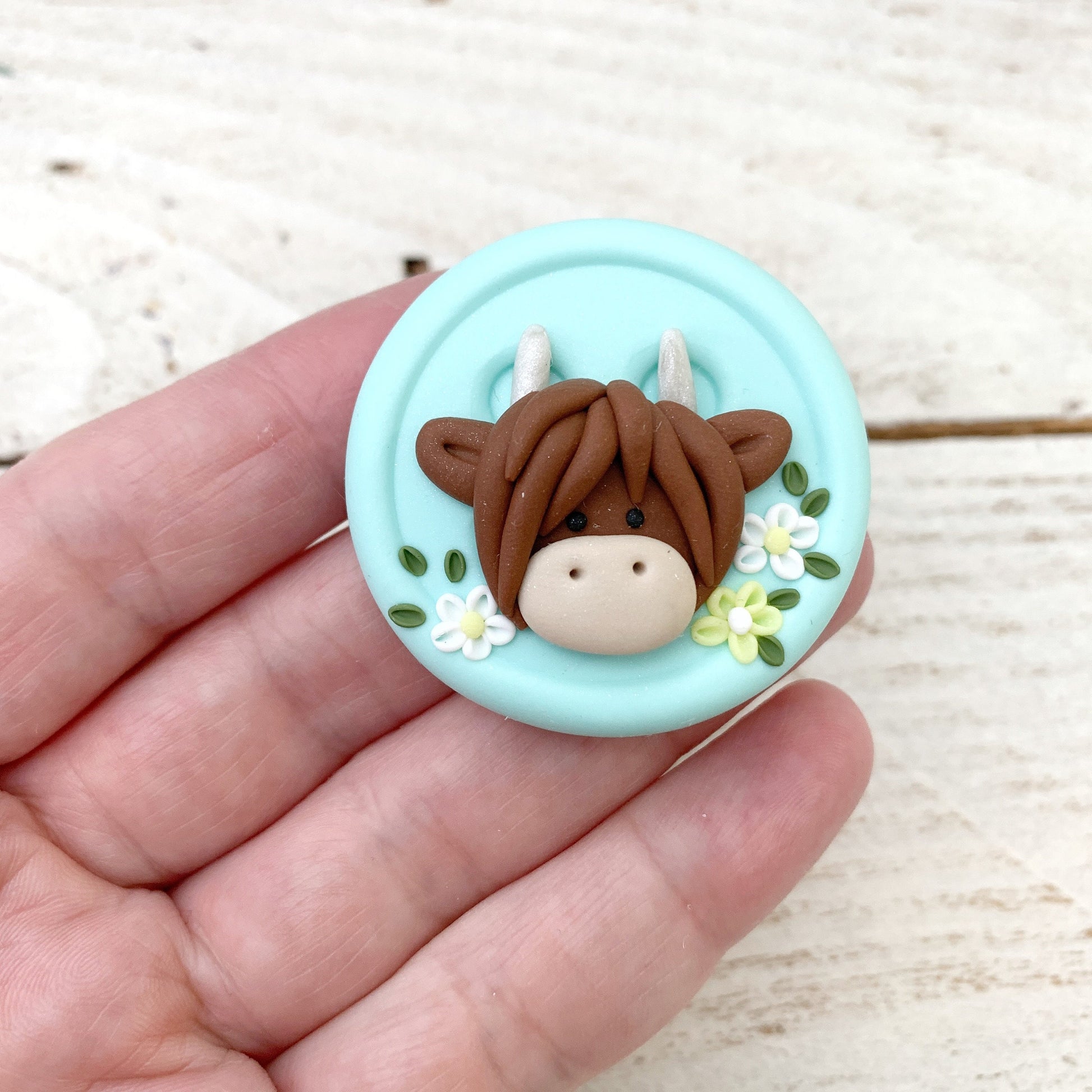 This design features a highland cow design on a mint button base that's a little under 2" wide. It's a perfect sewing aid for a huge range of projects!