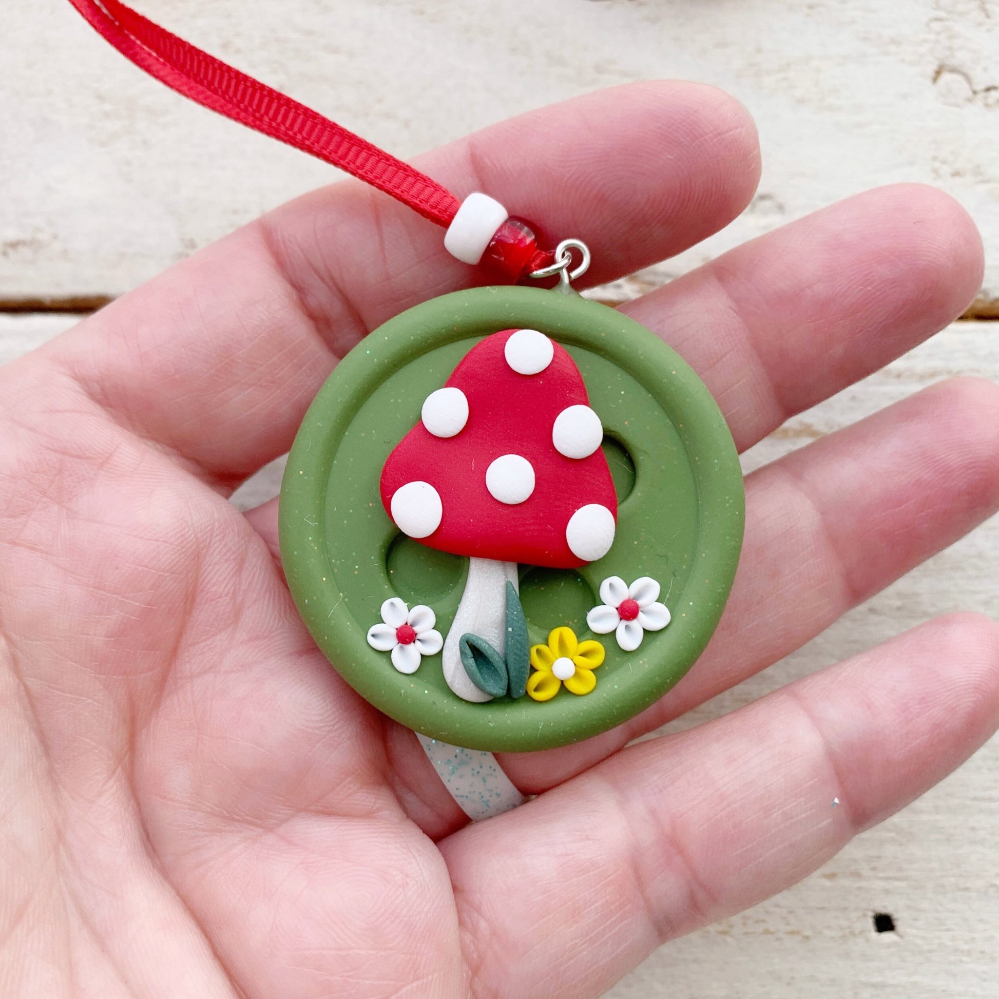 This fob features my 2” button base in glitter olive. The hand shaped mushroom and tiny flowers are one of my best selling designs and will make the perfect decoration for your embroidery scissors.