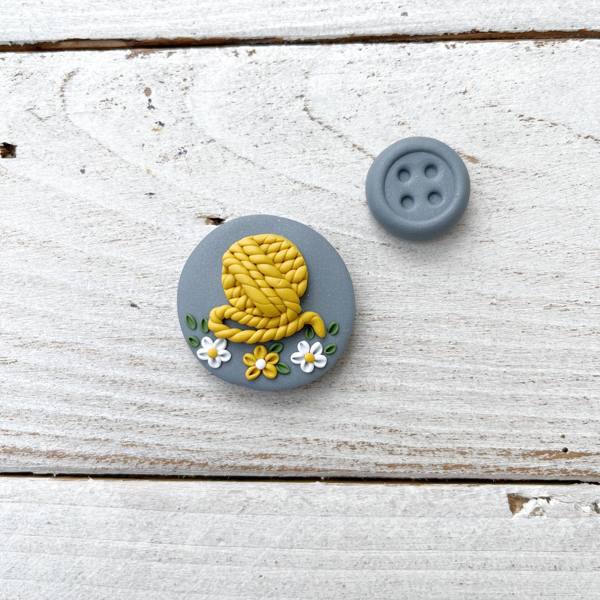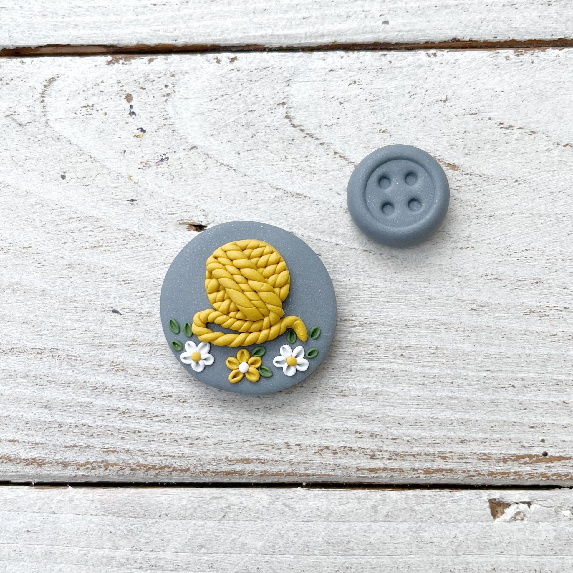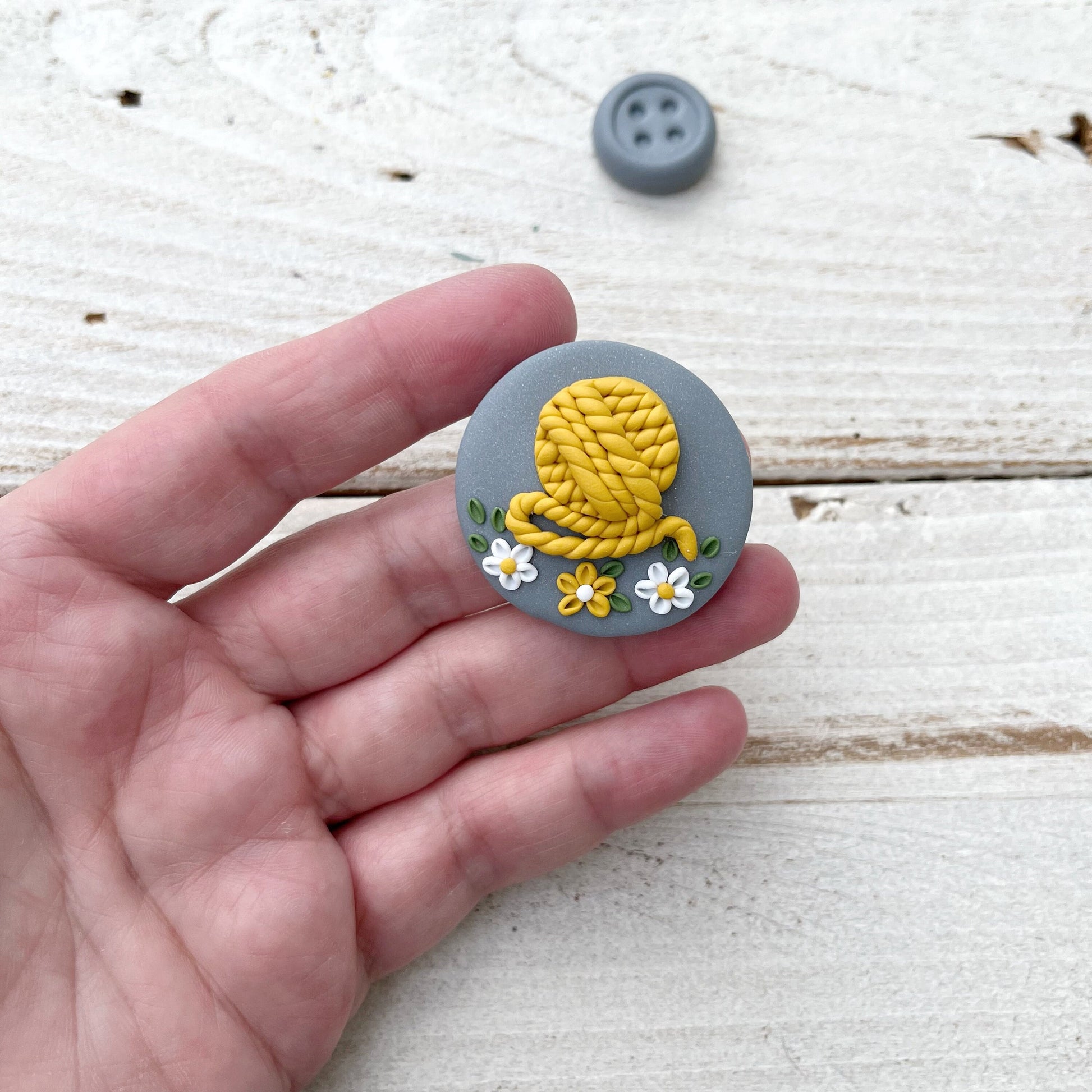 This needle minder features a cute mustard yarn ball on a grey clay base with my signature tiny flowers.