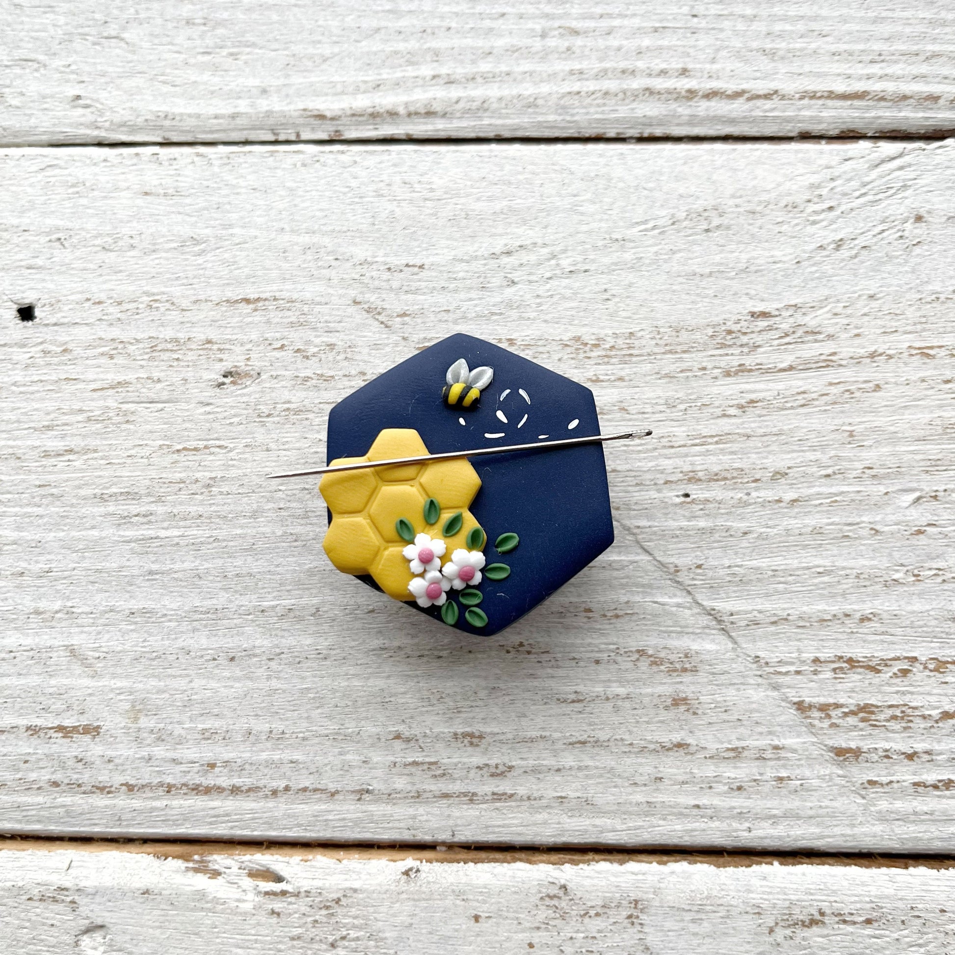 This needle minder features honeycomb and some tiny flowers on a navy hexagon base which is about 4cm wide. It is finished with a tiny hand shaped bumble bee and some pretty bee trails.