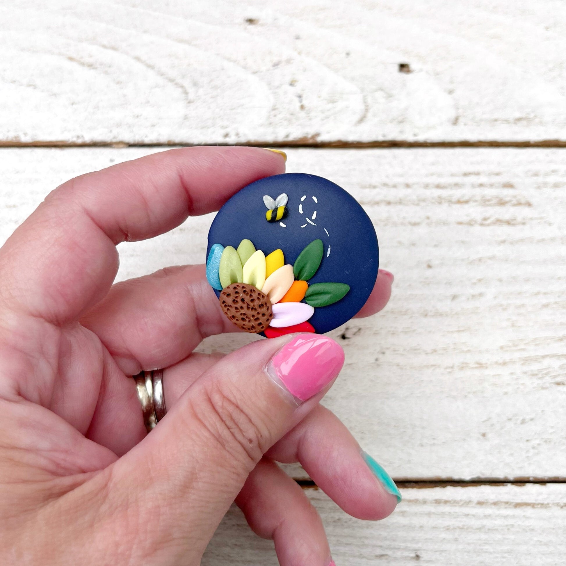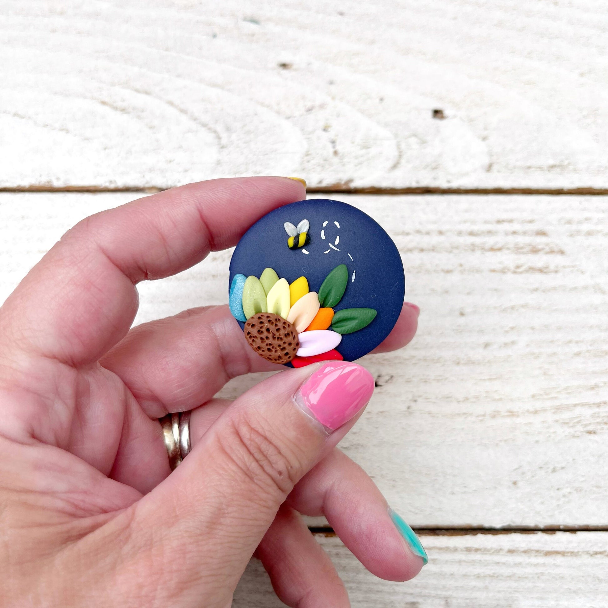 This needle minder features a pretty rainbow flower design on a round navy blue base. It’s sure to brighten your day each time you use it!