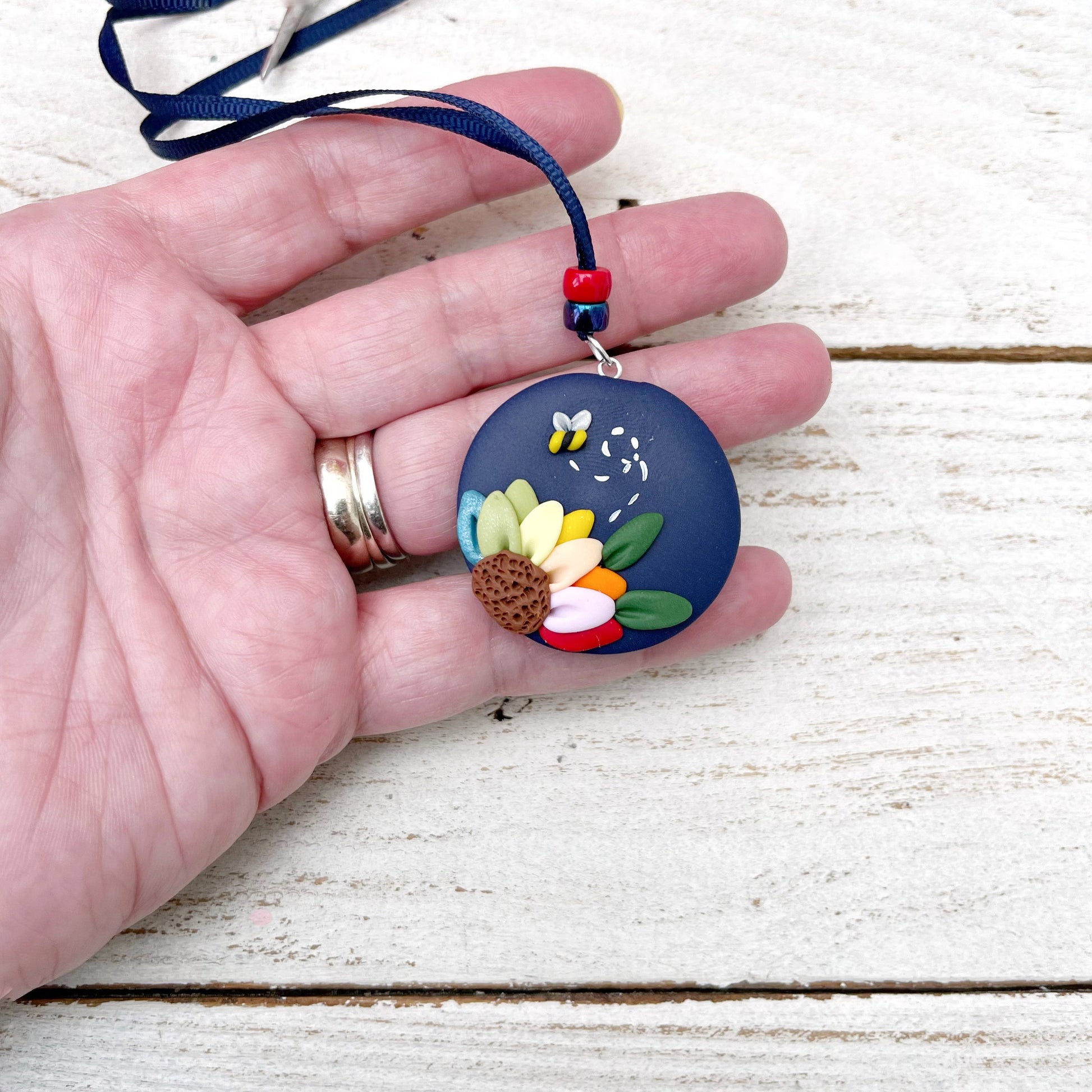 This fob features my 4cm base in navy blue. The pretty rainbow flower and tiny bee are shaped by hand to make something special that will be a joy to use.