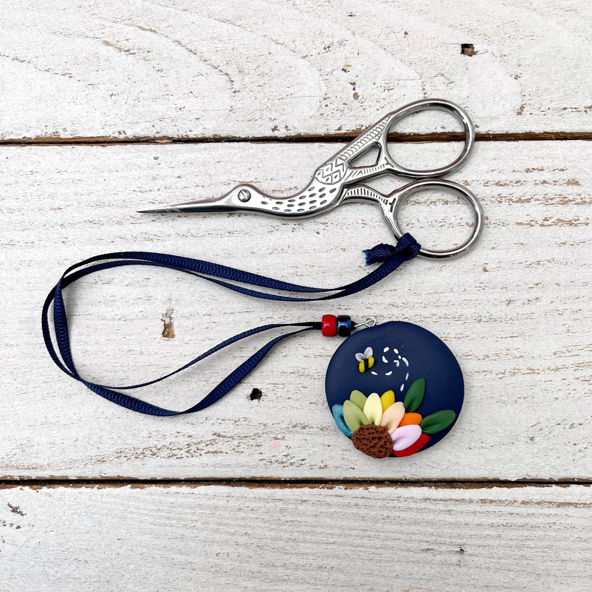Navy rainbow flower scissor fob, scissor keeper, crochet tools, gift for her, cross stitch accessories