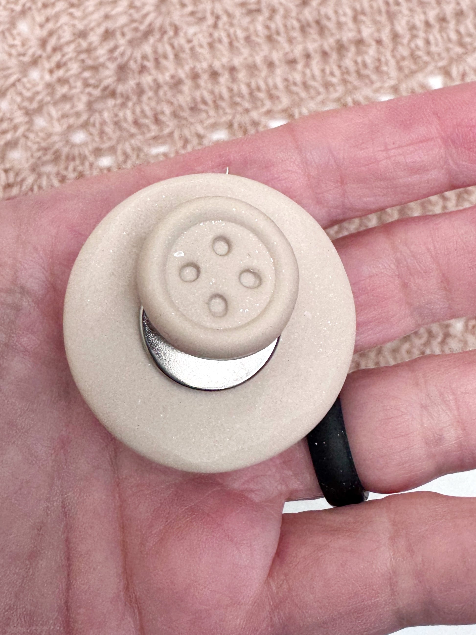 I make my needle minders with 2 pieces, a large polymer clay front button and a small back one. Each one has a magnet on the underside. Simply attach the magnets at either side of your sewing and then rest your needle on the decorative top button when it’s not in use.
