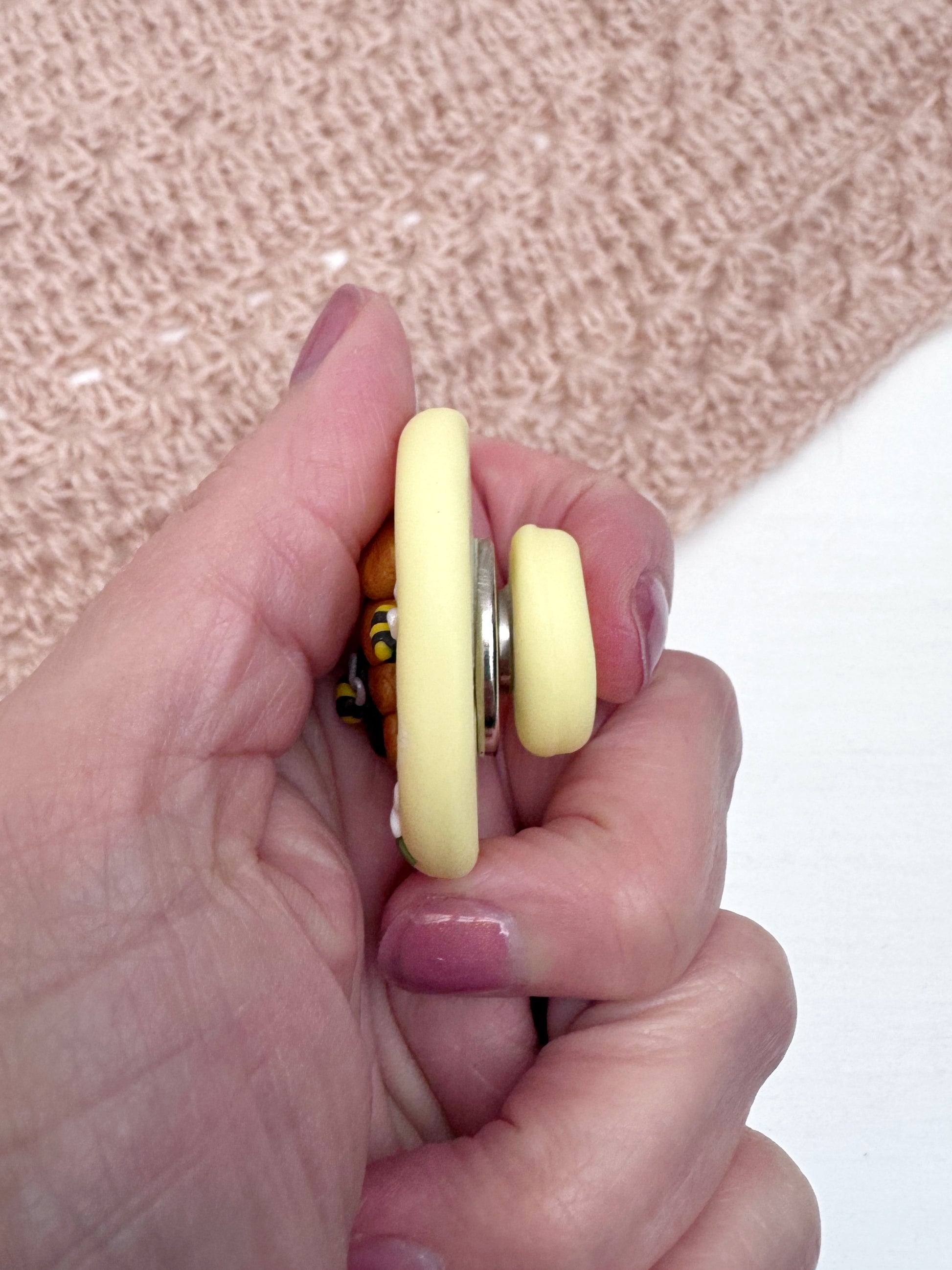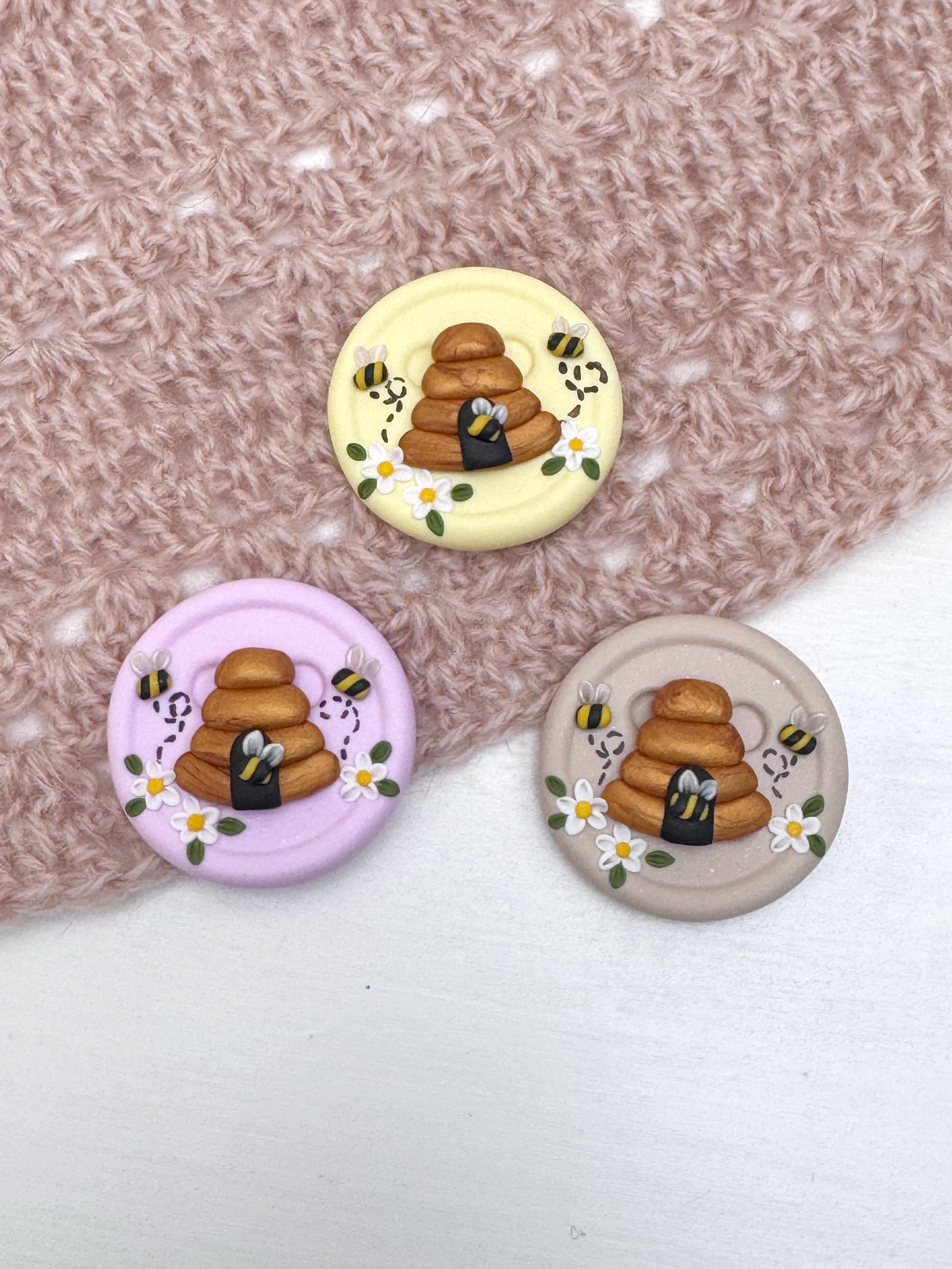 This design features a gorgeous hand shaped beehive on my signature button base. It even has some cute buzzing bees around it. It's a perfect sewing aid for a huge range of projects!