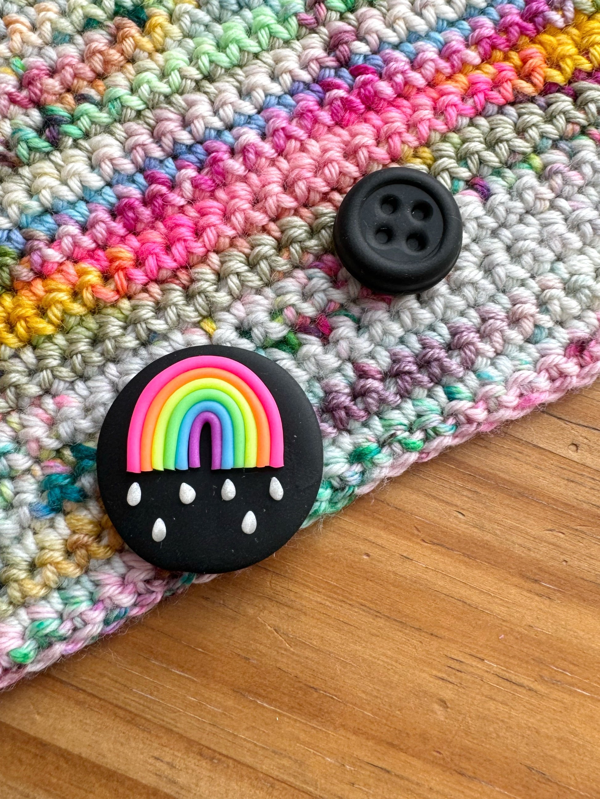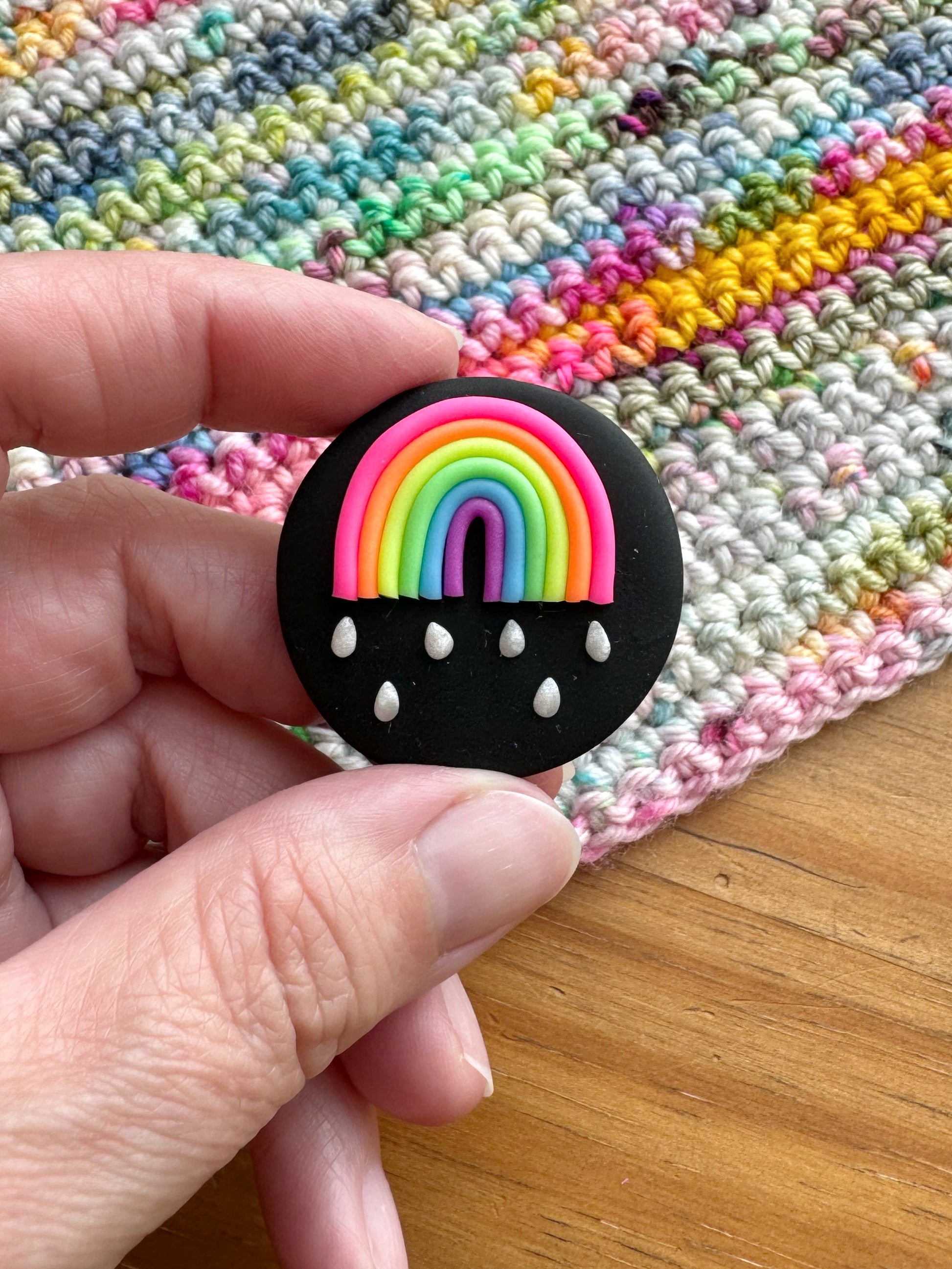 This needle minder features a hand shaped rainbow design on a round black polymer clay base. It is sure to brighten your day each time you use it!