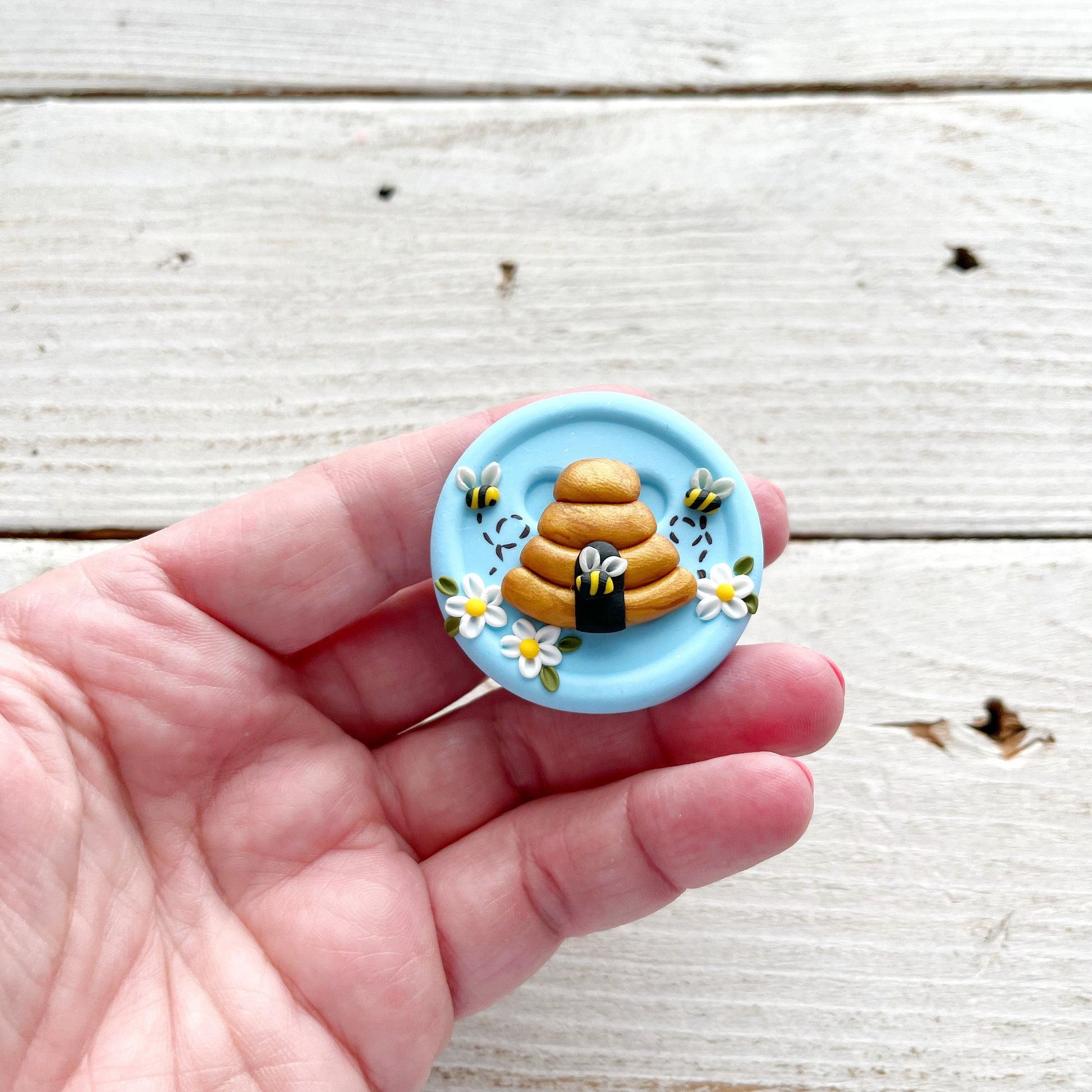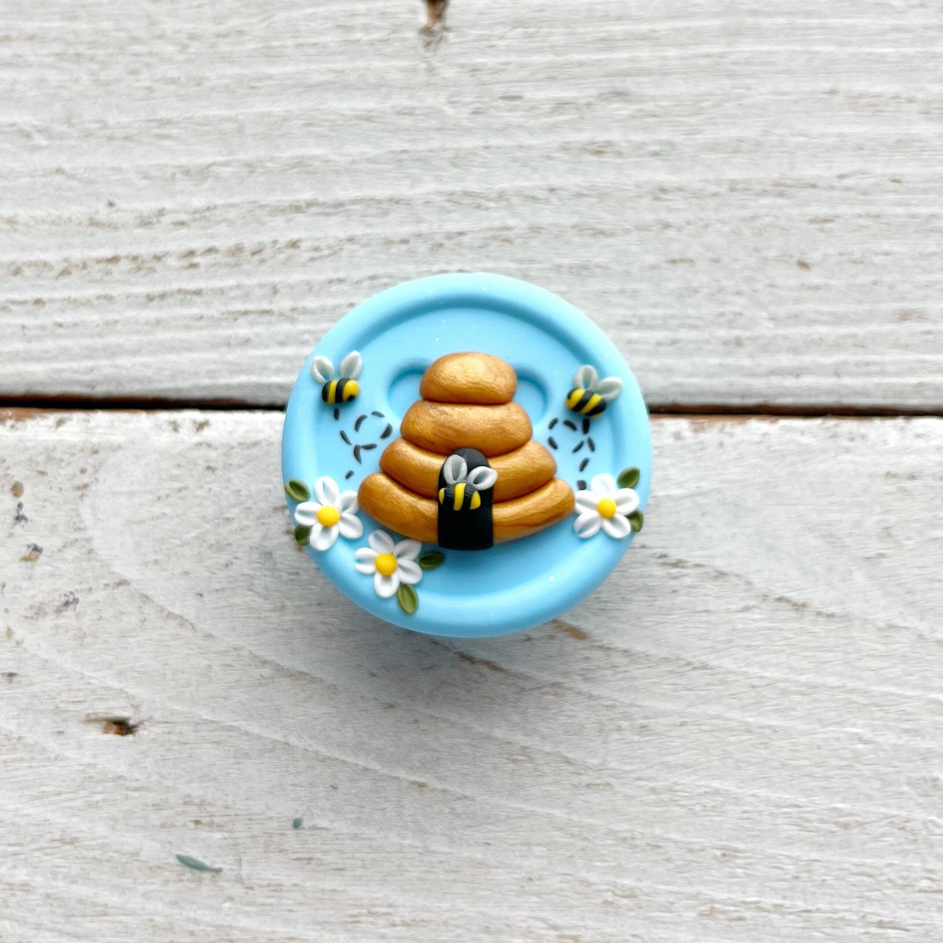 This design features a gorgeous hand shaped beehive on my signature button base in pale blue. It even has some cute buzzing bees around it. It's a perfect sewing aid for a huge range of projects!