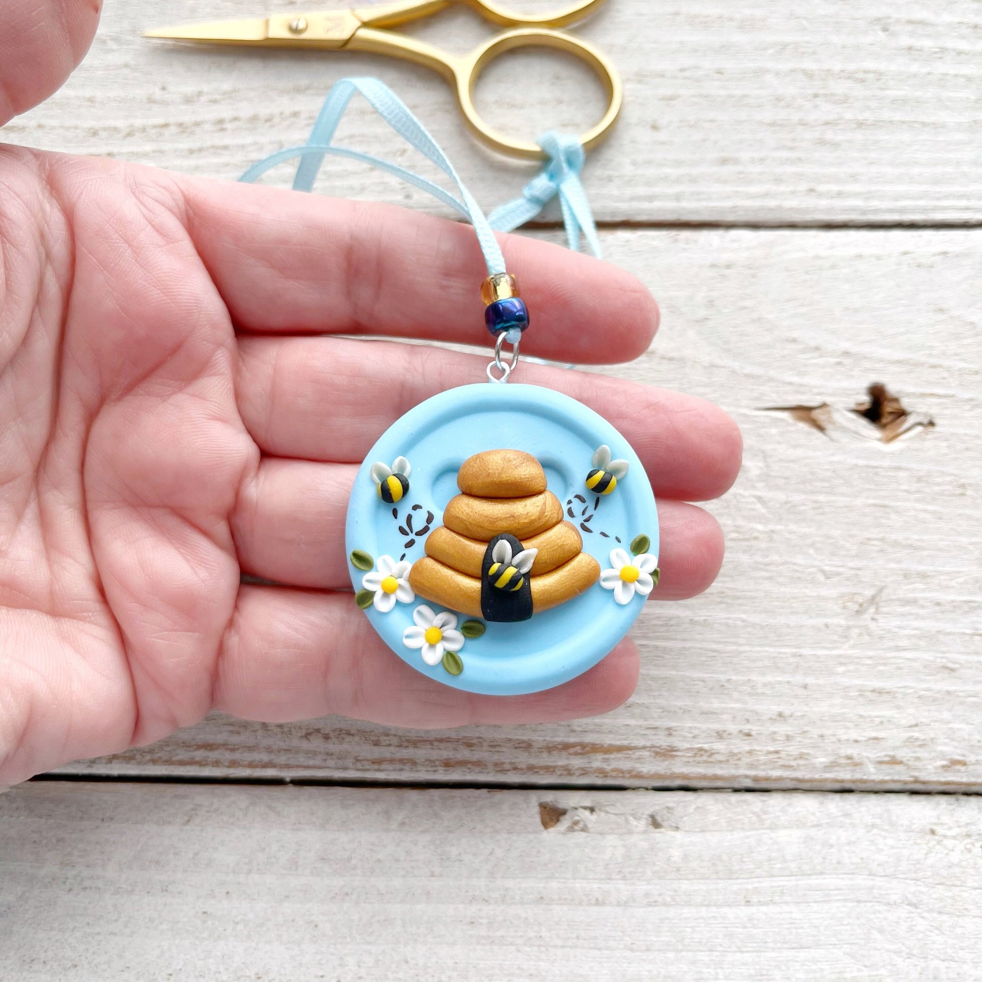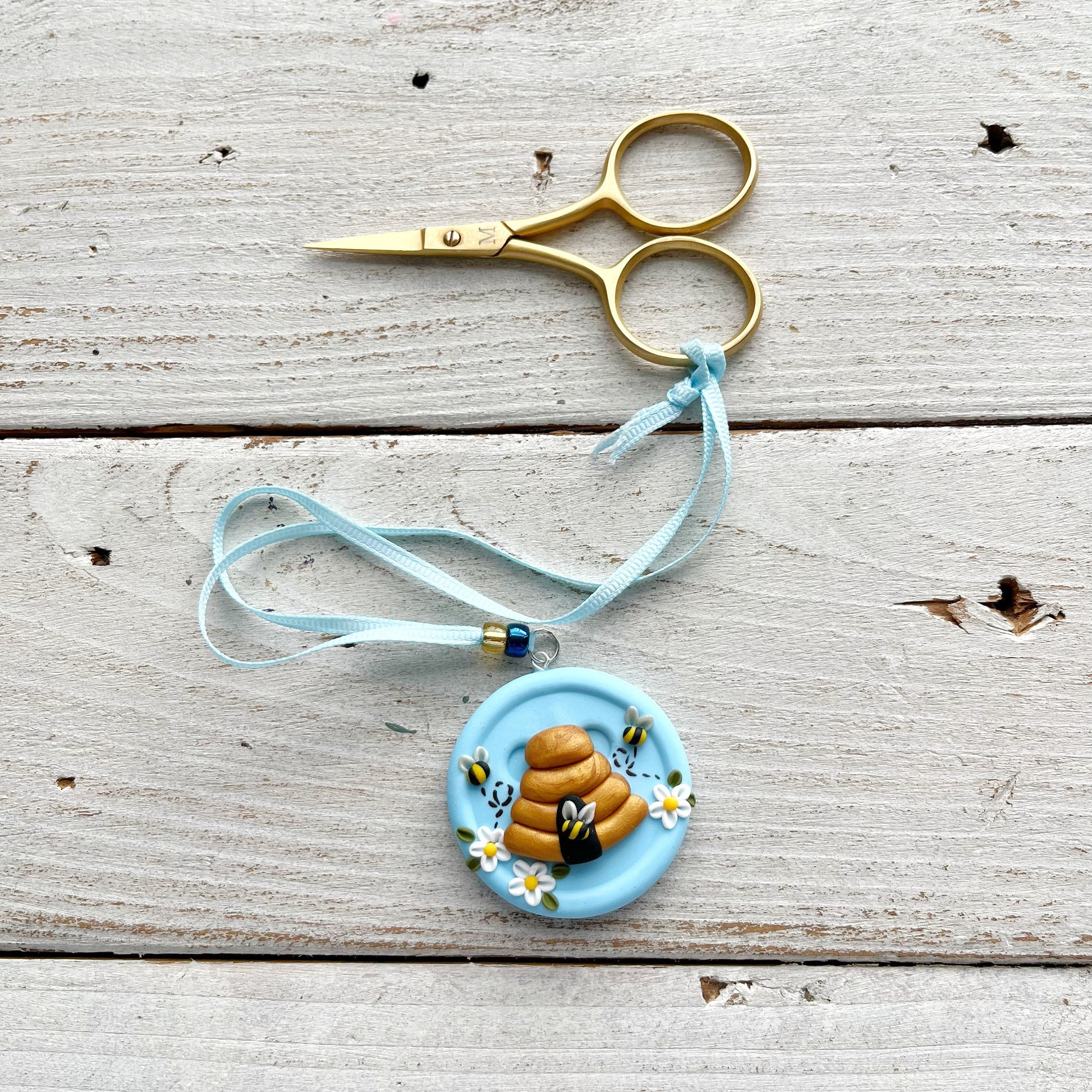 Pale blue beehive scissor fob, embroidery scissor keeper, bumble bee cross stitch embroidery tools