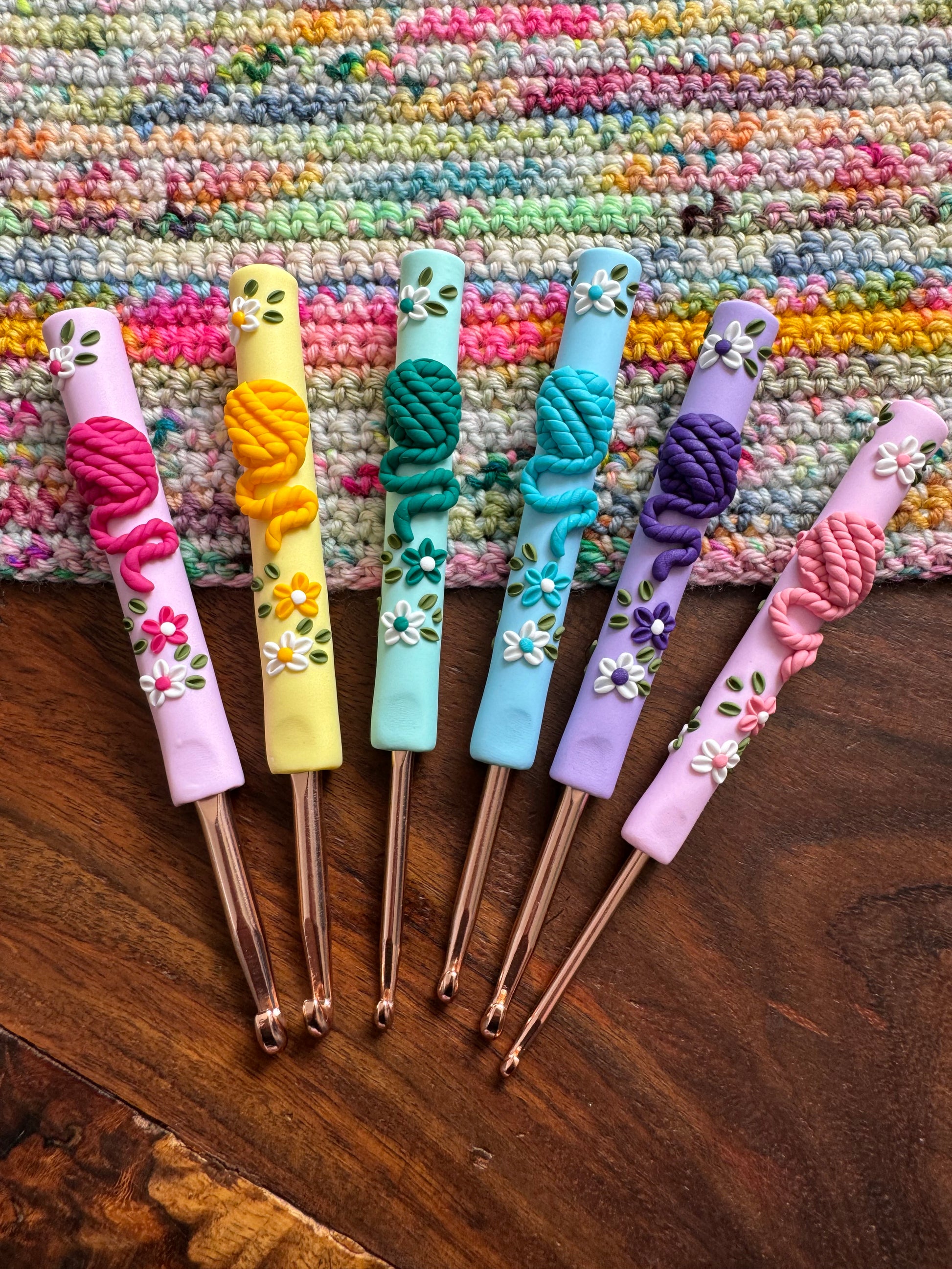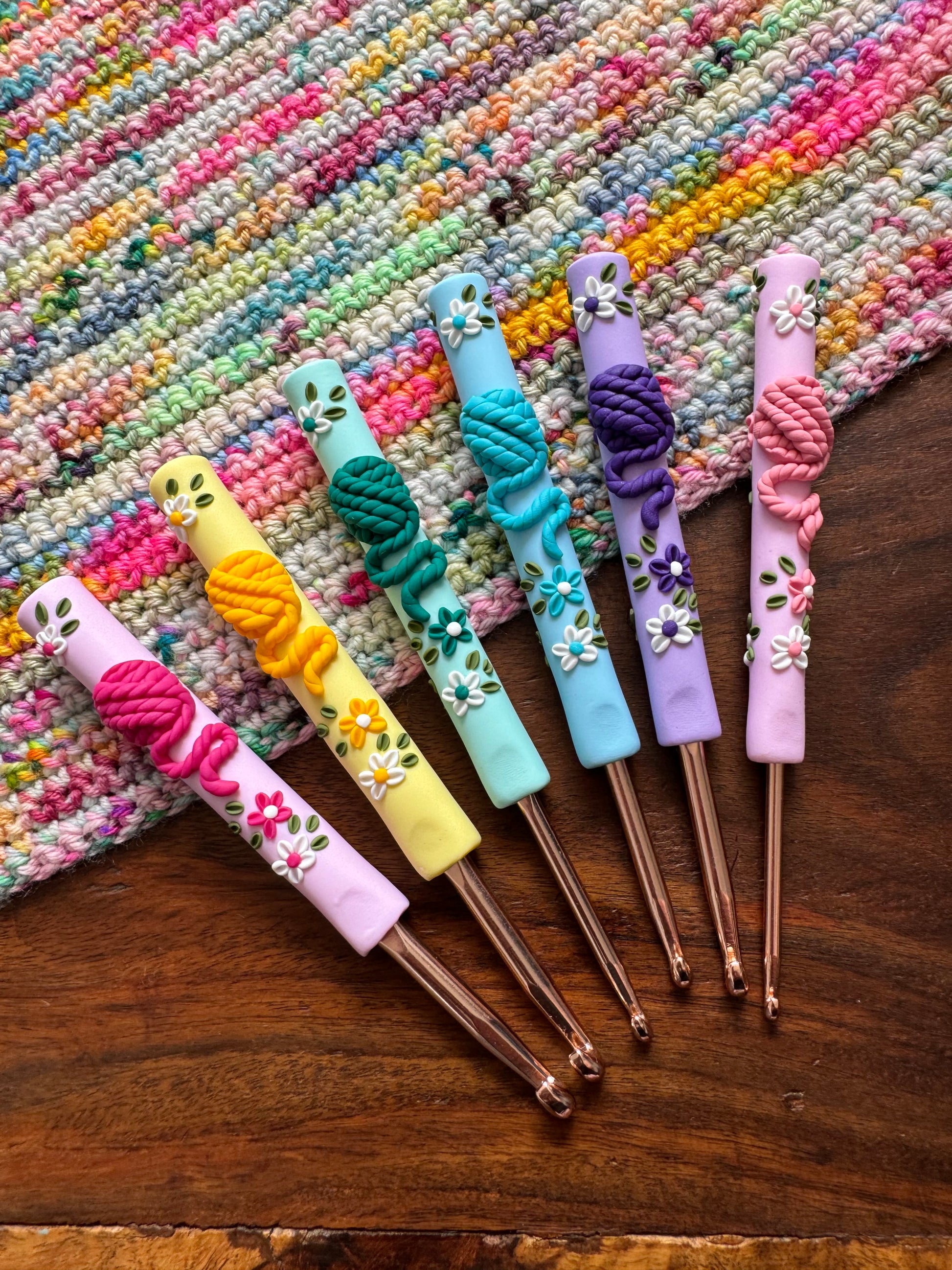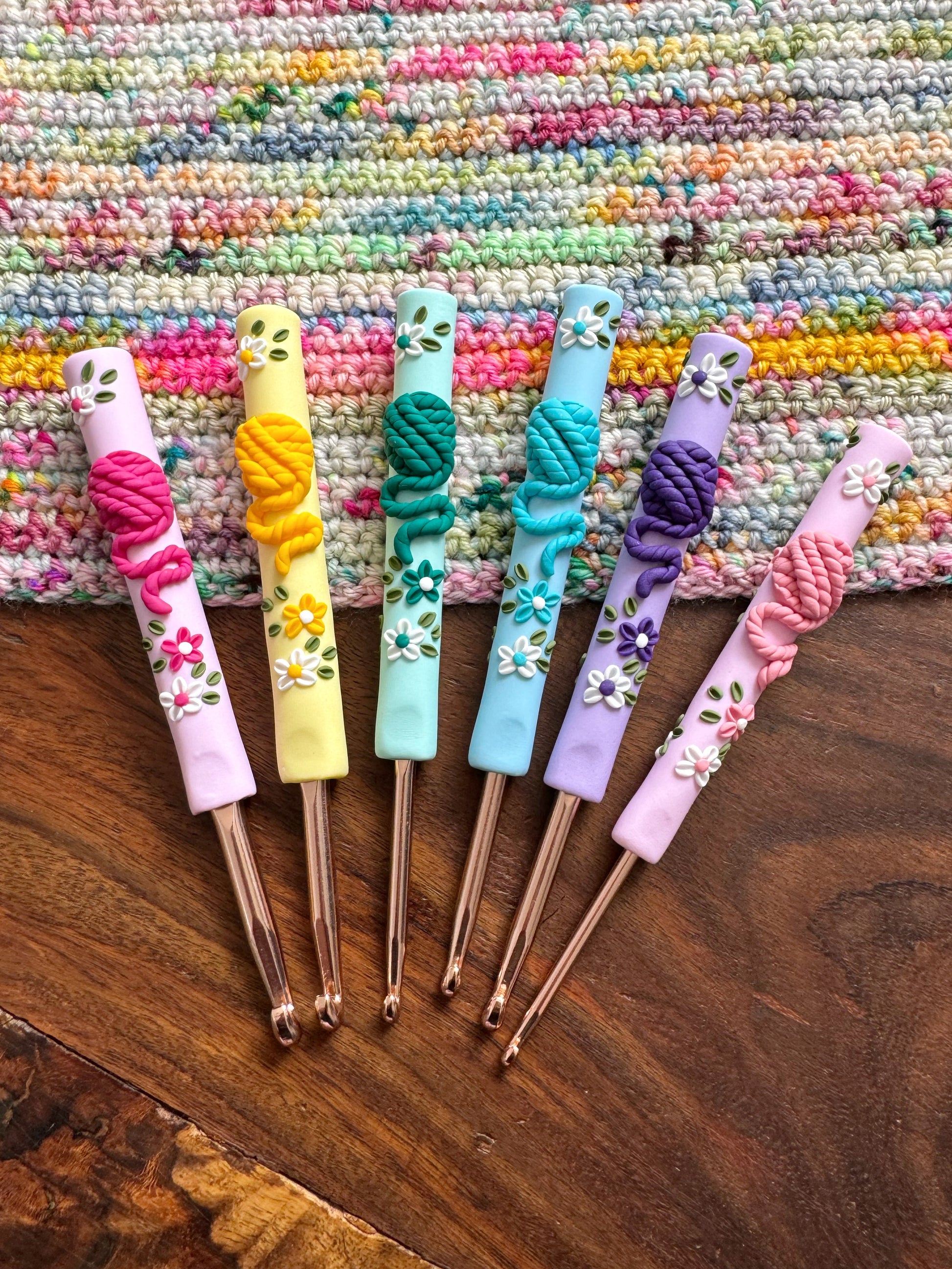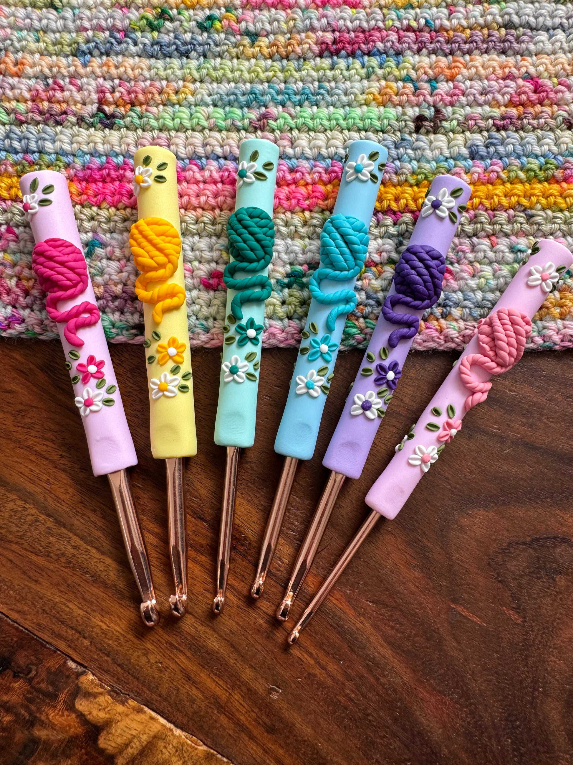 This is a tapered aluminium hook with a smooth polymer clay base. It features a cute yarn ball complete with my signature tiny flowers. Available in a selection of pastel rainbow colours, you can choose your yarn ball shade from the drop down menu. This listing is for 1 crochet hook, accessories shown are available separately. Base crochet hook colour will depend on availability at the time of ordering.