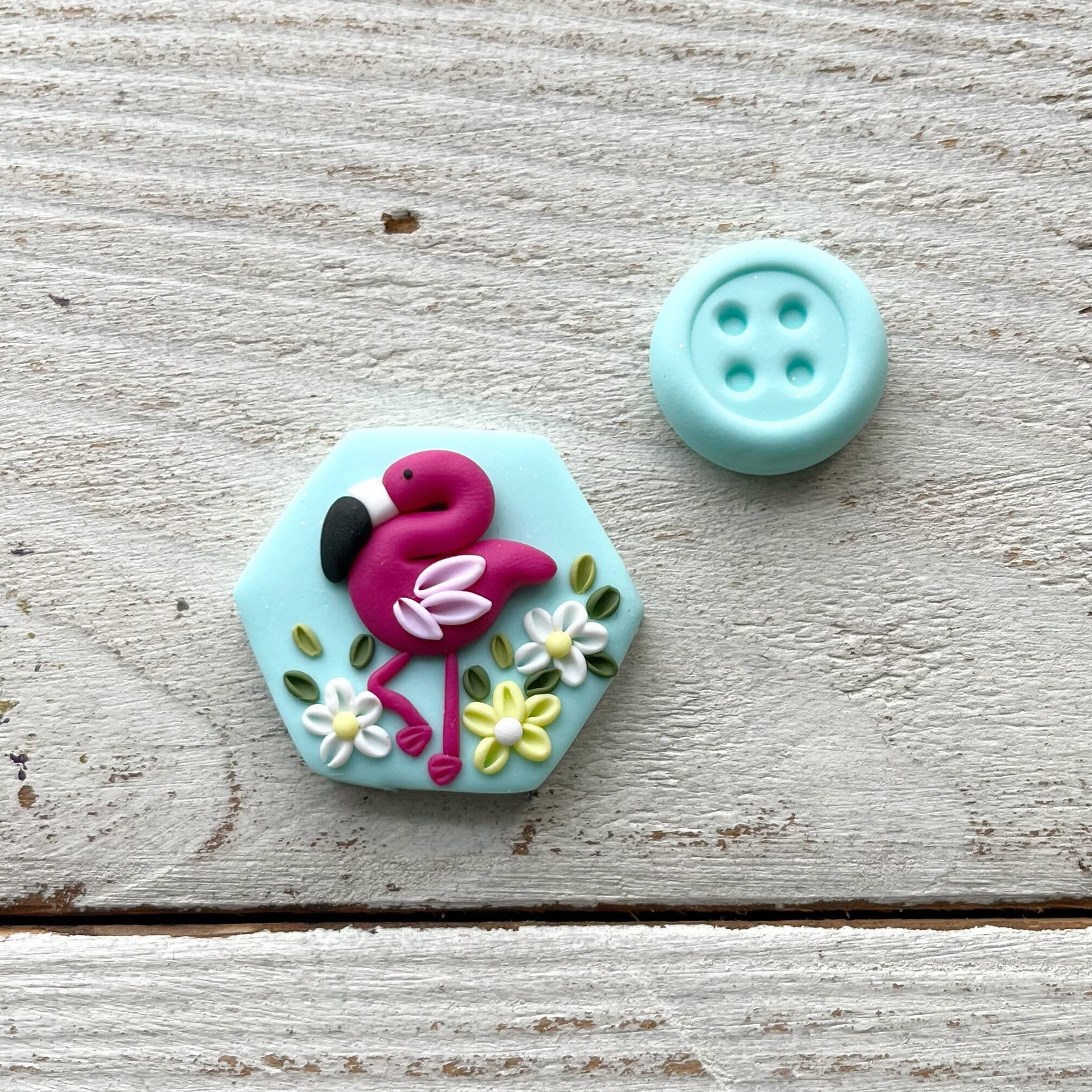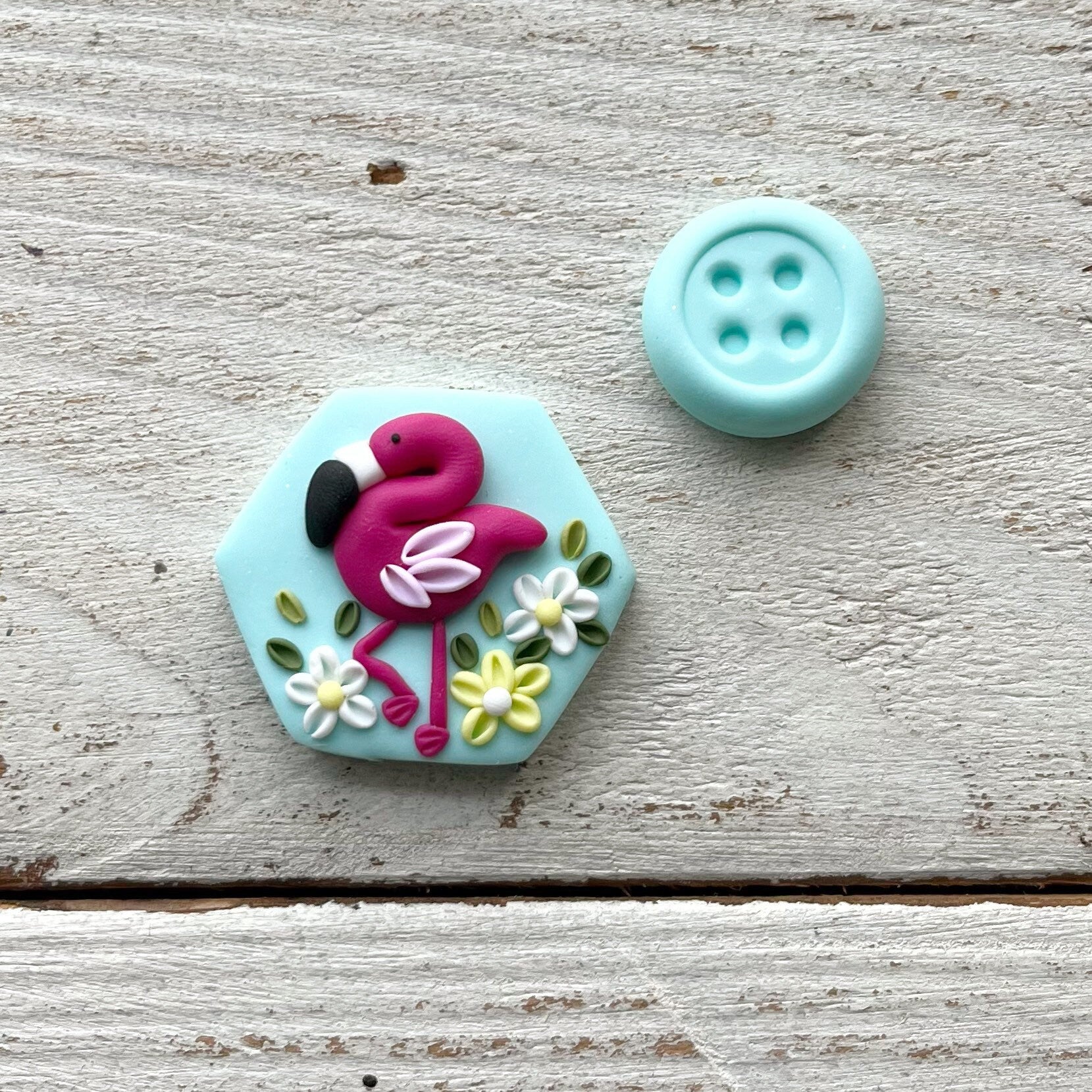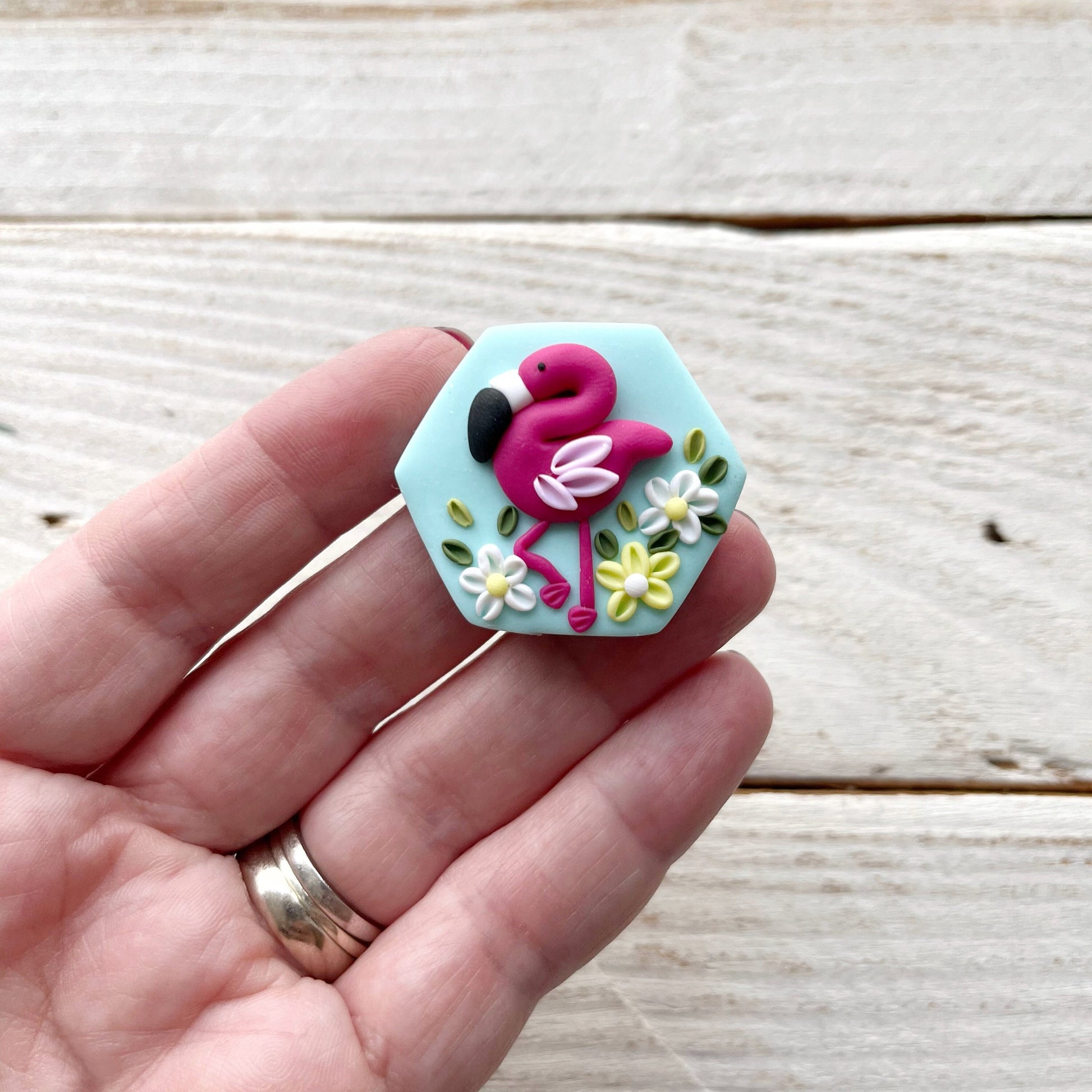 This needle minder features a cute, hand shaped pink flamingo on a mint hexagon base. It’s finished off with my signature tiny flowers. This needle minder is 4cm wide and a little over 3cm from top to bottom.