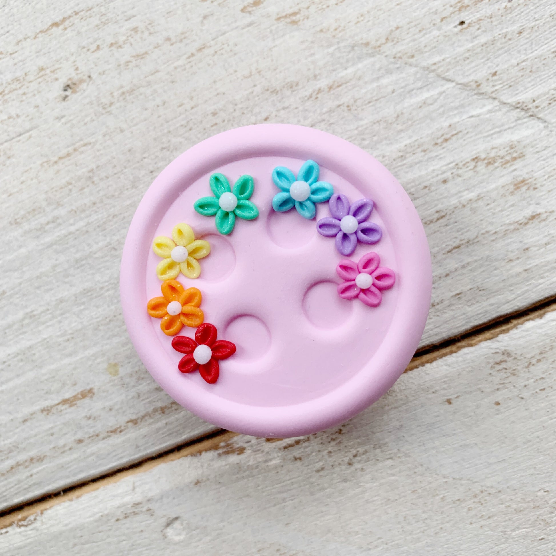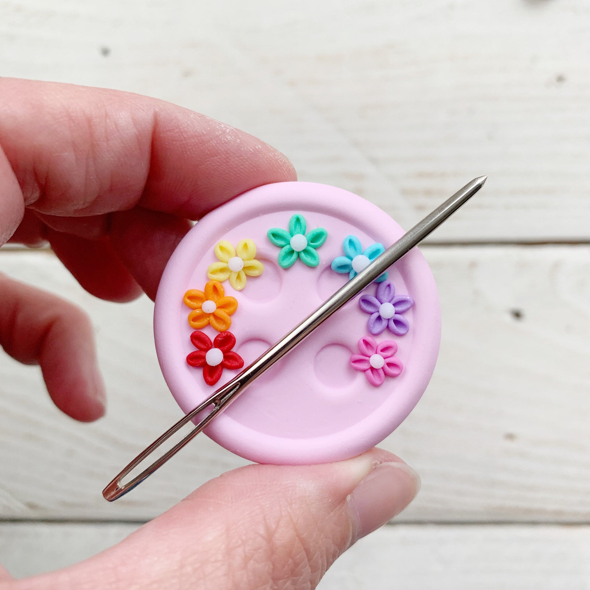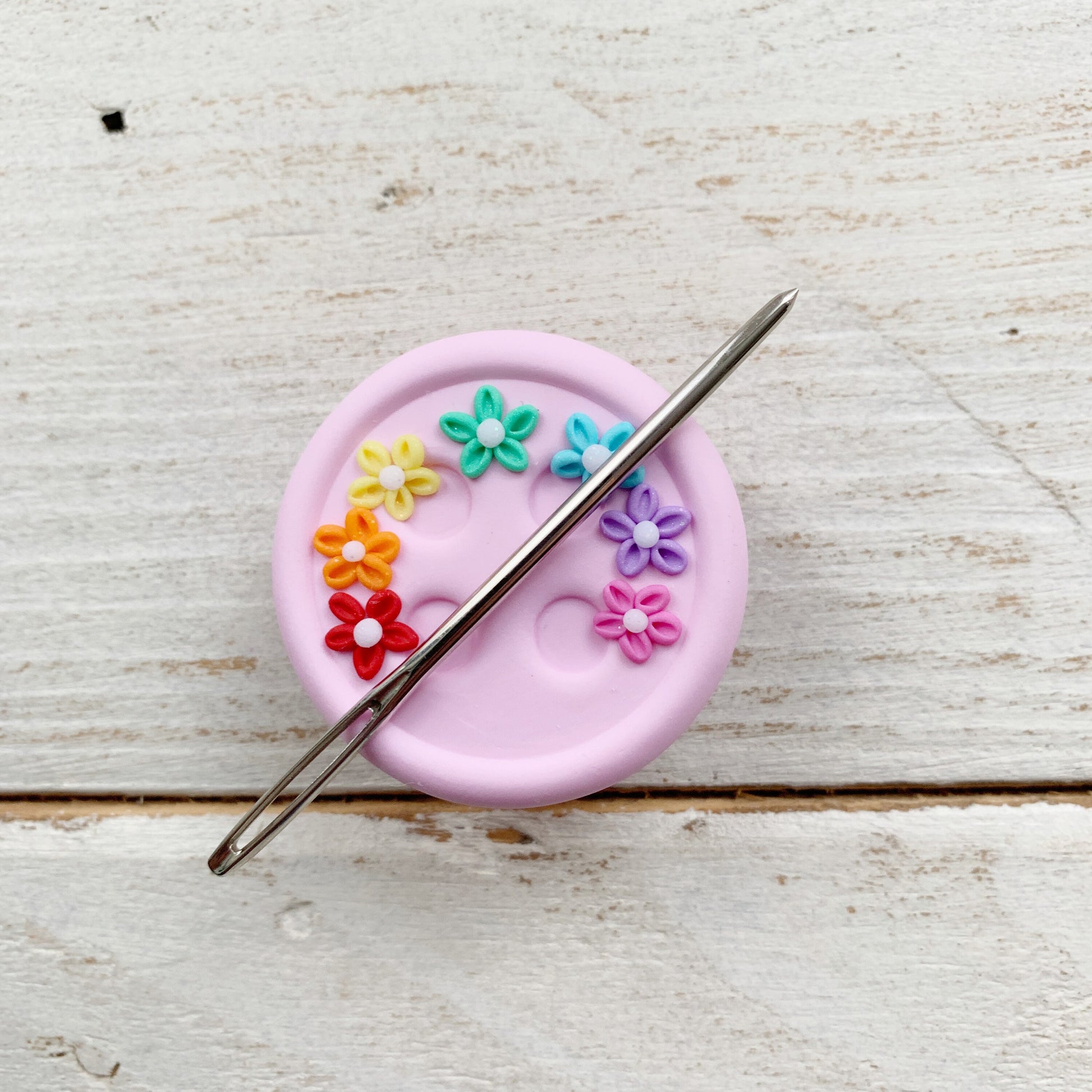 This needle minder features my signature 2” button base in pale pink. The flower design is all shaped by hand to create something pretty and unique that you will love to use.