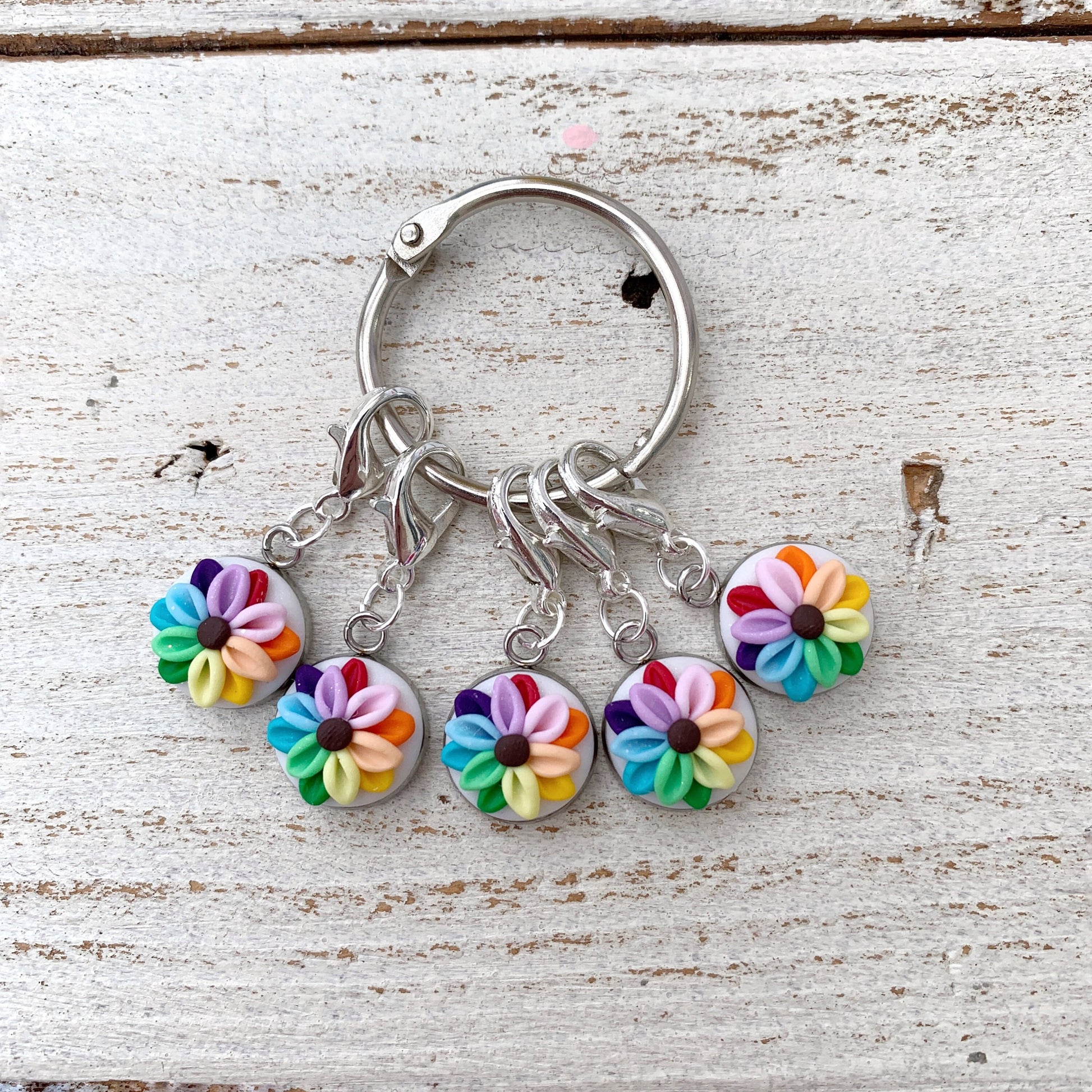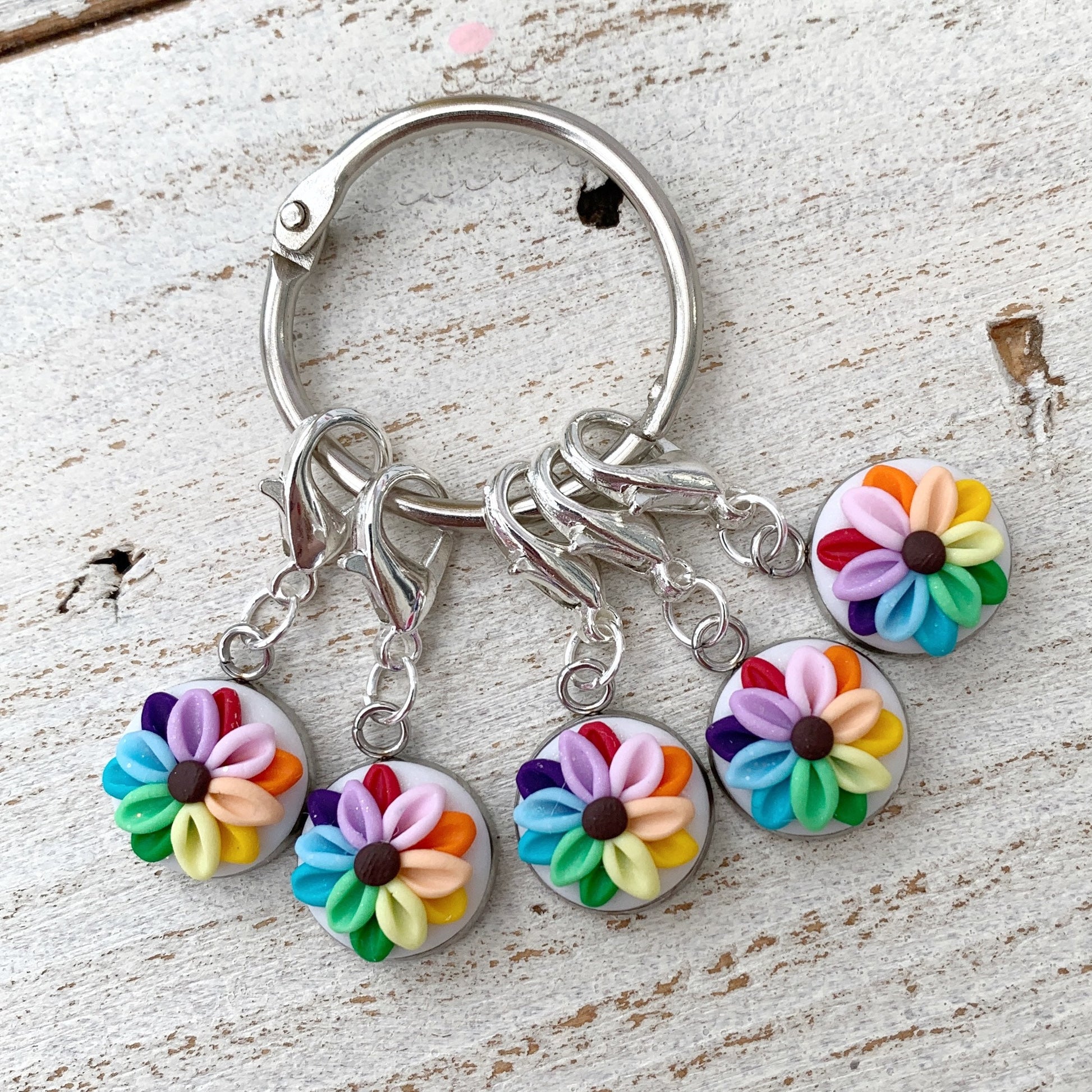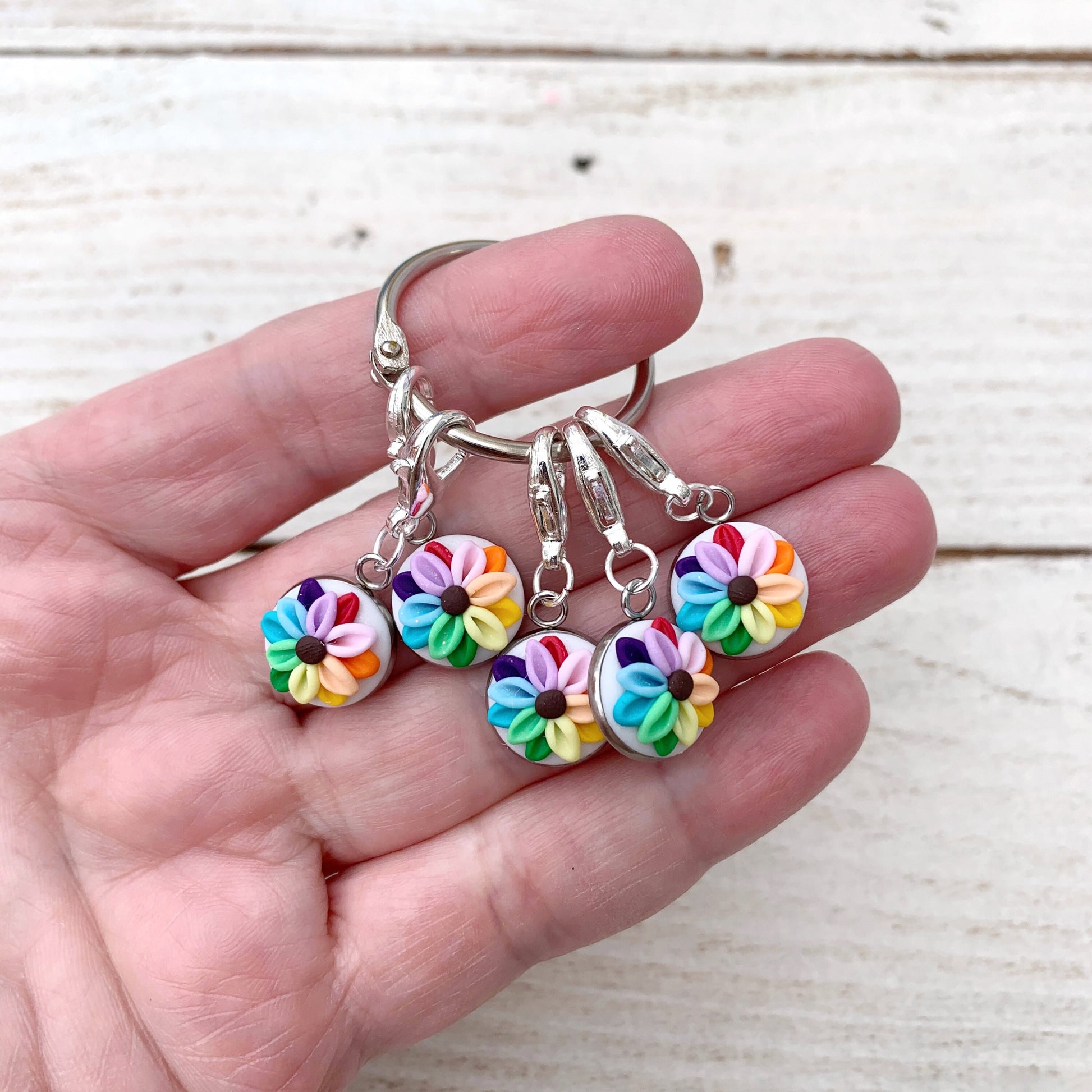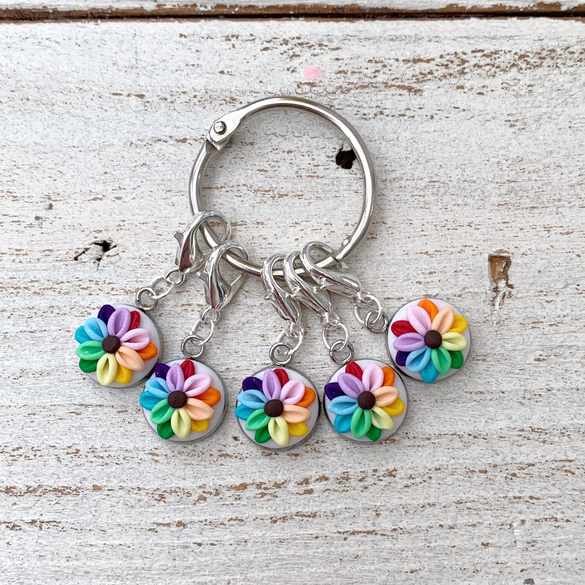 rainbow flower stitch markers, crochet progress keepers, gift for a crafter, polymer clay charms