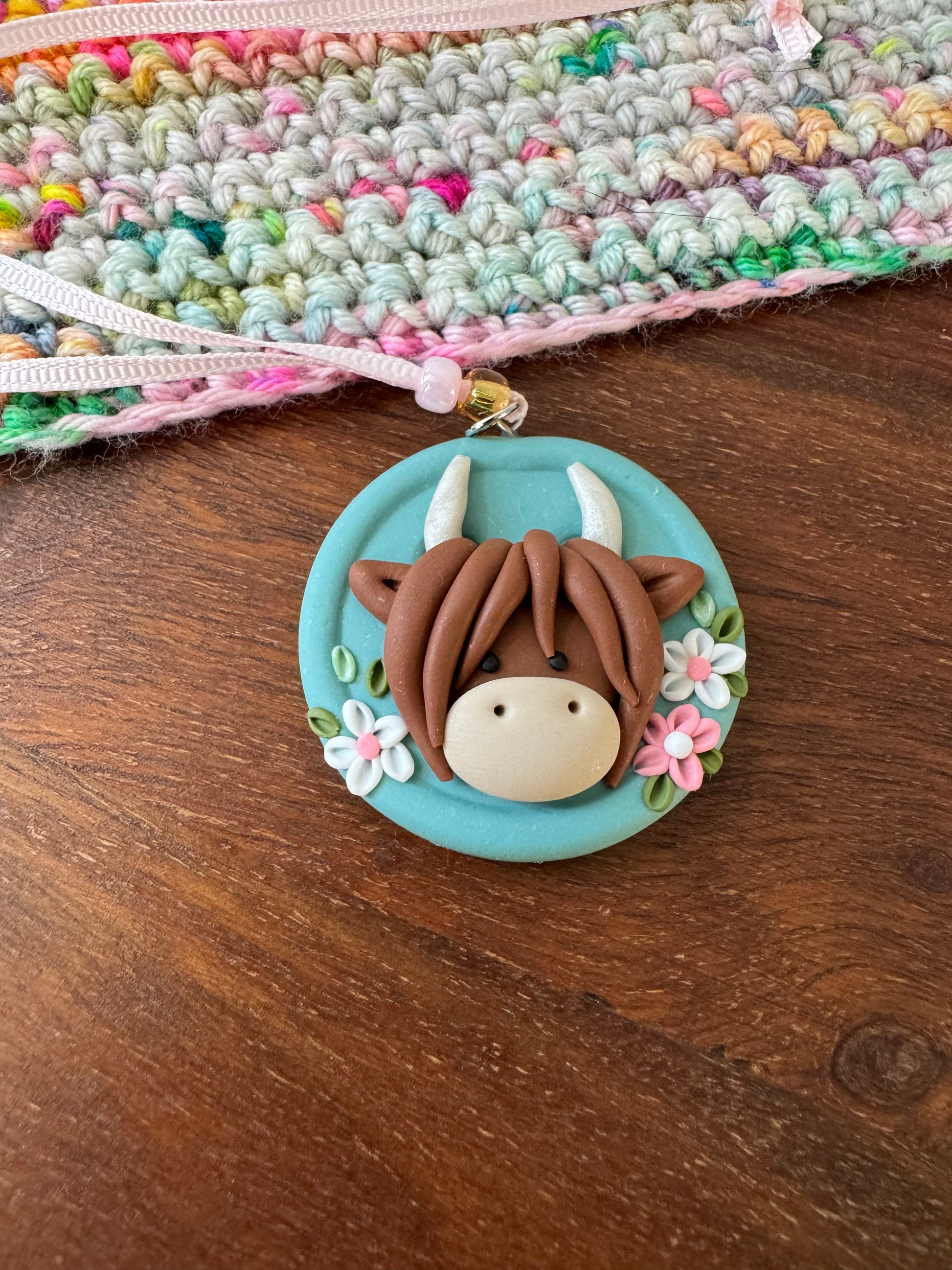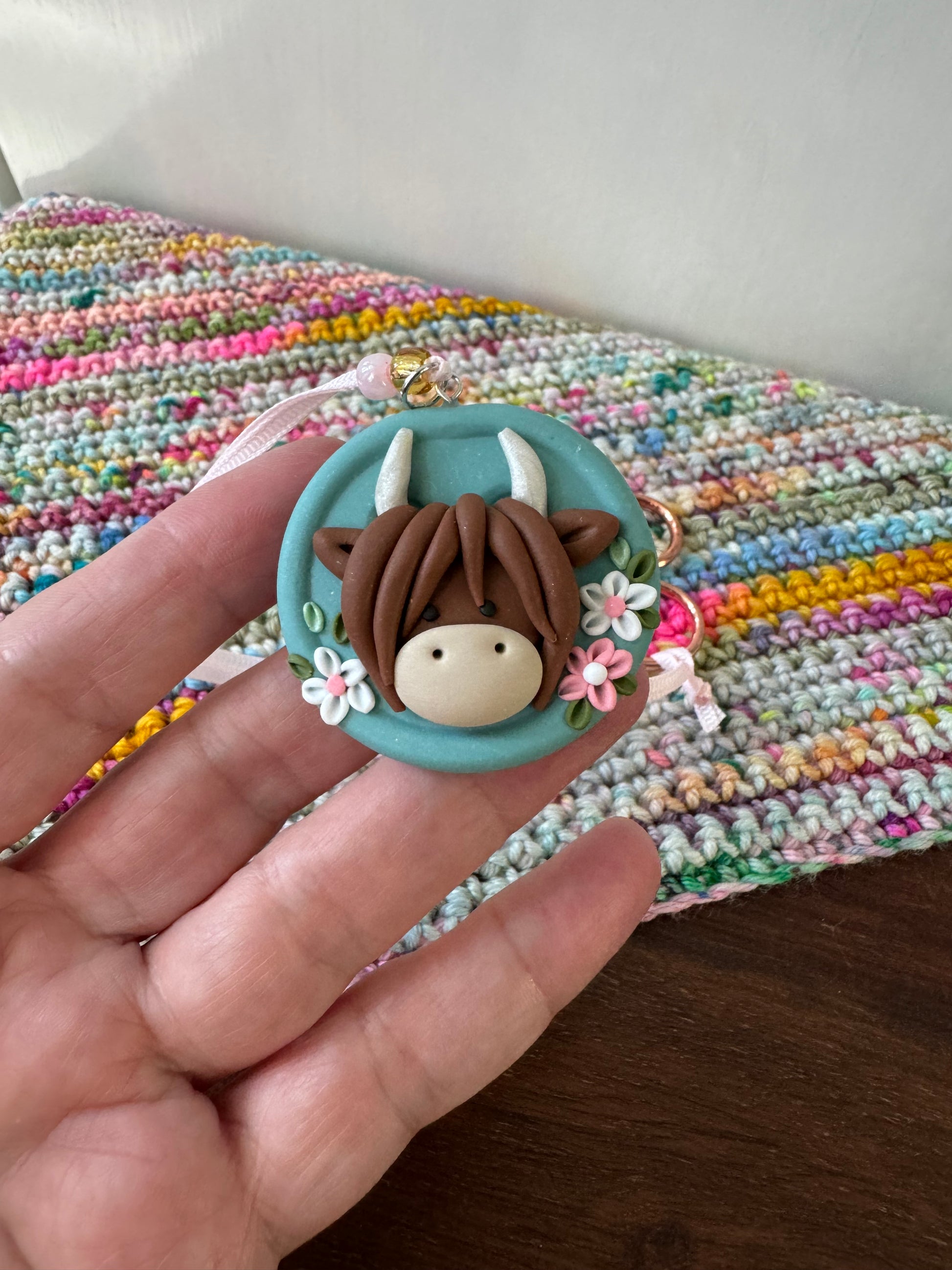 This fob features my 2” button base in sea green. The cute highland cow, tiny flowers and leaves are all shaped by hand to make something special that will be a joy to use.