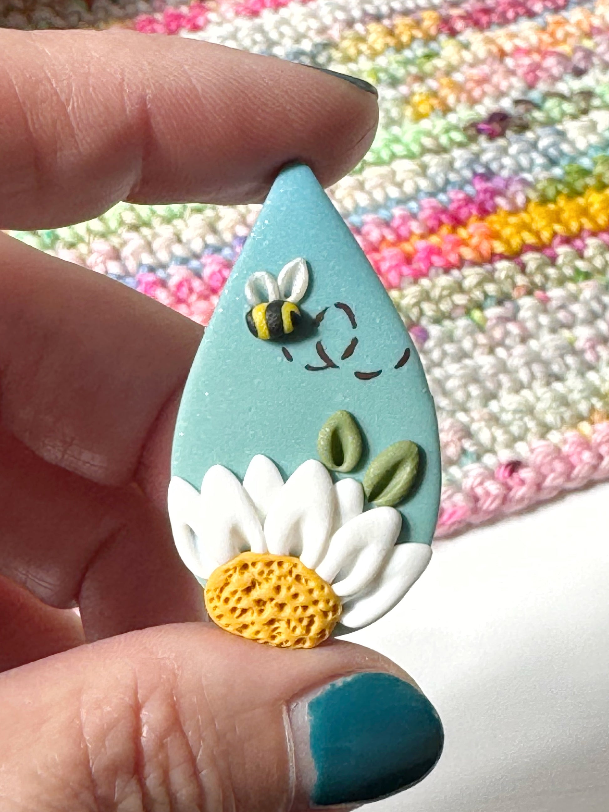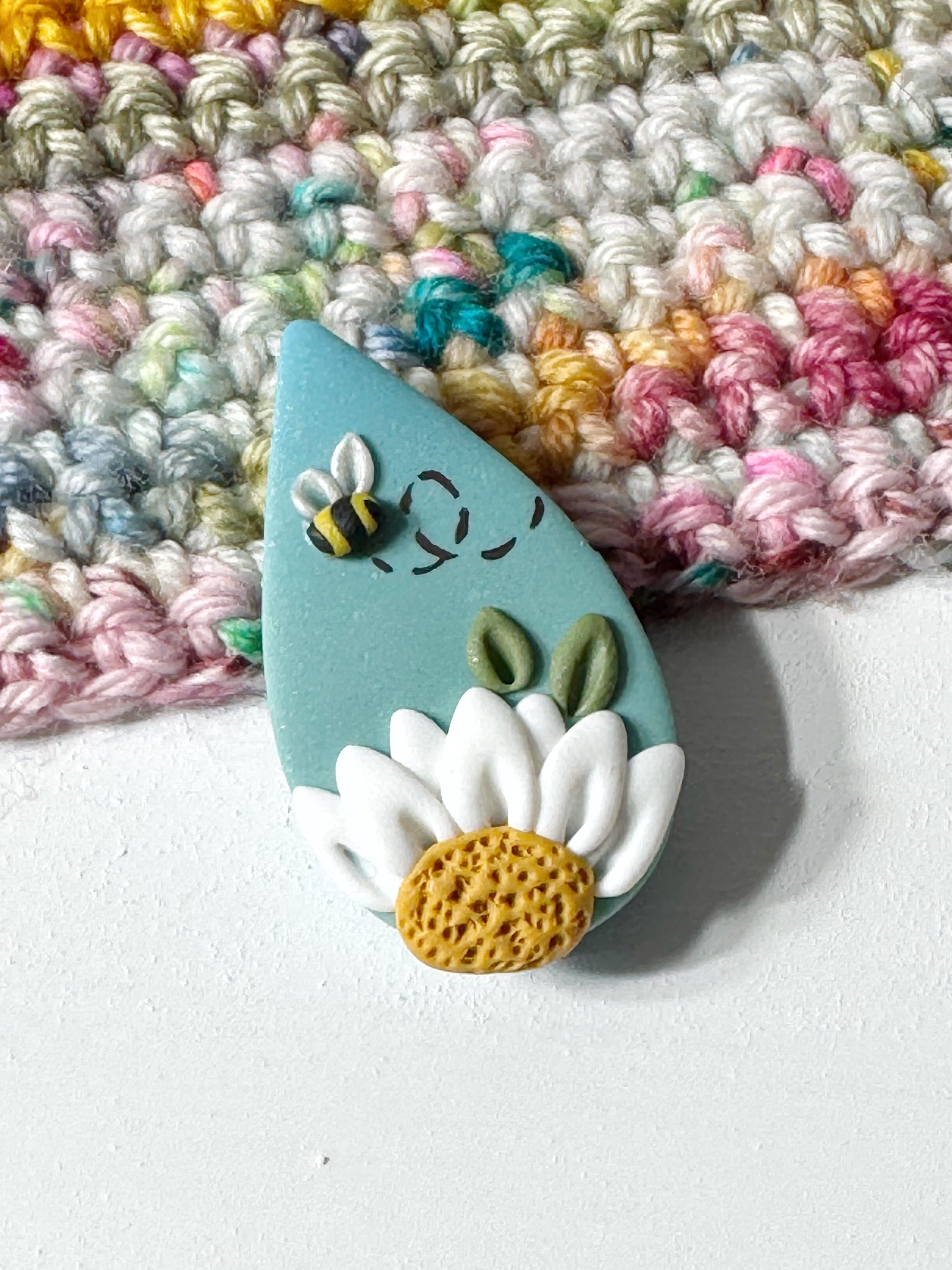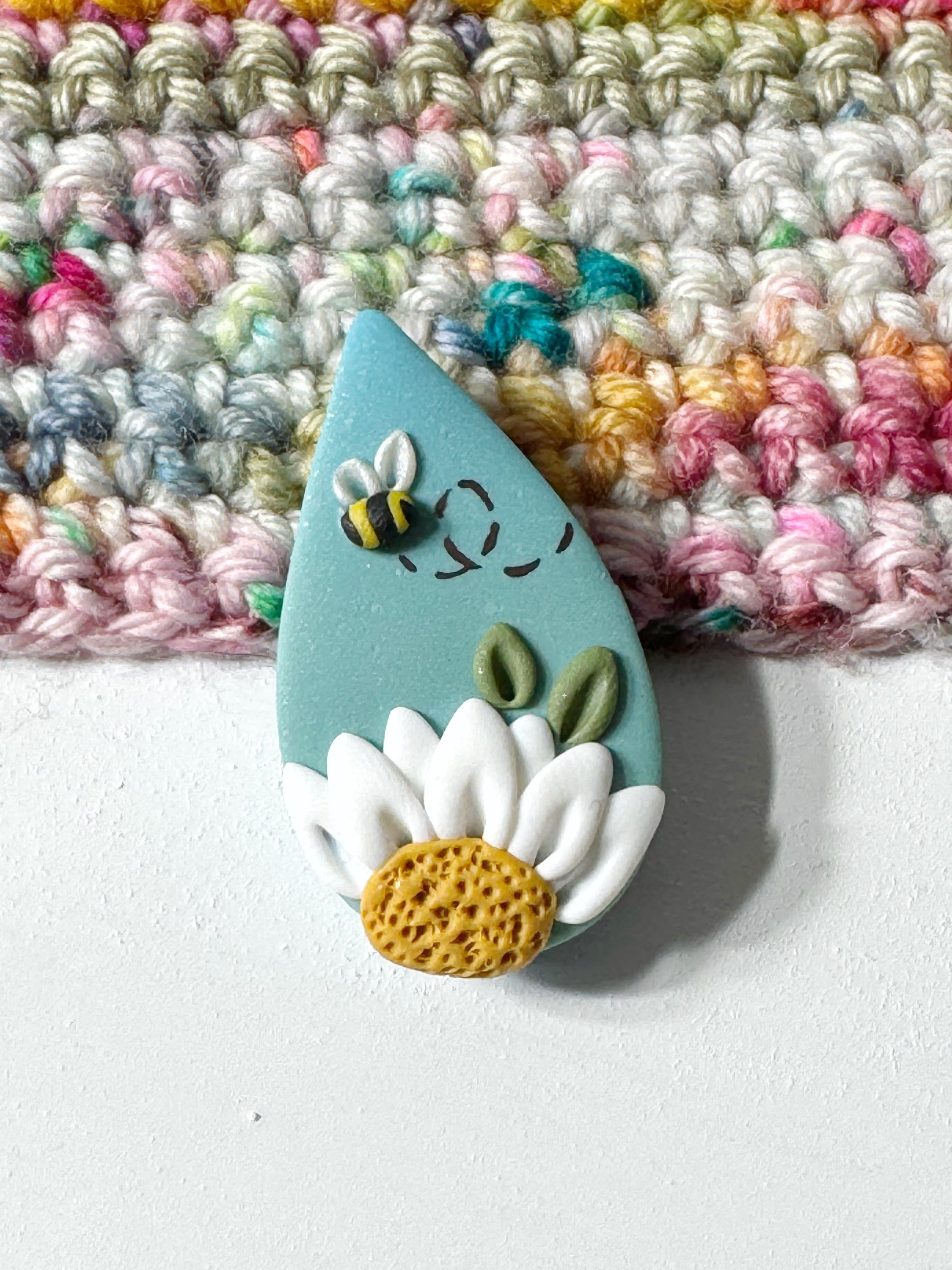 This polymer clay needle minder is around 4.5 cm long and 2.5cm wide. It features a hand shaped daisy design on an ombré base. Each one is finished with a tiny bumble bee and hand painted bee trails.
