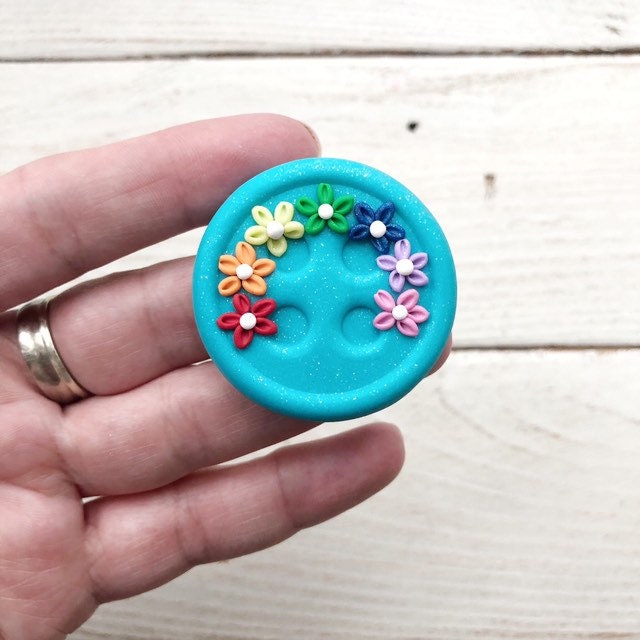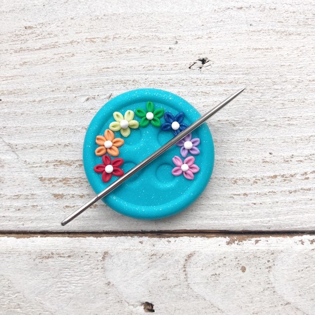 This needle minder features my signature 2” button base. The flower design is all shaped by hand to create something pretty and unique that you will love to use.