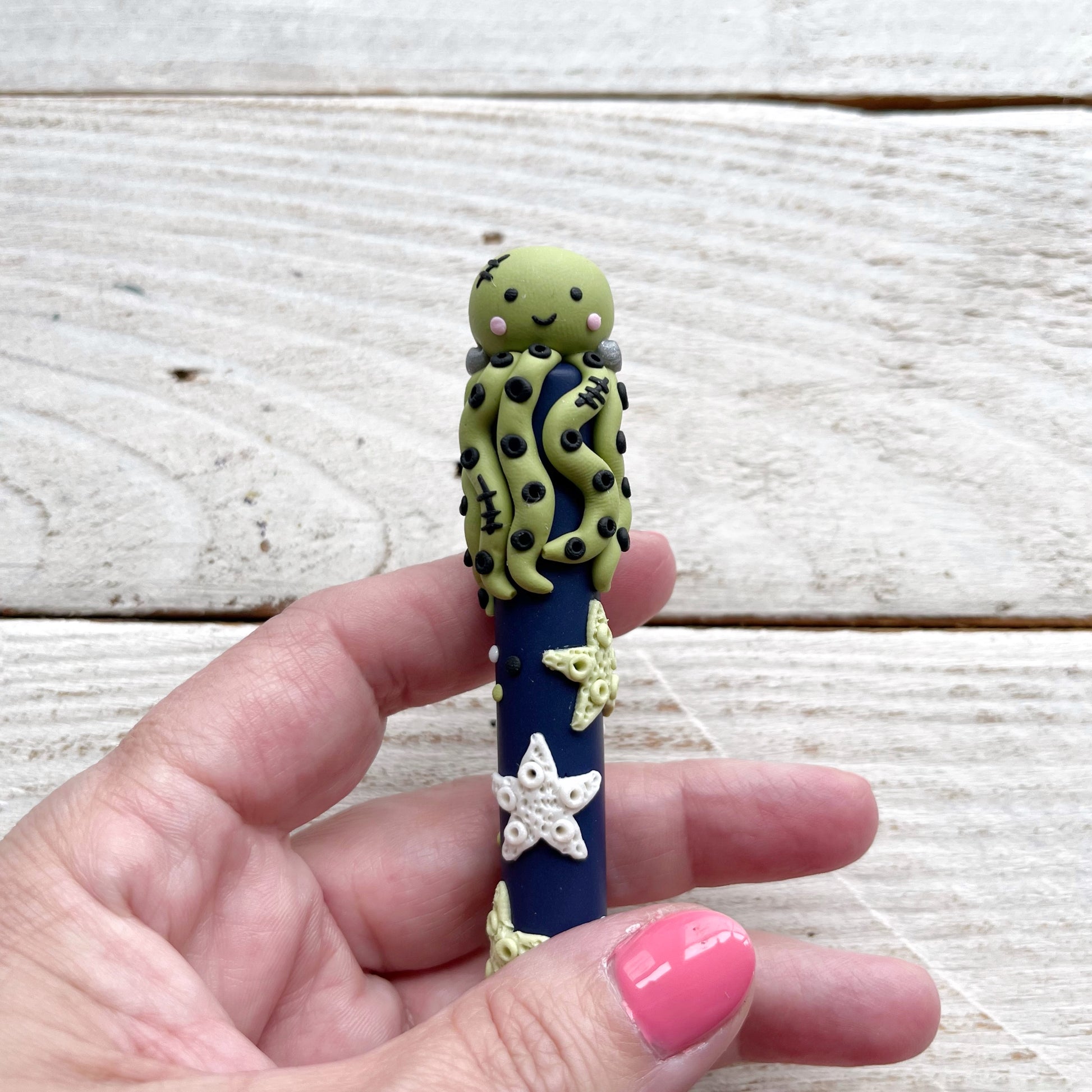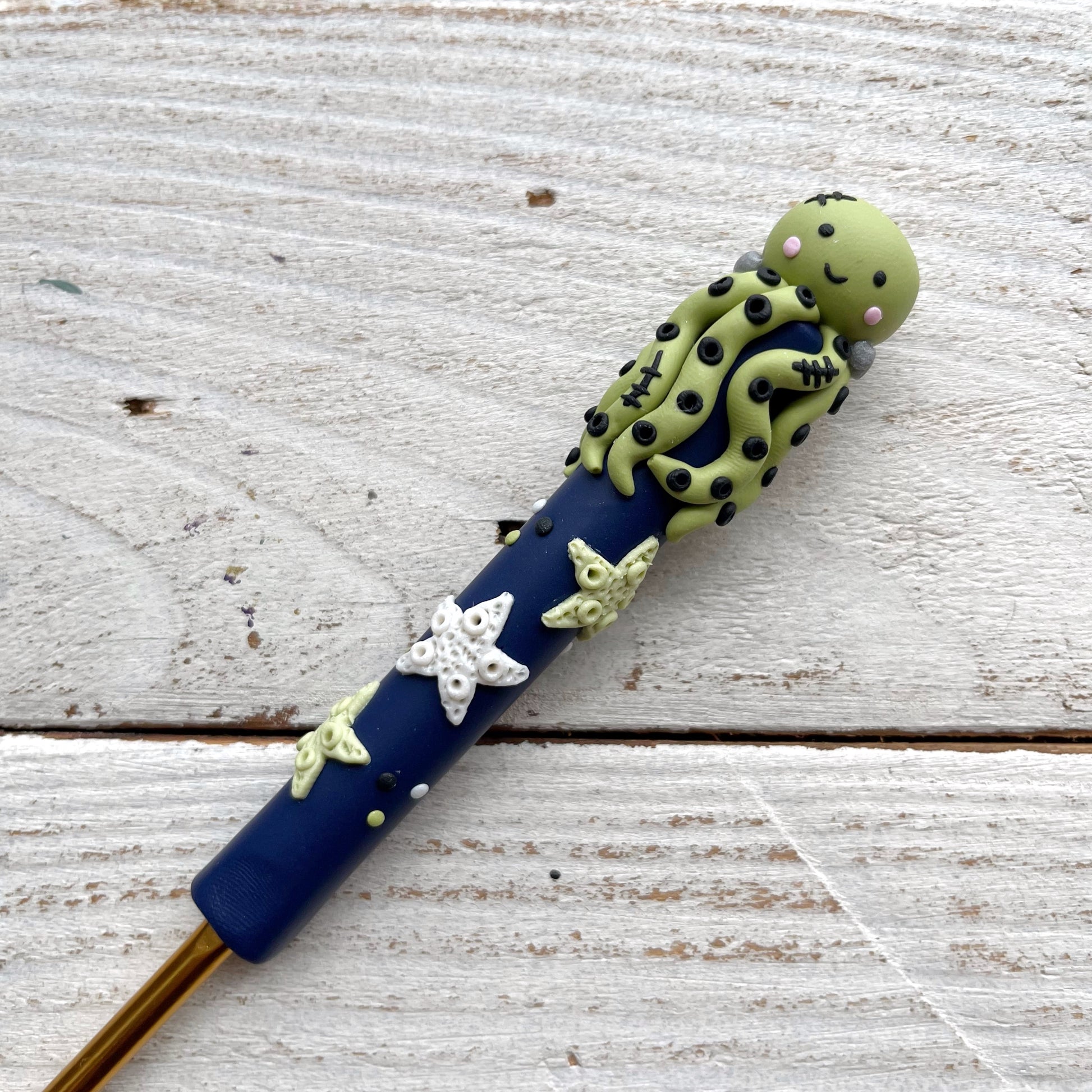 This hook features a smooth navy base with a hand shaped green octopus complete with black accents.