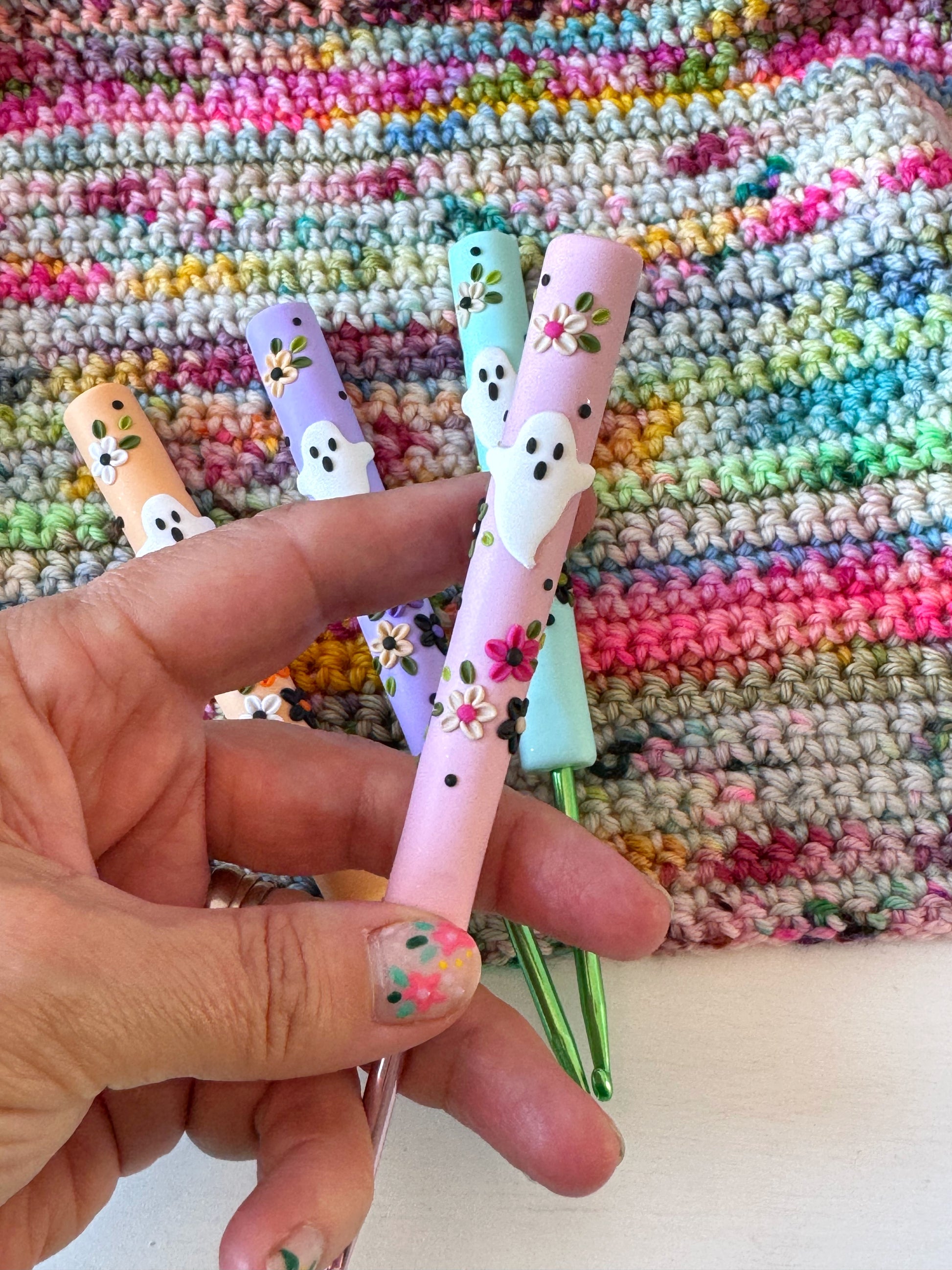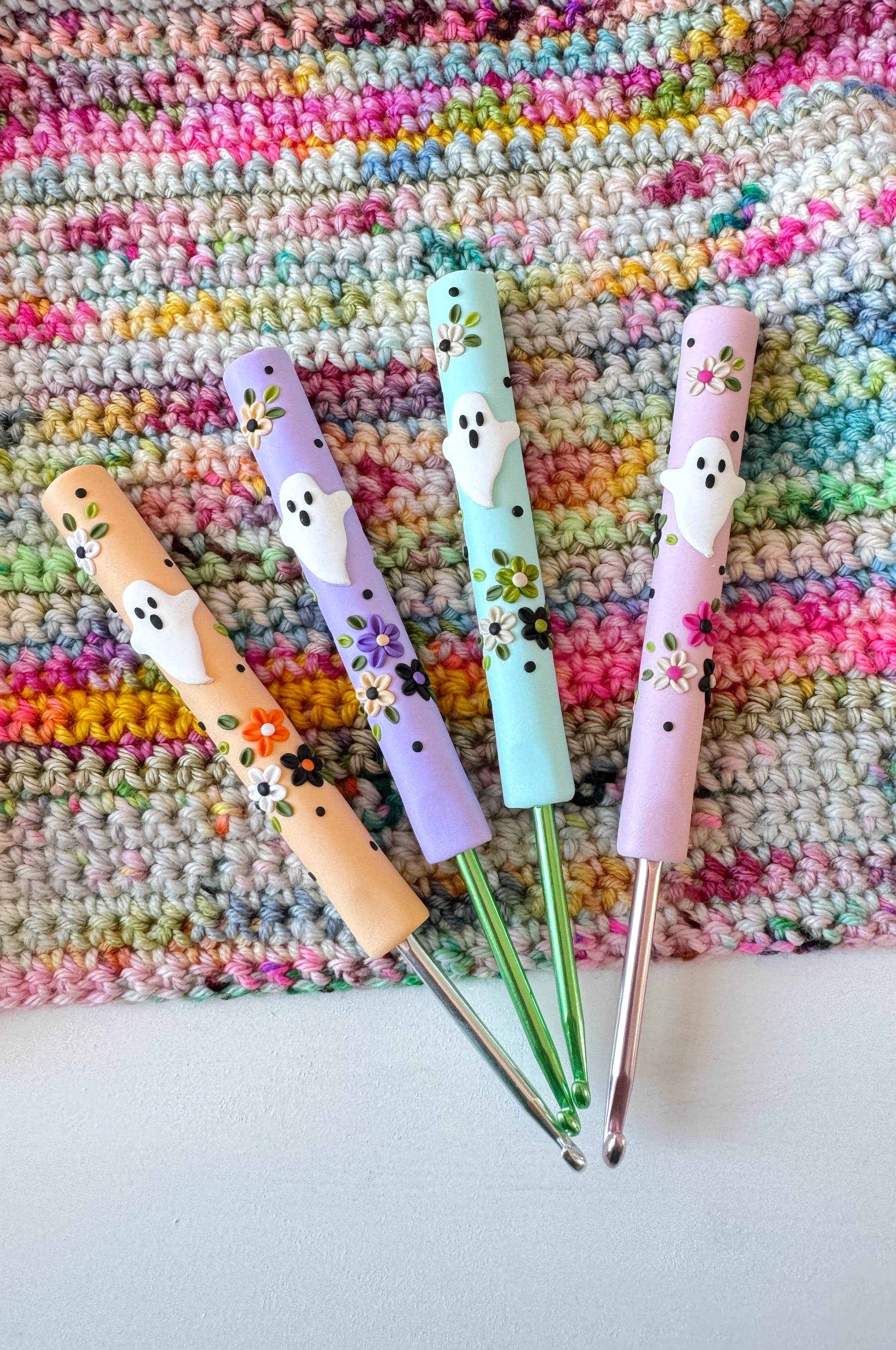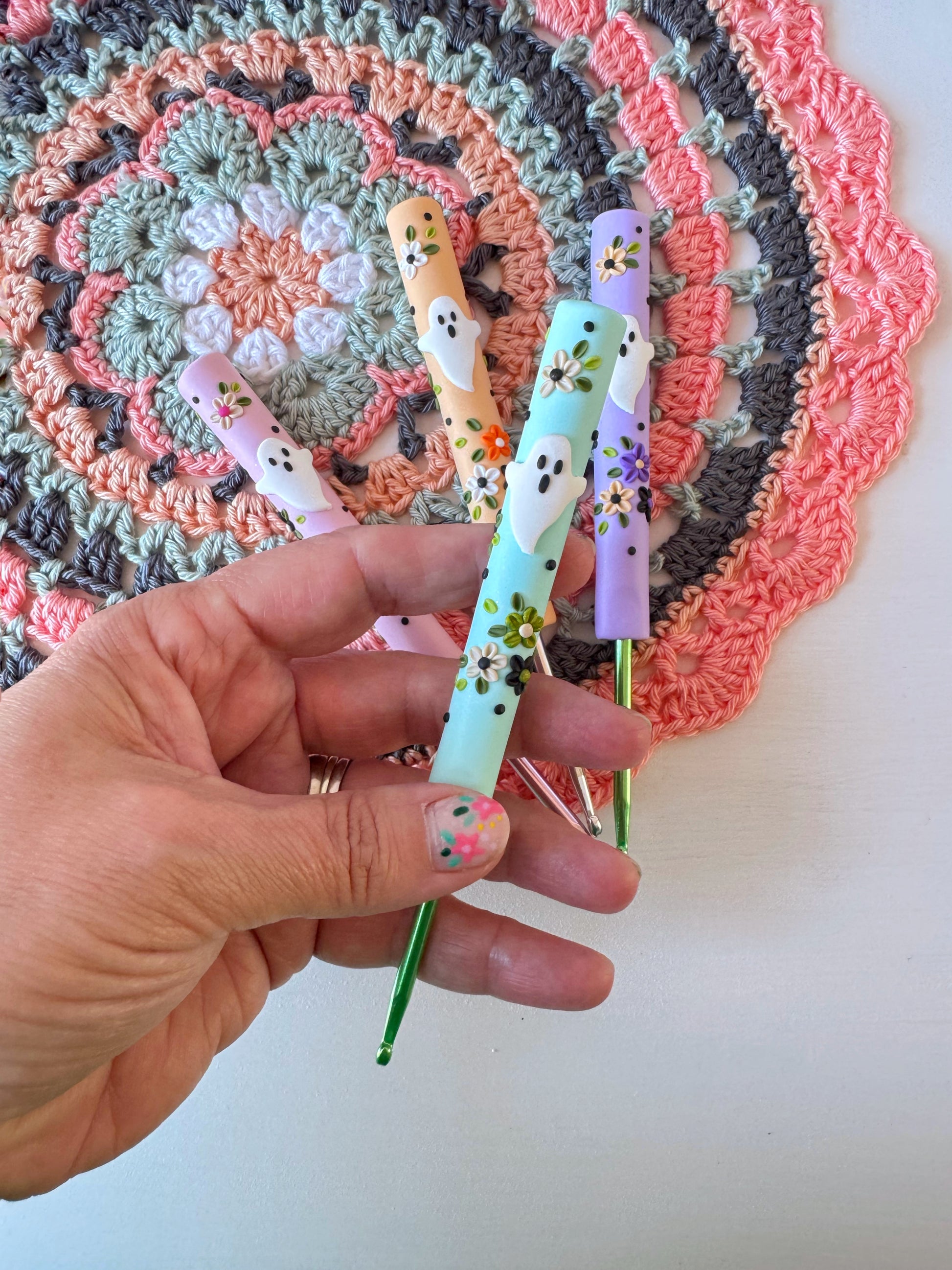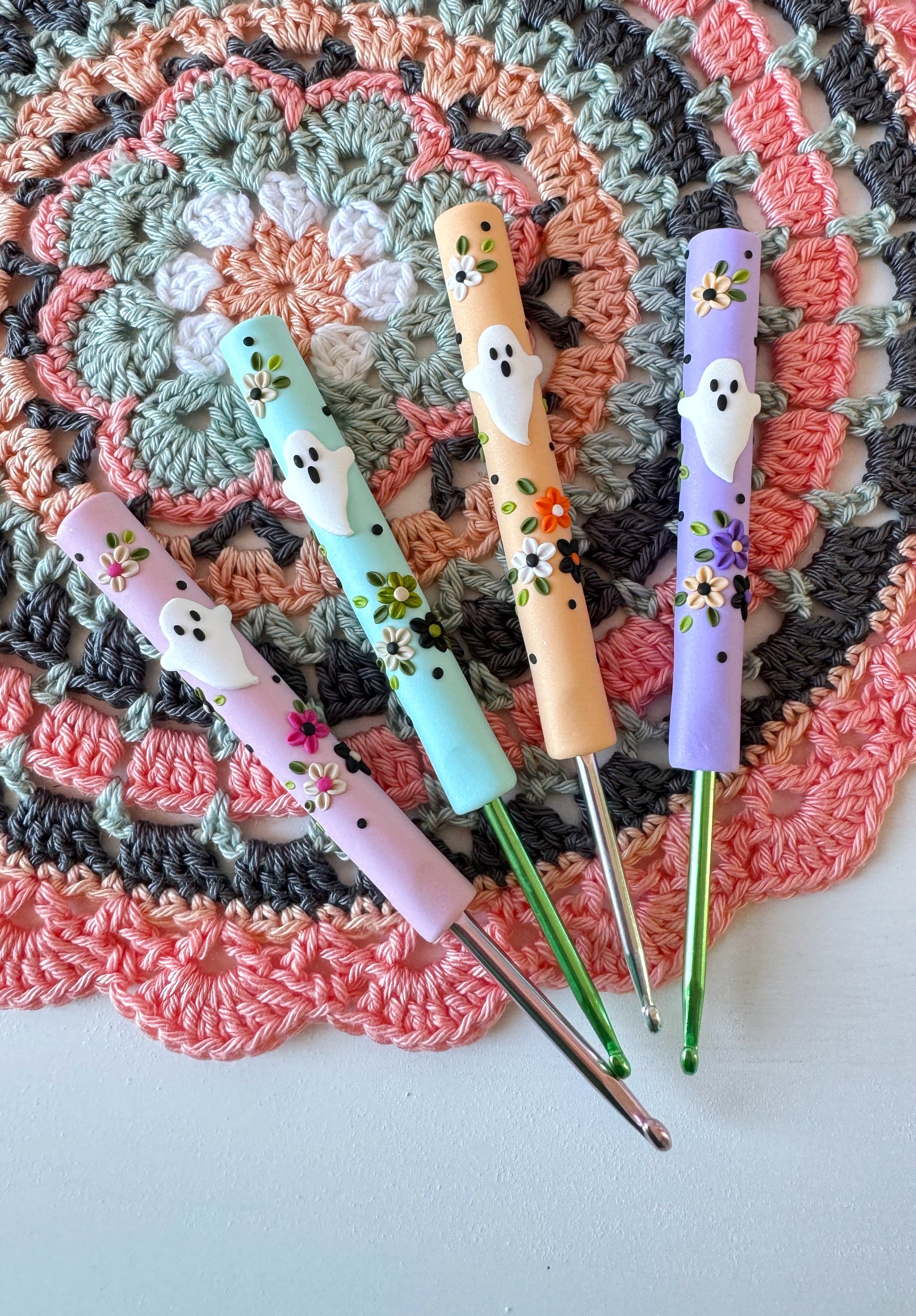 Available in a range of pastel shades, these polymer Clay crochet hooks feature a little kawaii ghost surrounded by my signature hand shaped flowers and dots. This listing is for one crochet hook, choose your colour from the dropdown menu.