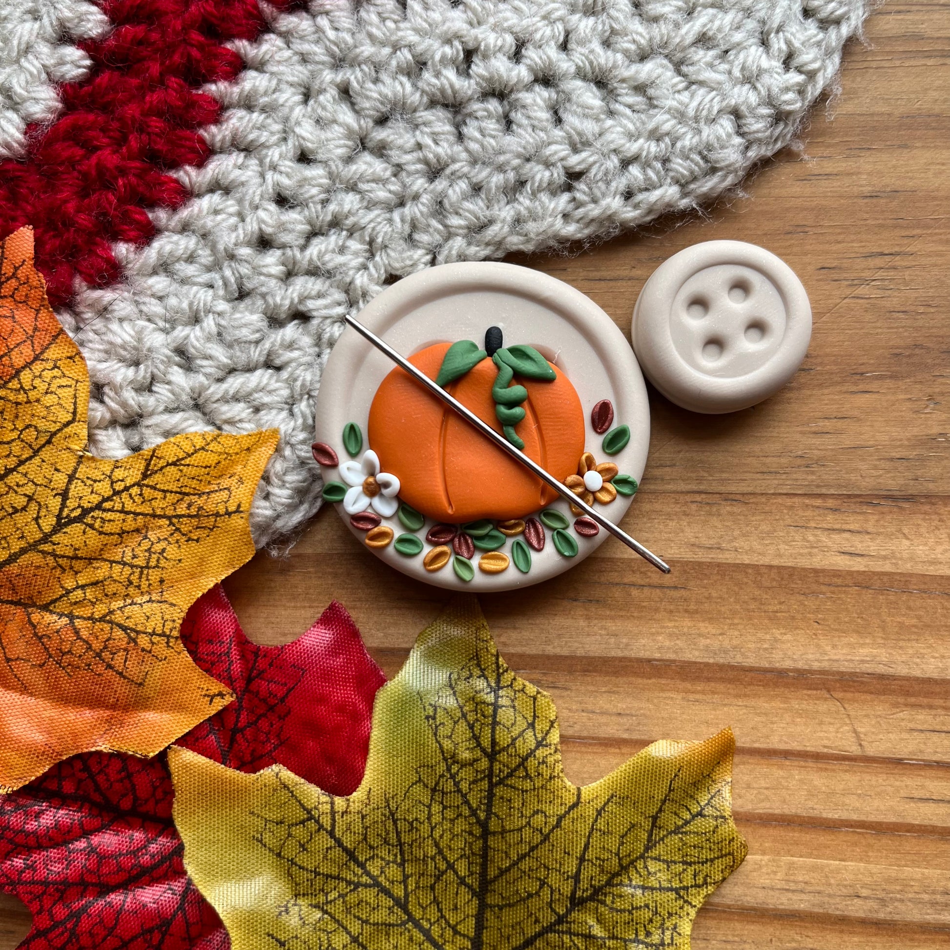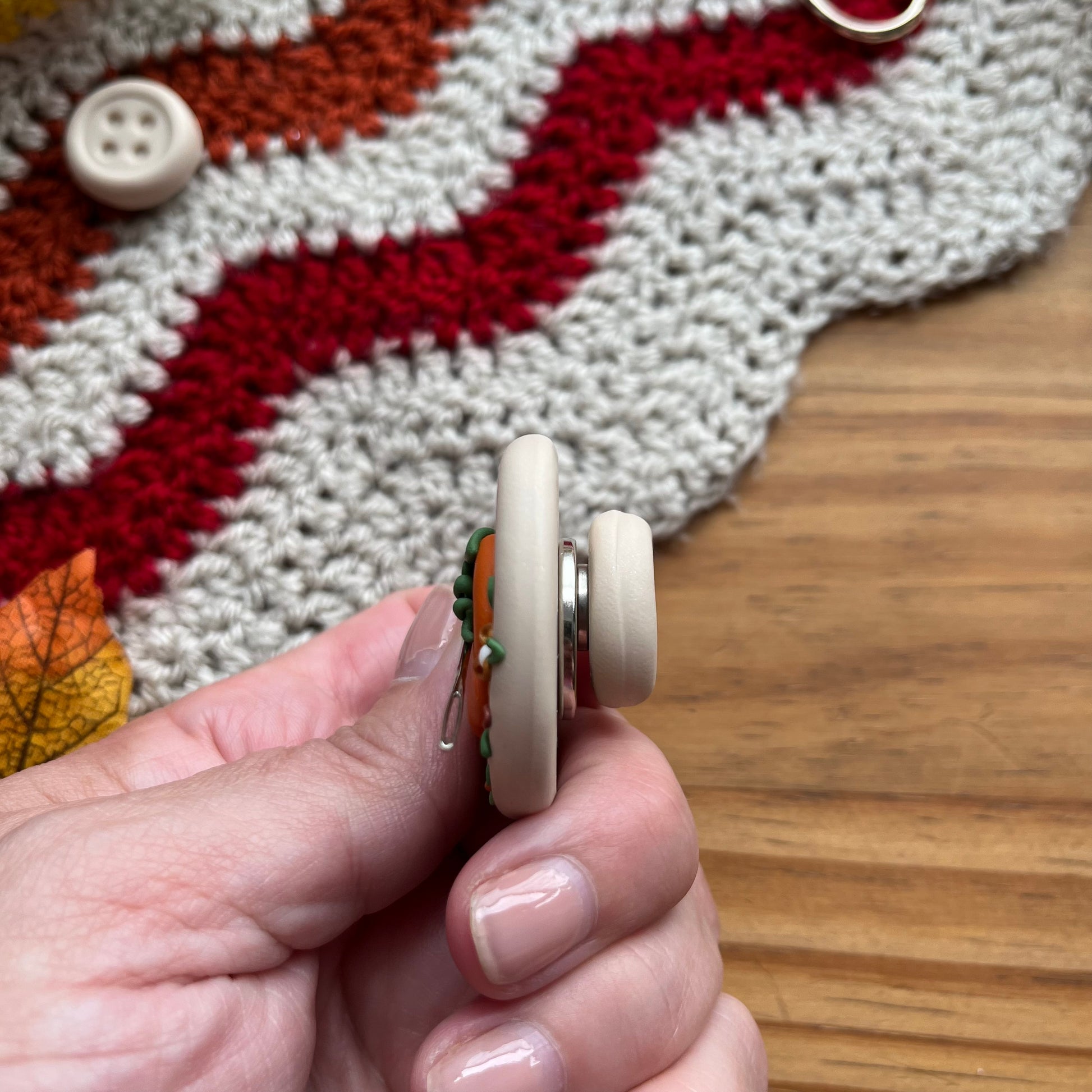 This one is perfect for autumn projects with a cute hand shaped pumpkin and pretty autumn leaves on my 2” button base. Each one is entirely handmade and so no two are exactly the same.